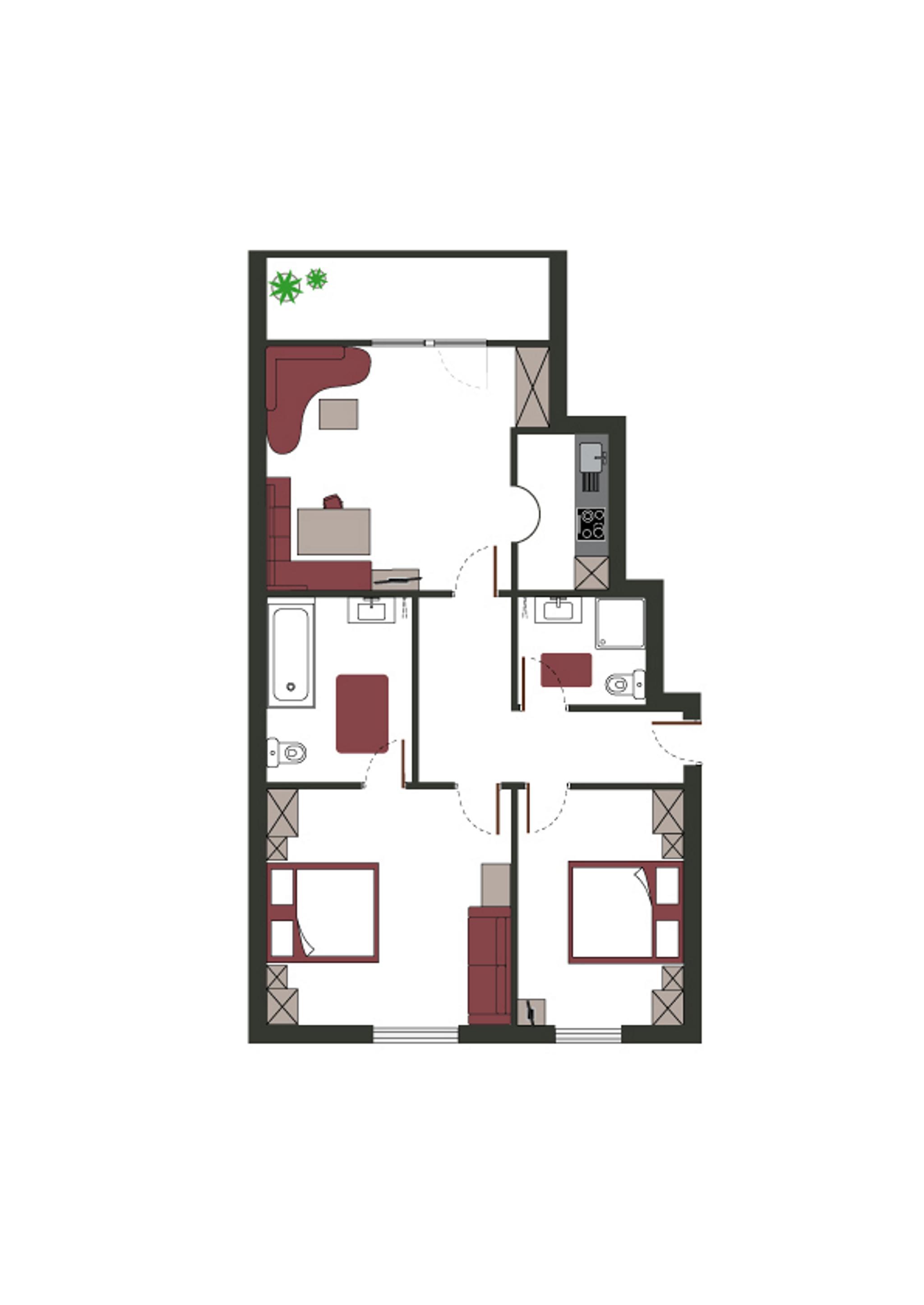 Bei einer Belegung mit 2-3 Personen steht nur 1 Schlafzimmer und 1 Badezimmer zur Verfügung. das heißt es ist dann ident mit dem Typ Alpenrose.