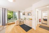 Die Innenausstattung der Wohnung wurde mit Bedacht gewählt, um Ihnen einen sorgenfreien Aufenthalt zu garantieren. Neben einer vollständig eingerichteten Küche, die sowohl eine Filter- als auch eine Kapsel-Kaffeemaschine bereithält, finden Sie hier auch eine Spülmaschine, um Ihnen die Hausarbeit zu erleichtern. Für Ihre Unterhaltung und weiteren Komfort ist die Wohnung mit einem Ventilator ausgerüstet. Eine Waschmaschine zur gemeinschaftlichen Nutzung steht ebenso zur Verfügung, um Ihnen längere Aufenthalte so komfortabel wie möglich zu machen.