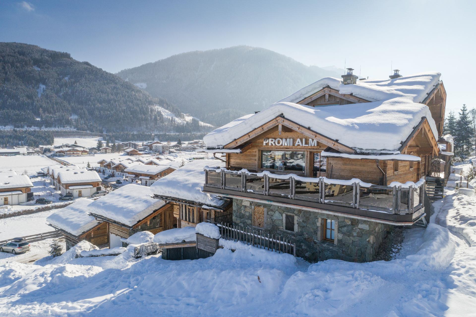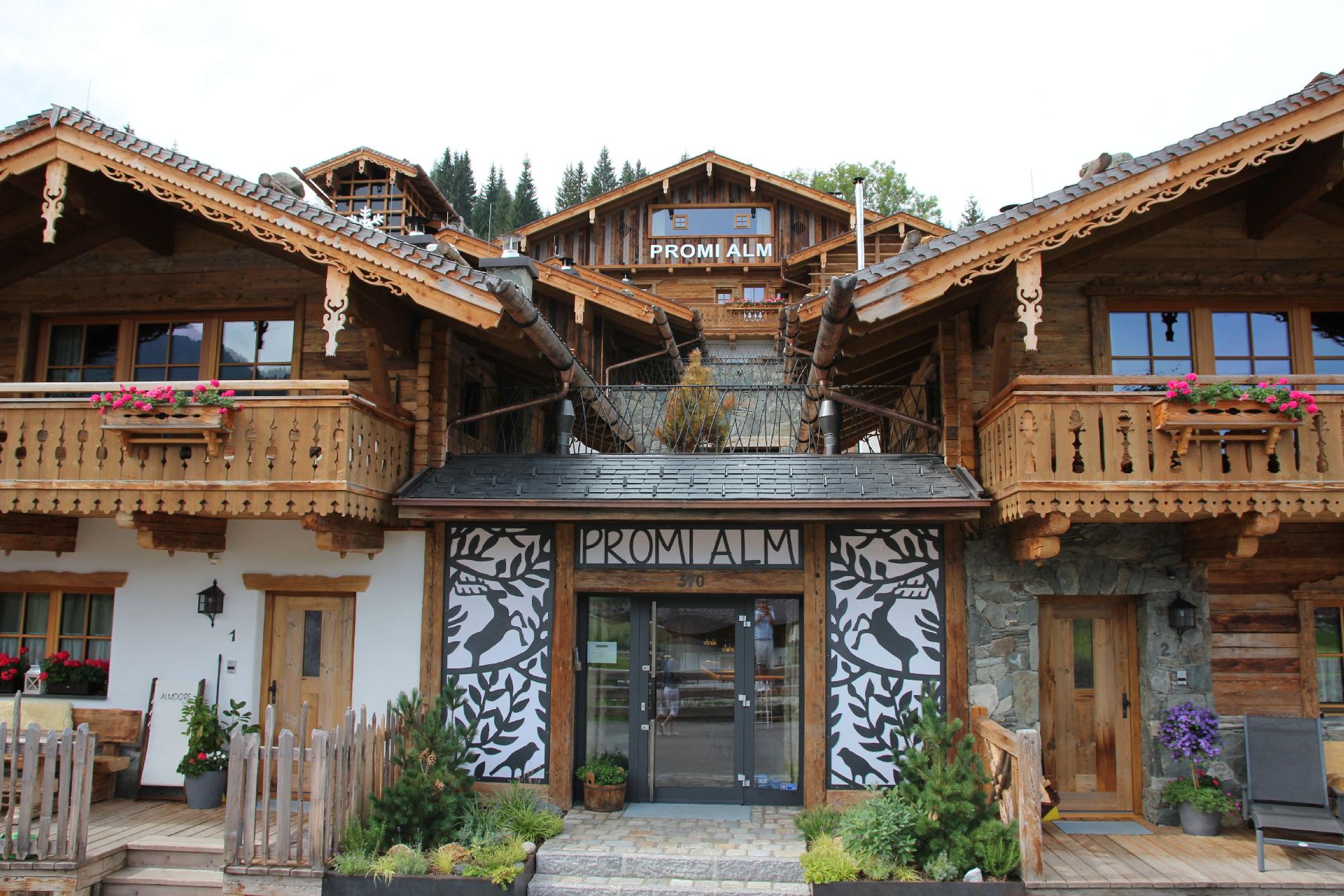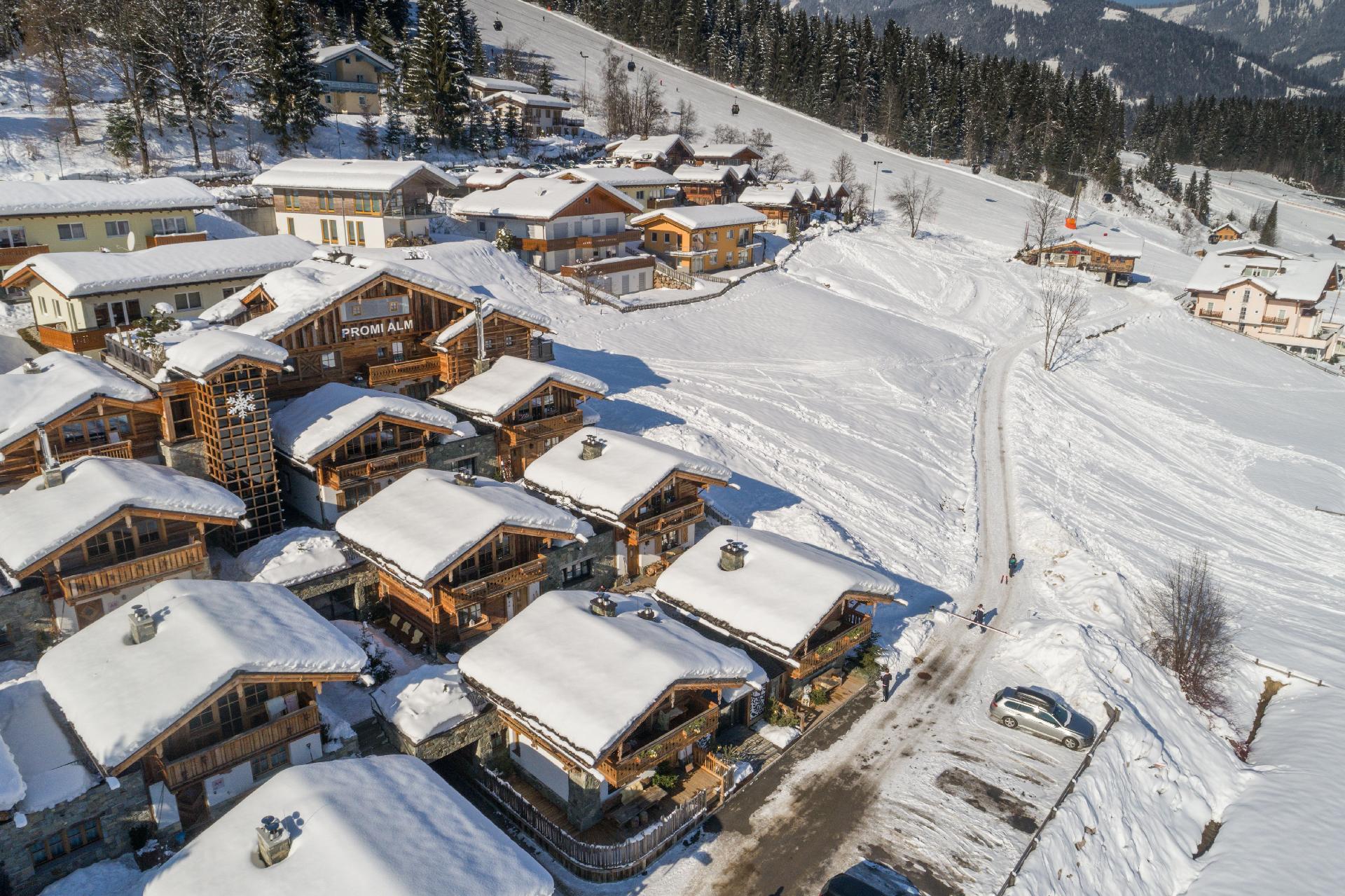 Die Promi-Alm befindet sich in leichter Hanglage mit herrlichem Ausblick auf die umliegende Bergwelt (Dachstein, Bischofsmütze…) und den Ort Flachau und ist mit dem Auto bequem zu erreichen (ausreichend Parkplätze gibt es bei den Chalets bzw. in der Parkgarage).