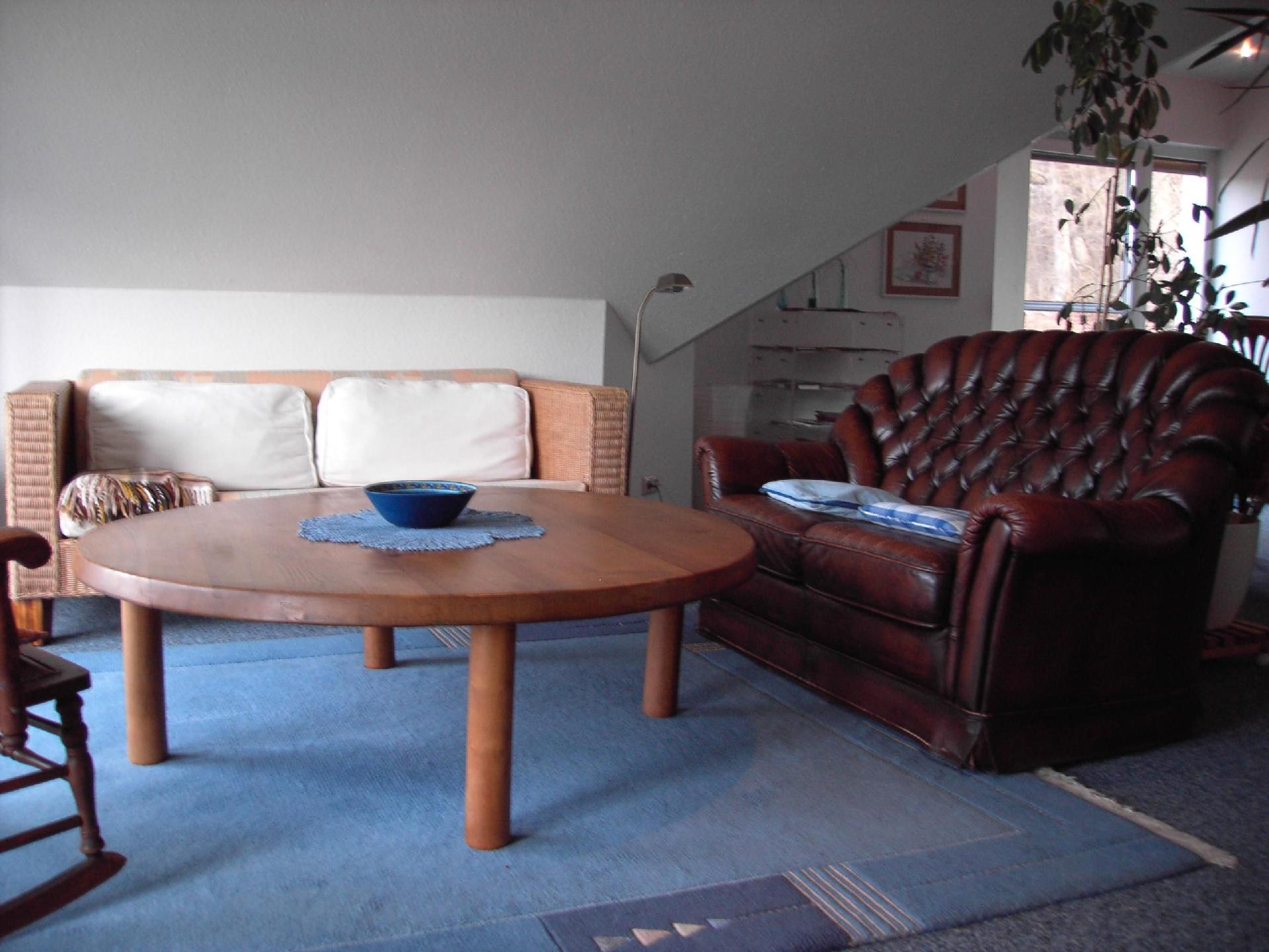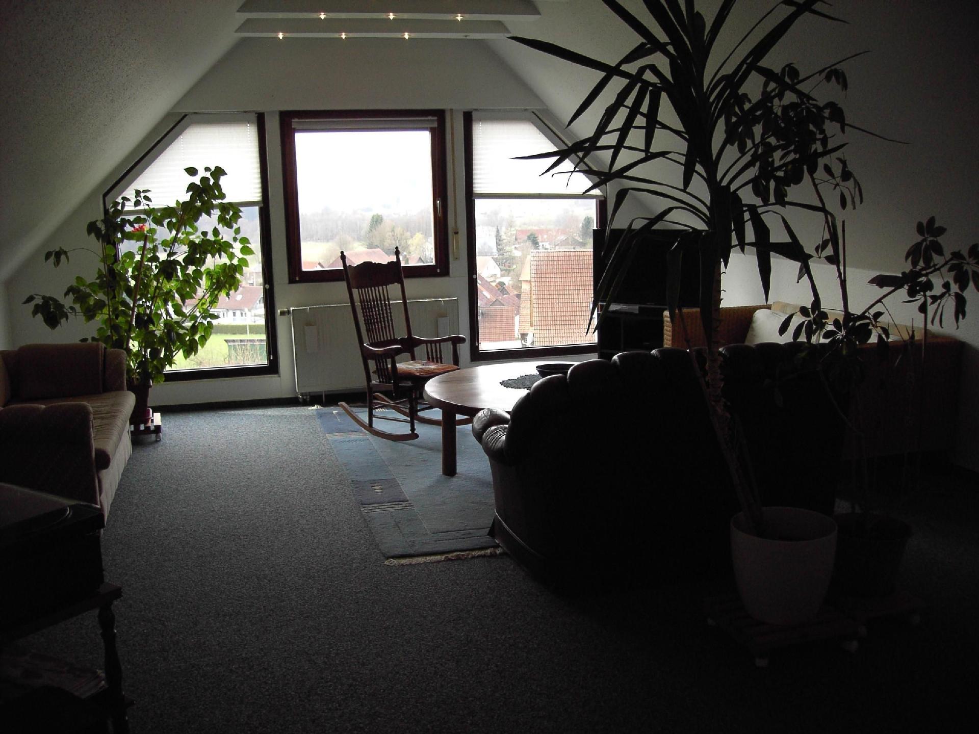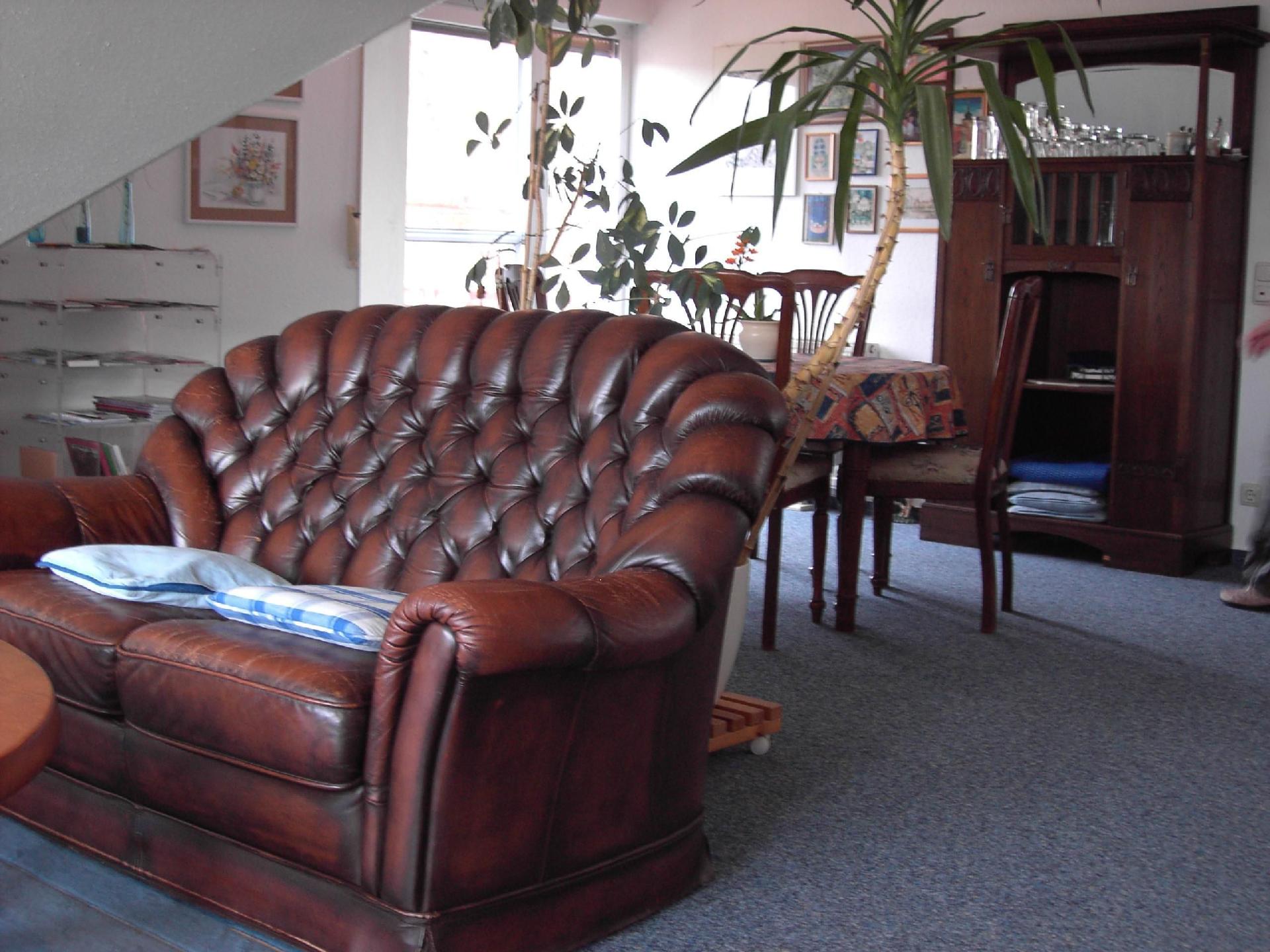 Die DG-Wohnung bietet Ihnen 60 qm und große Dach-Terrasse (36 qm) mit weitem freien Blick. Der Wohnbereich ist mit einer Küchenzeile mit Mikrowelle, Herd mit vier Platten, Kühlschrank mit Gefrierfach, Wasserkocher, Kaffeemaschine, Esstisch mit vier Stühlen, Sitzecke mit ausziehbarem Sofa (Das Schlafsofa ist für einen Erwachsenen oder zwei Kinder vorgesehen.) und Radio, Plattenspieler, Flachbild-TV und Teppichboden ausgestattet. Das Schlafzimmer hat ein Doppelbett, Kleiderschrank, Kofferablage, Sessel. Bad mit Dusche und WC.