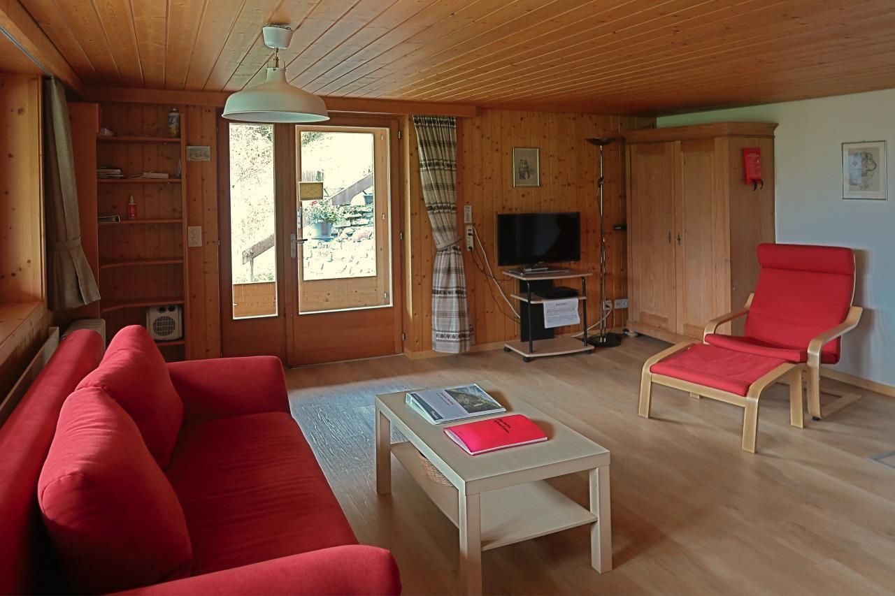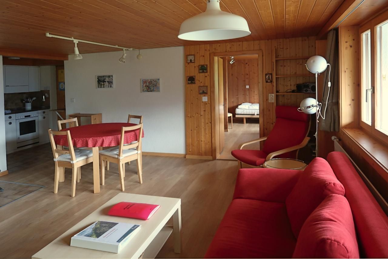 Die kinderfreundliche 2-Zimmerwohnung ist im Erdgeschoss eines typischen Berner Oberländer Chalets. Die Wohnfläche berägt 52 m2 plus Veranda,nicht beheizt. Die Wohnung eignet sich für bis zu 4 Personen, auch für Familie mit Kindern. Spielzeuge & Spiele sind vorhanden. Das Wohn/Esszimmer, ca 25 m2, ist mit Satellitenfernsehen und Radio / CD Abspielgerät ausgerüstet, WLAN/wifi Internetzugang ist vorhanden. Die Küche ist mit Elektrokocherd, Backofen, Kühlschrank, Kaffeemaschine Nespressosystem, Mikrowelle, Fondue und Racletteofen sowie dem üblichen Zubehör eingerichtet. Das Schlafzimmer hat ein Doppelbett (160cm breit) sowie 2 Einzelbetten. Im Badezimmer befinden sich Dusche, Lavabo und WC. Im Sommer besteht die Möglichkeit den Gartensitzplatz mit zu benutzen. Ein Privatparkplatz steht zu Verfügung. Die Mietdauer beträgt zu allen Jahreszeiten mindestens 7 Nächte (1 Woche)