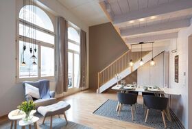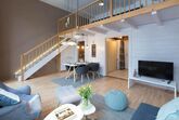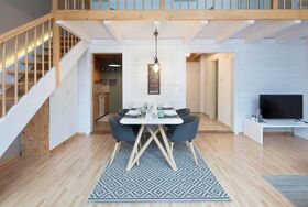 Henrik, Loft-Wohnung, 1-Zimmer-Wohnung 68 m2 auf 2 Ebenen. Objekt geeignet für 2 Erwachsene + 2 Kinder. Geräumig und hell, teilweise renoviert im Jahr 2018, moderne und geschmackvolle Einrichtung: großes Wohn- / Esszimmer, Ausgang zum Balkon. Küche 6 m2 (Bad / WC. Elektrische Heizung. Obergeschoss: offene große Galerie mit 2 französischen Betten (2 x 140 cm, Länge 200 cm). Reservierter Parkplatz auf dem Gelände, nur für Nichtraucher. Rauchmelder. Renoviertes Bad und Küche (2024)