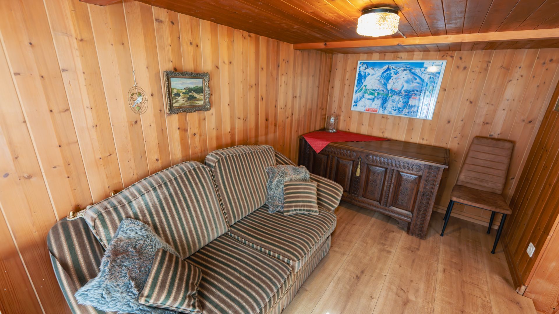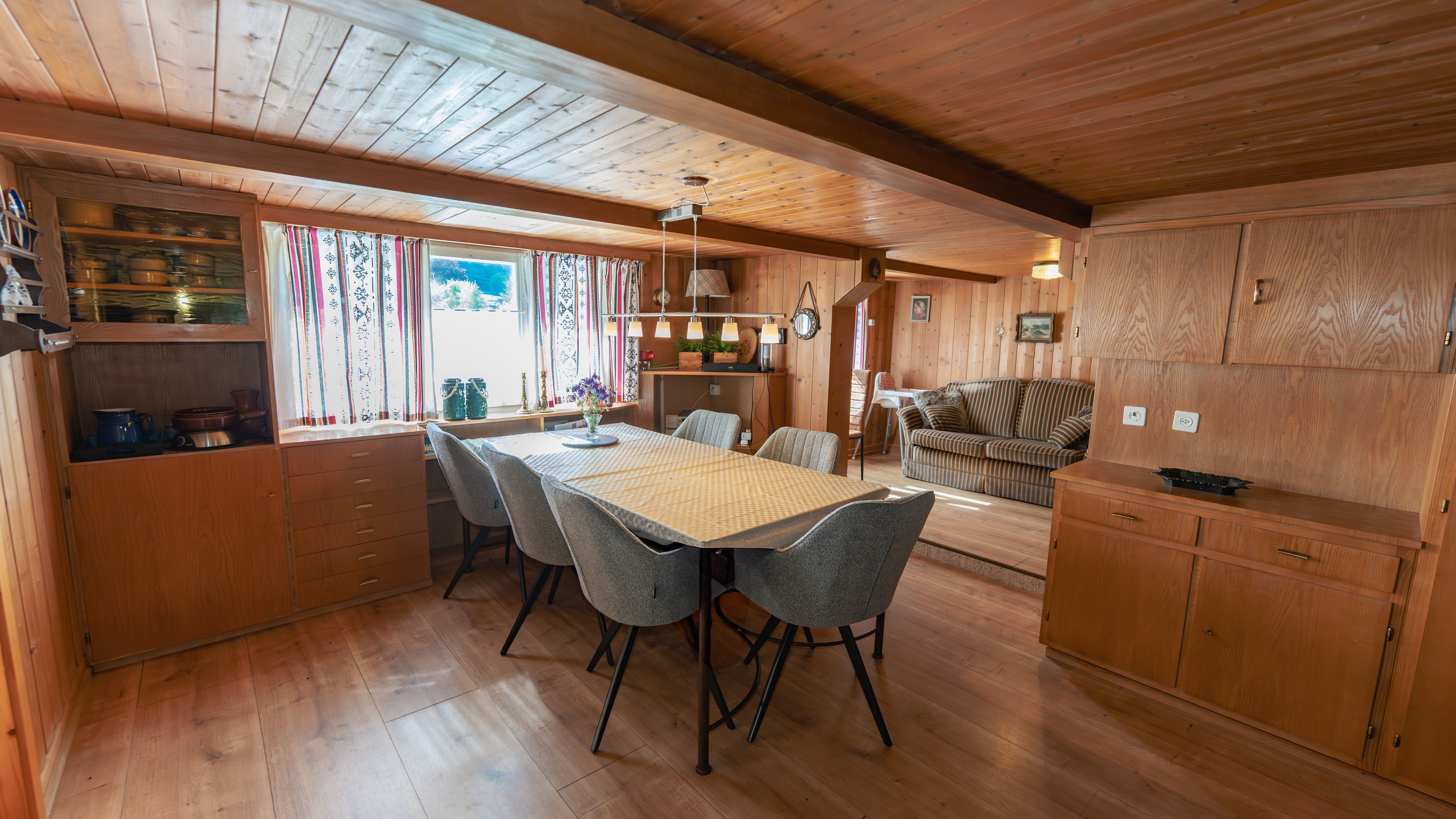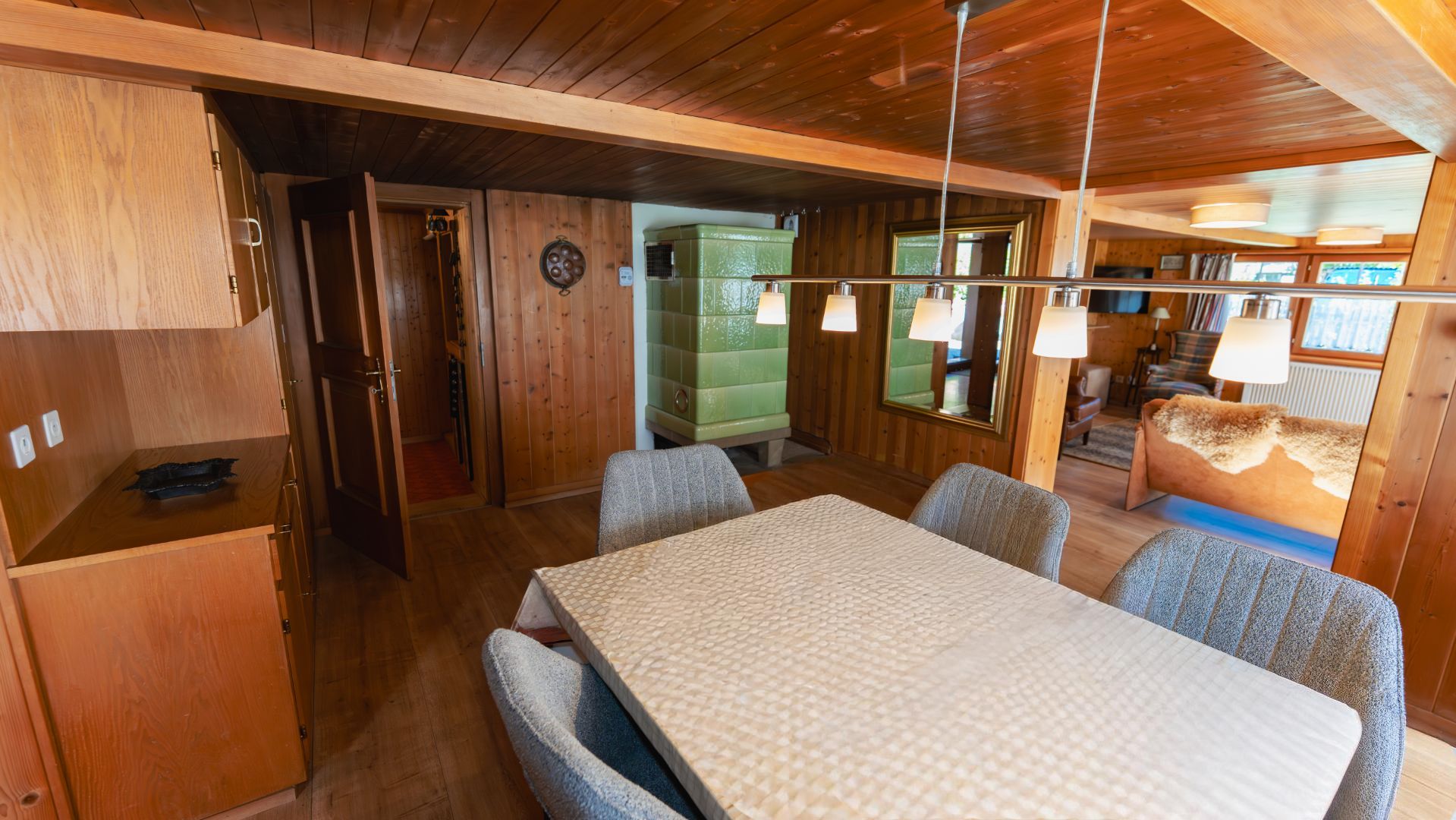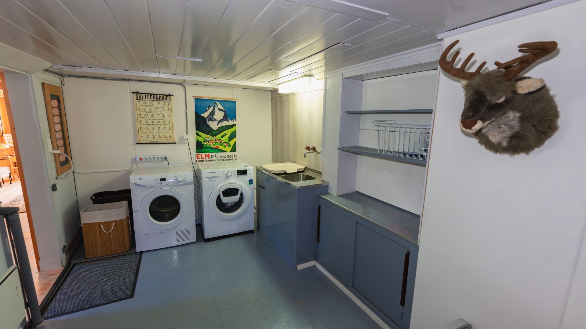 Grundriss: Unten: Flur, Küche mit Essecke (4 P.), Kühlschrank, Gefrierschrank, Herd, Geschirrspüler und Holzofen. Wohnzimmer in drei Teilen, Wohnzimmer, Esszimmer und Nebenraum. Sie sind miteinander verbunden. Im hinteren Teil: 2 Sofas und 2 Sessel, großer Fernseher und Bücherregale mit Büchern aller Art. Im mittleren Teil: Esstisch mit Platz für 8 Personen. Im Seitenteil: separater kleiner (Spiel-/DVD-)Fernseher und Sofa. Flur, Hauswirtschaftsraum mit Küchenzeile, Waschmaschine und Wäschetrockner und viel Platz zum Aufhängen/Trocknen von Skikleidung, Badezimmer mit Toilette, Dusche und Waschbecken.