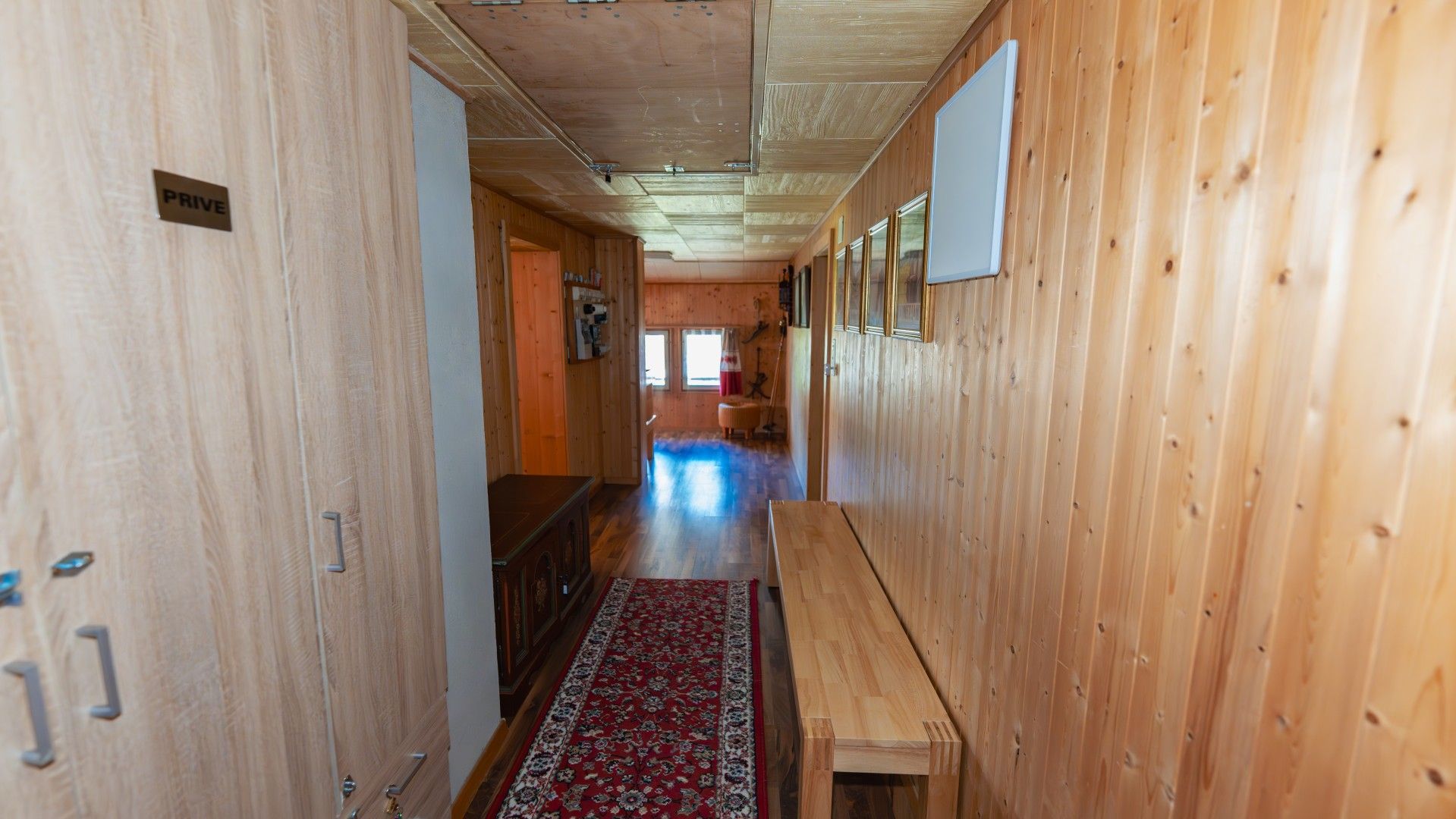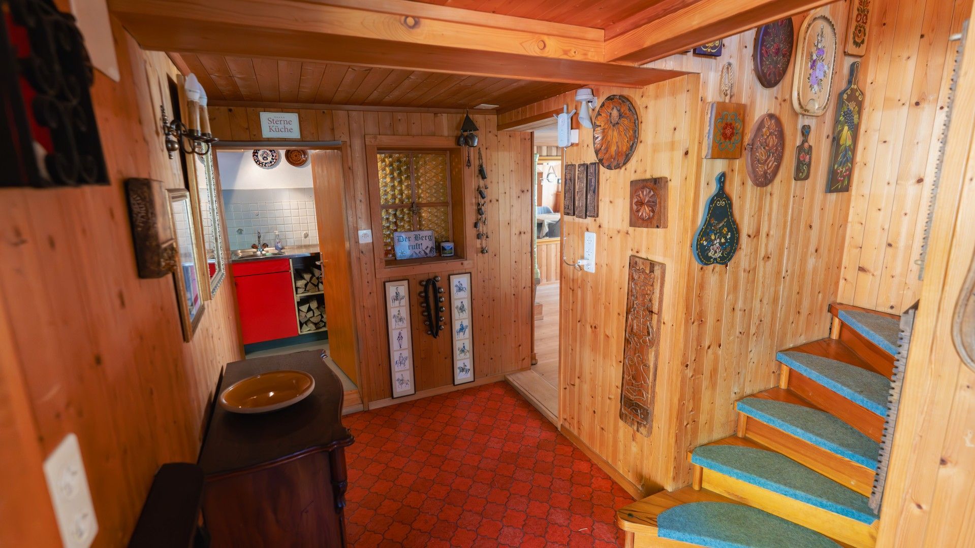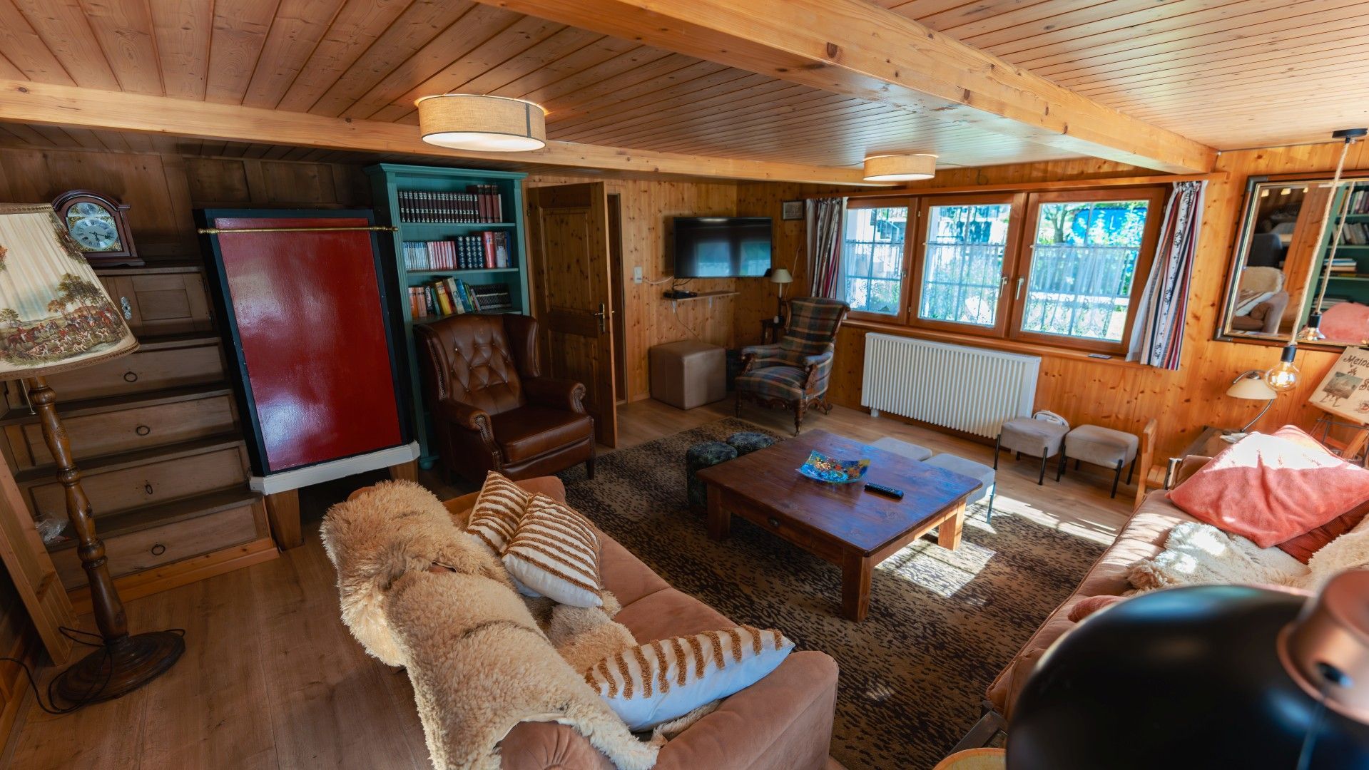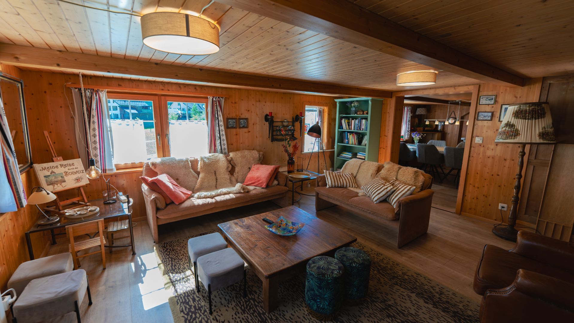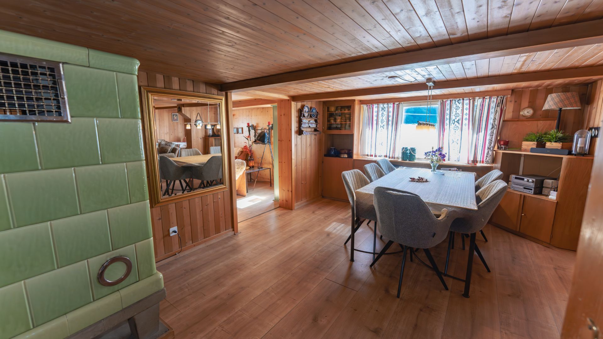 Grundriss: Unten: Flur, Küche mit Essecke (4 P.), Kühlschrank, Gefrierschrank, Herd, Geschirrspüler und Holzofen. Wohnzimmer in drei Teilen, Wohnzimmer, Esszimmer und Nebenraum. Sie sind miteinander verbunden. Im hinteren Teil: 2 Sofas und 2 Sessel, großer Fernseher und Bücherregale mit Büchern aller Art. Im mittleren Teil: Esstisch mit Platz für 8 Personen. Im Seitenteil: separater kleiner (Spiel-/DVD-)Fernseher und Sofa. Flur, Hauswirtschaftsraum mit Küchenzeile, Waschmaschine und Wäschetrockner und viel Platz zum Aufhängen/Trocknen von Skikleidung, Badezimmer mit Toilette, Dusche und Waschbecken.