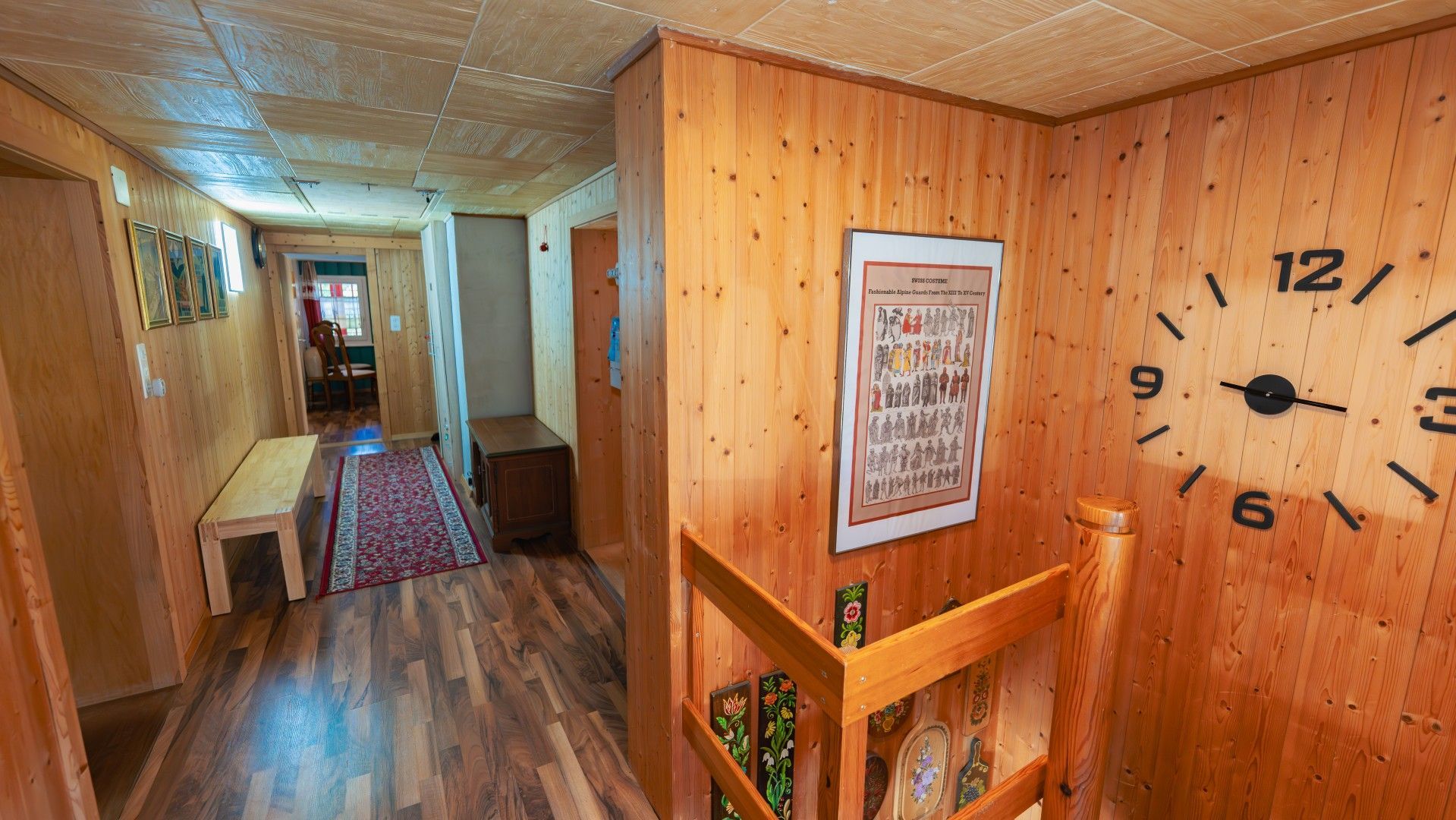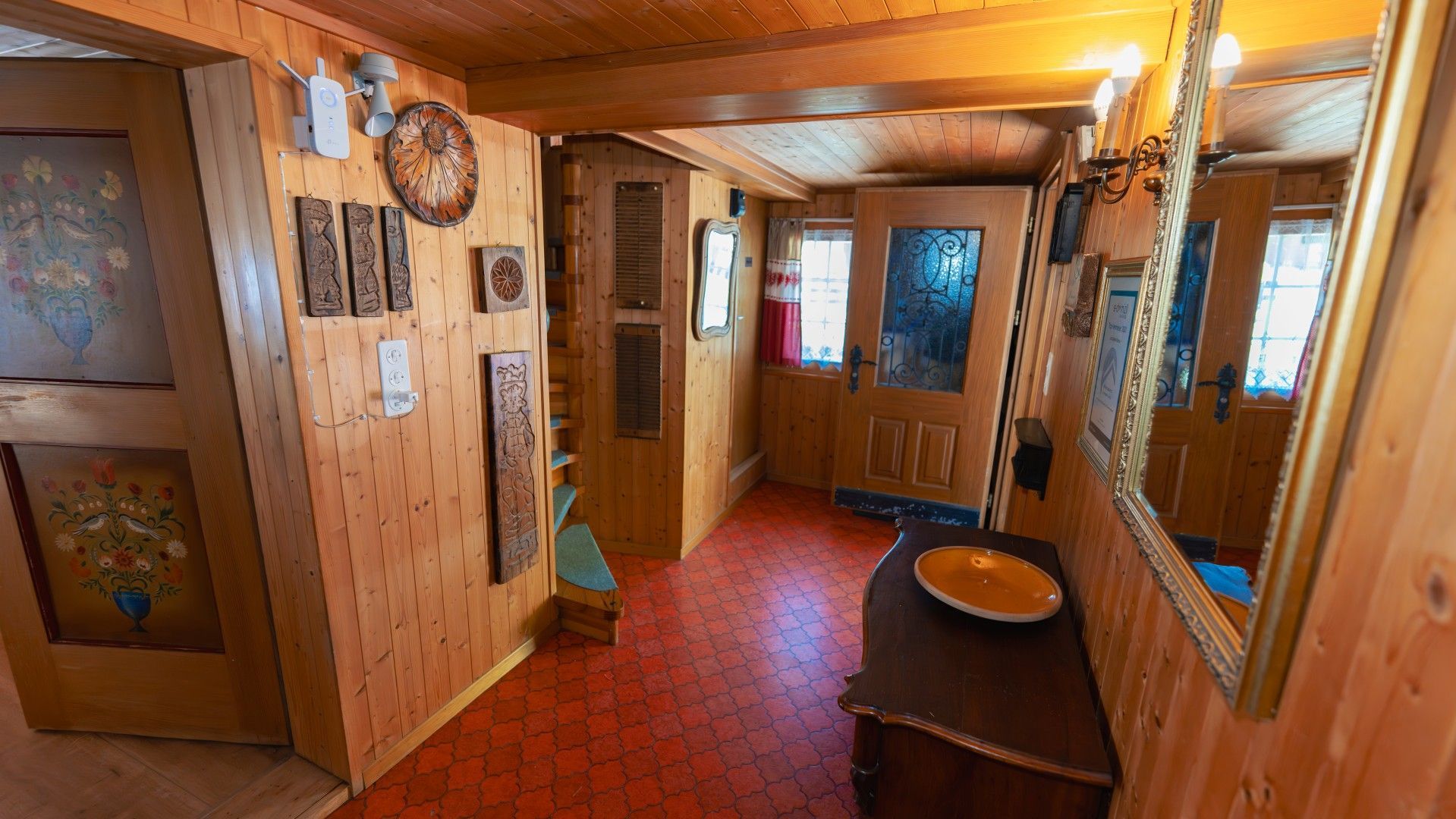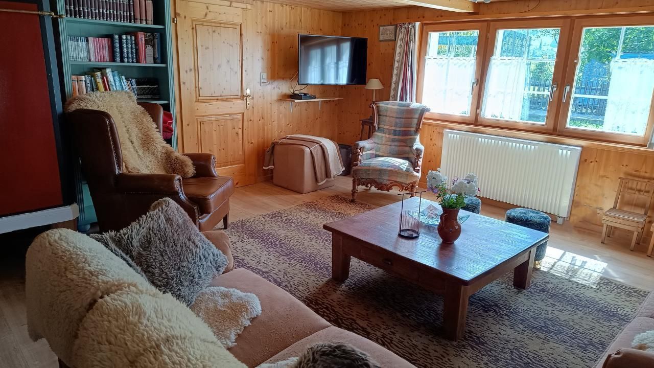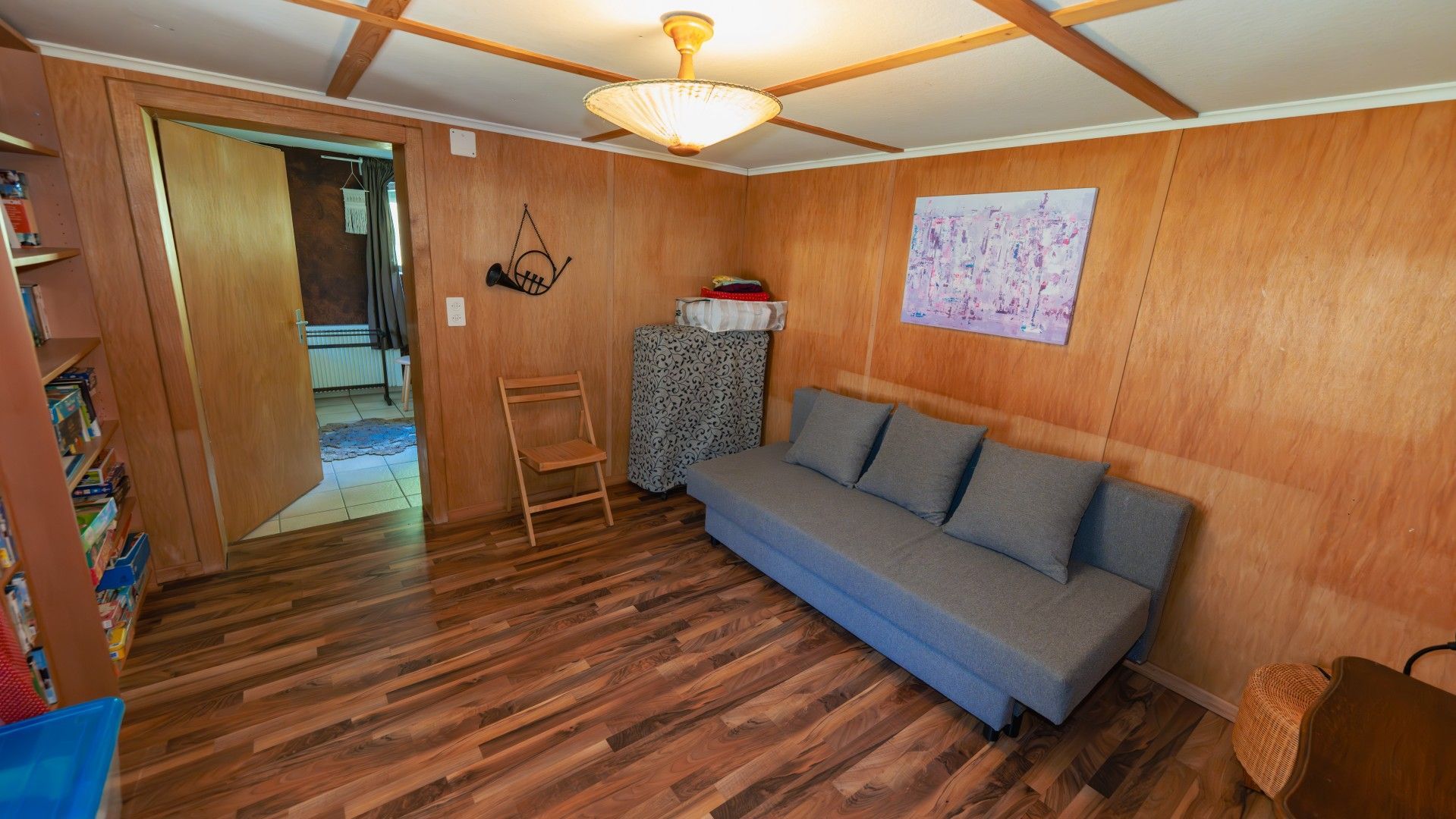 Grundriss: Unten: Flur, Küche mit Essecke (4 P.), Kühlschrank, Gefrierschrank, Herd, Geschirrspüler und Holzofen. Wohnzimmer in drei Teilen, Wohnzimmer, Esszimmer und Nebenraum. Sie sind miteinander verbunden. Im hinteren Teil: 2 Sofas und 2 Sessel, großer Fernseher und Bücherregale mit Büchern aller Art. Im mittleren Teil: Esstisch mit Platz für 8 Personen. Im Seitenteil: separater kleiner (Spiel-/DVD-)Fernseher und Sofa. Flur, Hauswirtschaftsraum mit Küchenzeile, Waschmaschine und Wäschetrockner und viel Platz zum Aufhängen/Trocknen von Skikleidung, Badezimmer mit Toilette, Dusche und Waschbecken.