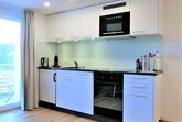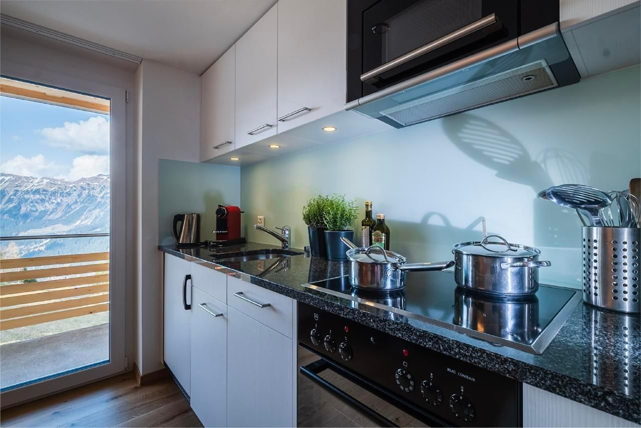 Die perfekt ausgestattete Küche lässt keine Wünsche offen. Geschirrspüler, Mikrowellengerät, Kühlschrank mit Tiefkühlfach und moderner Kochherd mit Backofen bieten alles, was unsere Gäste benötigen, um sich selbst zu verpflegen. Eine Nespresso-Kaffeemaschine, Toaster und Fonduegechirr sind vorhanden.