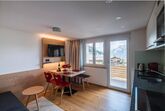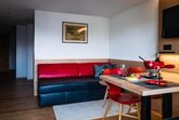 Im Wohnraum erwartet Sie ein bequemes Ledersofa und ein HD-TV-Gerät mit Radioempfang. WLAN steht kostenfrei zur Verfügung. Am Esstisch haben bequem 4 Personen Platz und können die Aussicht auf die Berge geniessen.