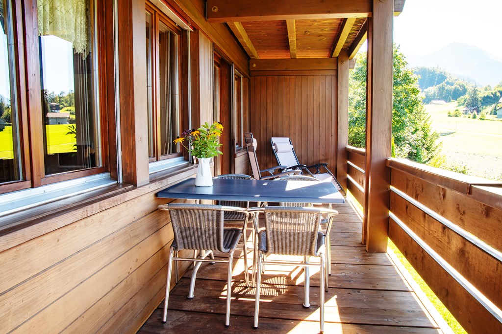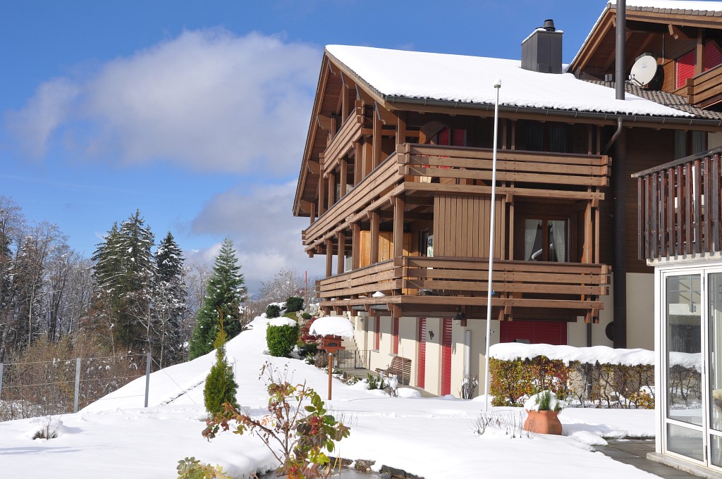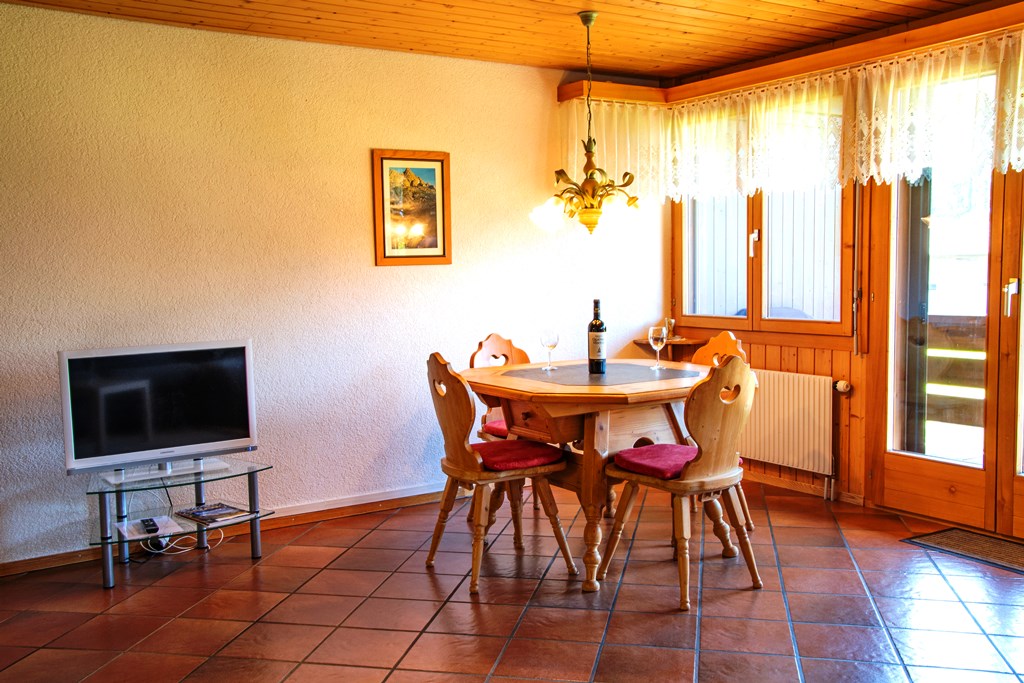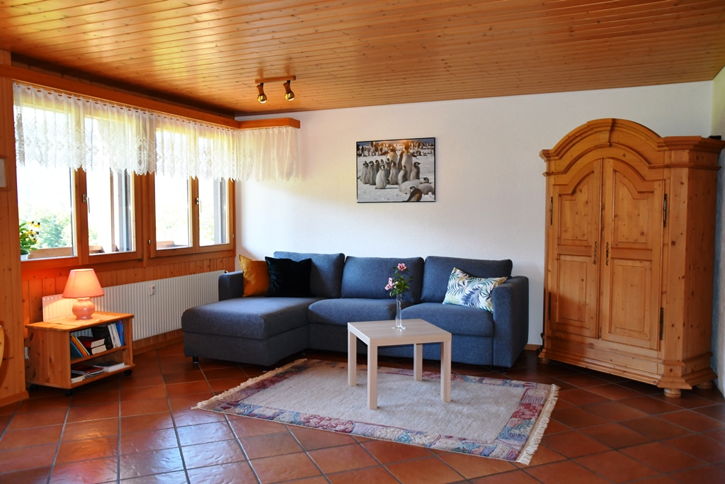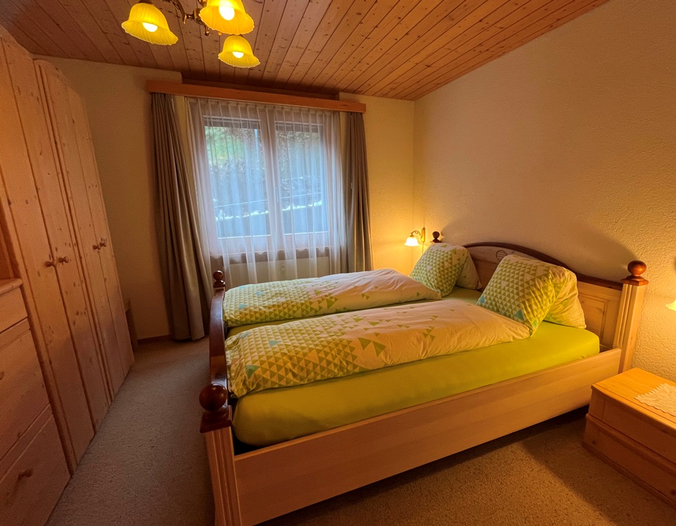 Die 2 ½ - Zimmer Ferienwohnung im Mehrfamilienhaus liegt im 1. Stock (erste Balkonebene). Sie ist rustikal, gemütlich und grosszügig eingerichtet. Stube und Küche sind durch eine Bar getrennt. Die Küche ist sehr gut ausgestattet (auch mit Backofen, Abwaschmaschine, Toaster, Nespresso- sowie Filter Kaffee- Maschine). Die Stube mit Essecke und grosser Sofaecke laden zum gemütlichen Verweilen ein. Diverse Spiele, Bücher und Fernseher sind dazu vorhanden. Die Nasszelle ist mit Dusche, WC und Lavabo ausgerüstet. Das Schlafzimmer, mit einem Doppelbett, liegt auf der hinteren Seite der Wohnung und ist sehr stilvoll mit Holzmöbeln möbliert. Als zusätzliche Schlafgelegenheit kann im Wohnzimmer das Sofa zu einem Bett für 2 Personen umgewandelt werden.
