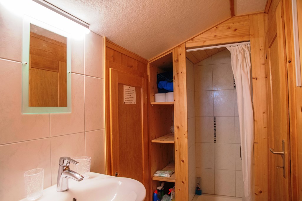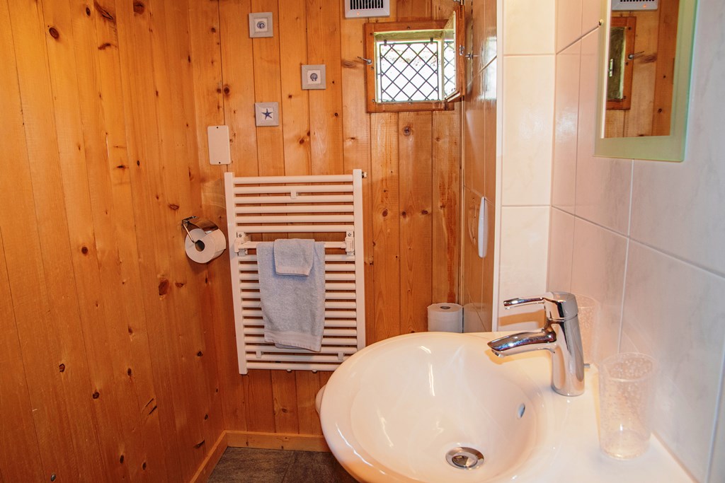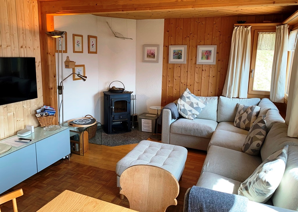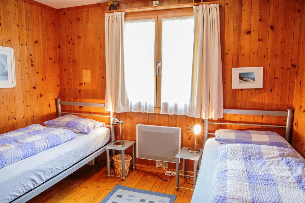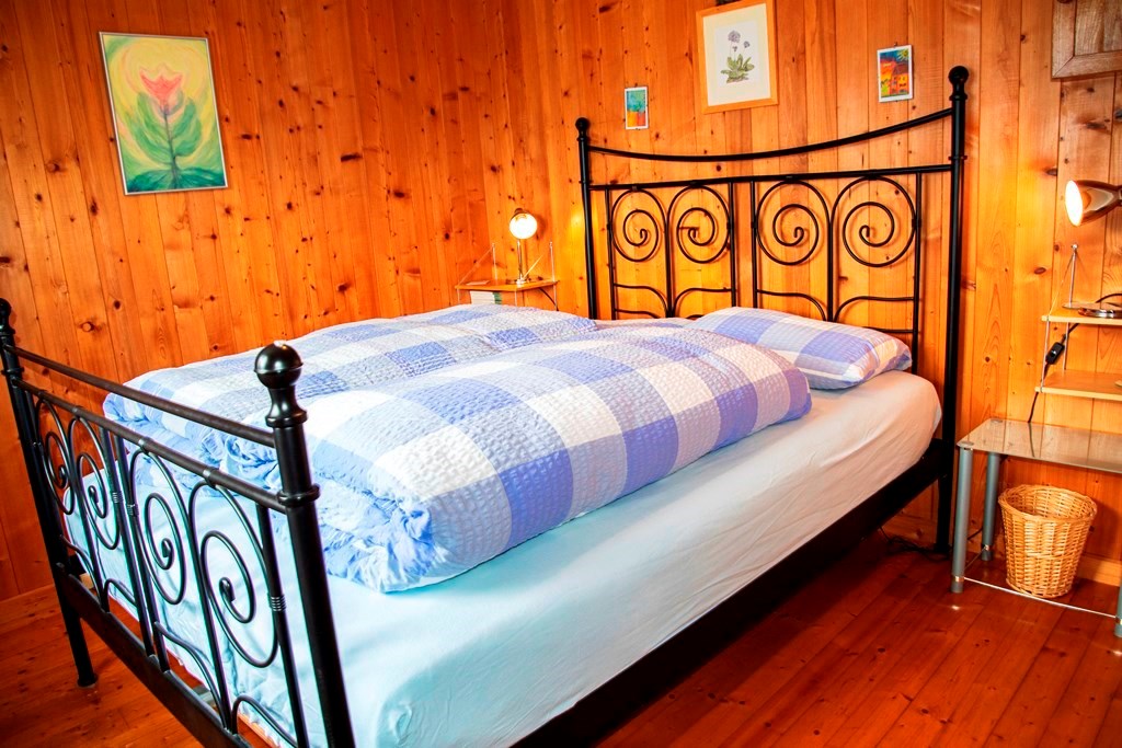 Ausserhalb vom Haus führt eine Holztreppe in das obere Stockwerk direkt in einen offenen Raum mit zwei Einzelbetten in der Dachschräge und einem Sofa. Ein weiteres Schlafzimmer mit einem Doppelbett und ein schmales Badezimmer mit Toilette, Dusche sind ebenfalls auf dieser Etage. Auf beiden Stockwerken sind Fernseher (Satelit und Swisscom TV) sowie W-LAN und auch Spiele und DVD´s vorhanden.