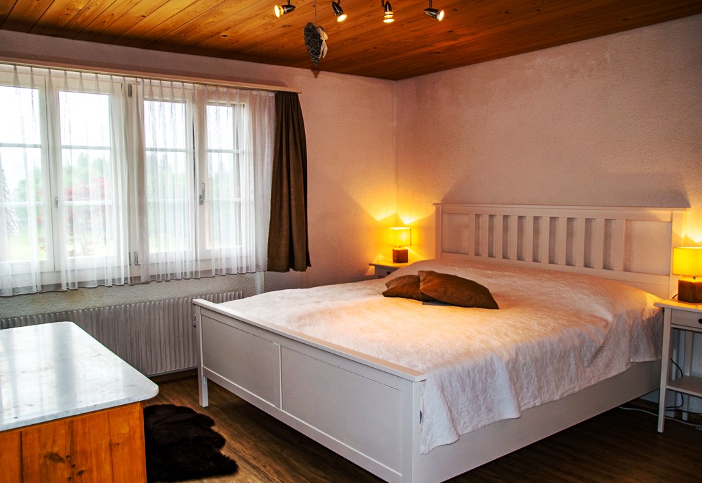 Eine nicht durchgehende Zwischenwand trennt den Schlafbereich vom Wohnraum. Ein grosses Doppelbett entführt Sie in Ihre Traumwelt. Mit dem grossen Schiebetür-Wandschrank ist viel Stauraum vorhanden. Auf Anfrage bei der Eigentümerin kann Waschmaschine und Tumbler mit gebraucht werden.