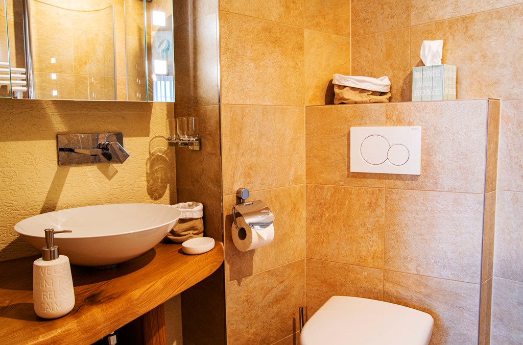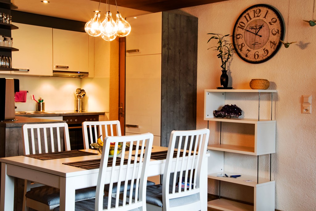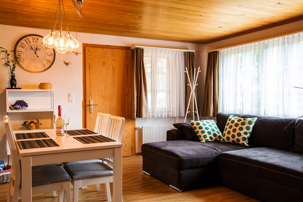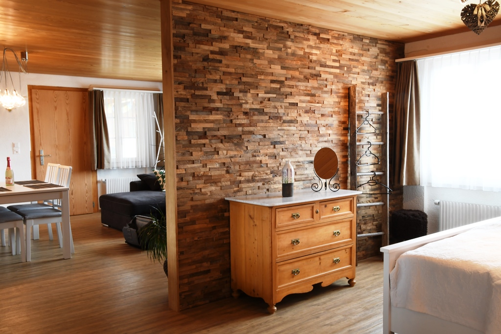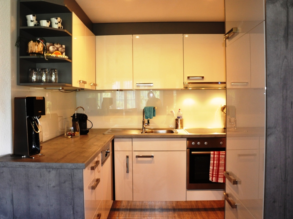 Das Studio Stubeli ist eine kleine aber feine Wohnung und mit allem ausgerüstet was es braucht. Vom Eingang her kommen Sie stufenlos, direkt in den offenen Wohnraum. Ein grosszügiges Sofa lädt ein zum Relaxen oder auch zum Fernsehen. Die Küche liegt rechterhand in einer Nische und ist sehr gut ausgerüstet, um feines auf den Tisch zu zaubern. Vom Backofen über Geschirrspüler, Nespresso Kaffeemaschine, Sodastream usw. ist alles da. Der Esstisch mit 4 Stühlen steht im Wohnraum zwischen Sofa und Küche. Das Badezimmer ist mit einer randlosen Dusche, WC und Lavabo ausgestattet.
