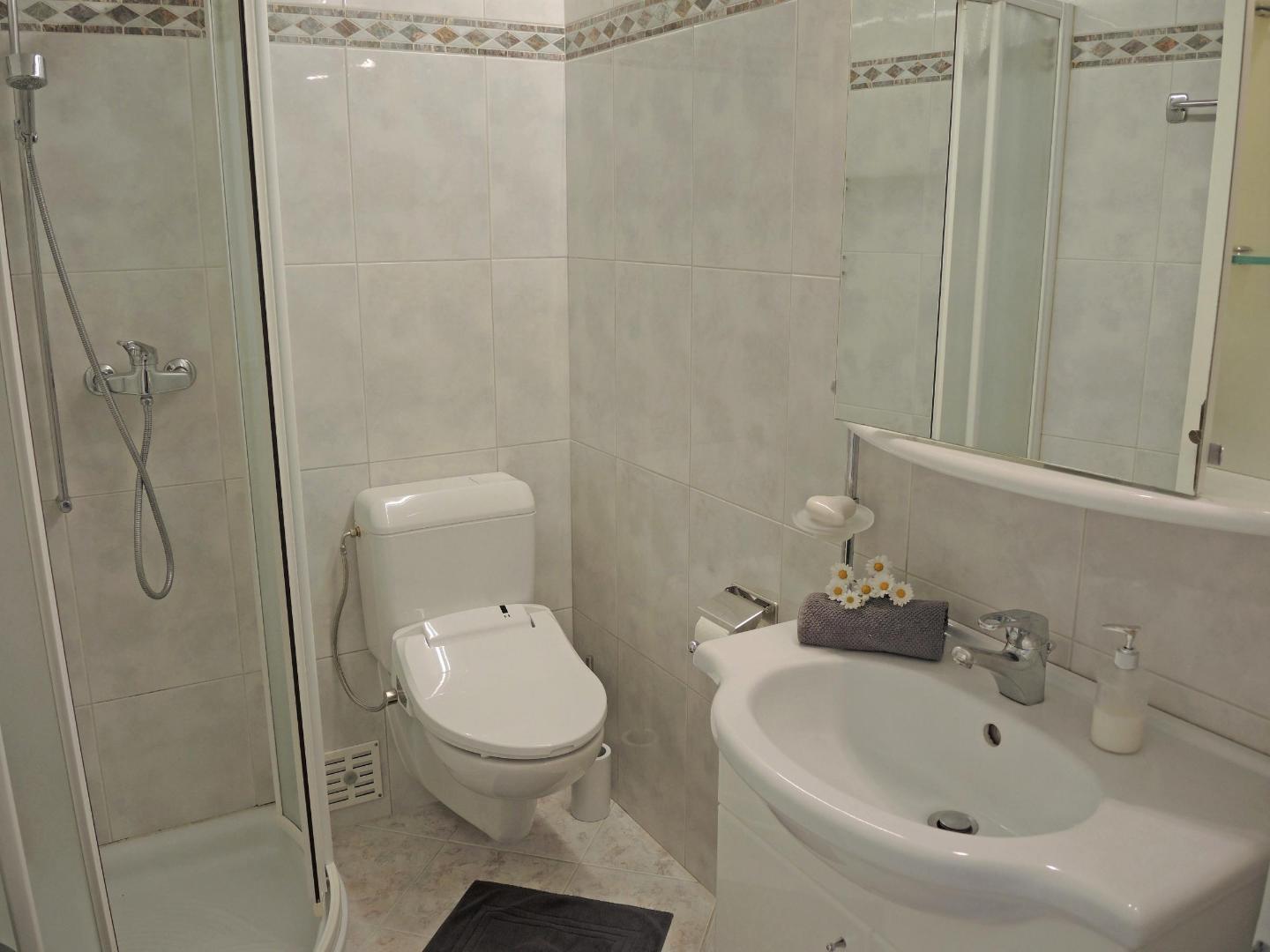• Badezimmer mit Dusche / WC, Waschtisch, Spiegel, Haarföhn