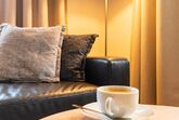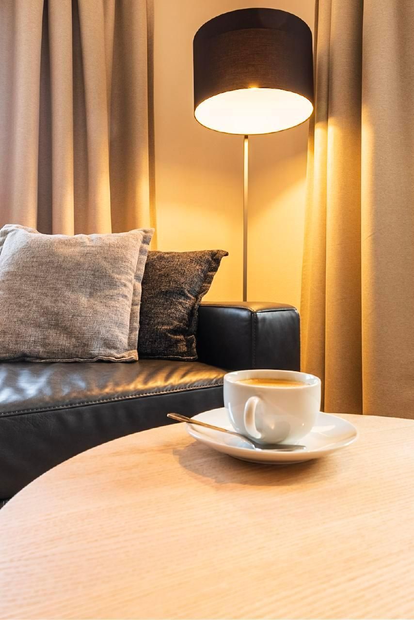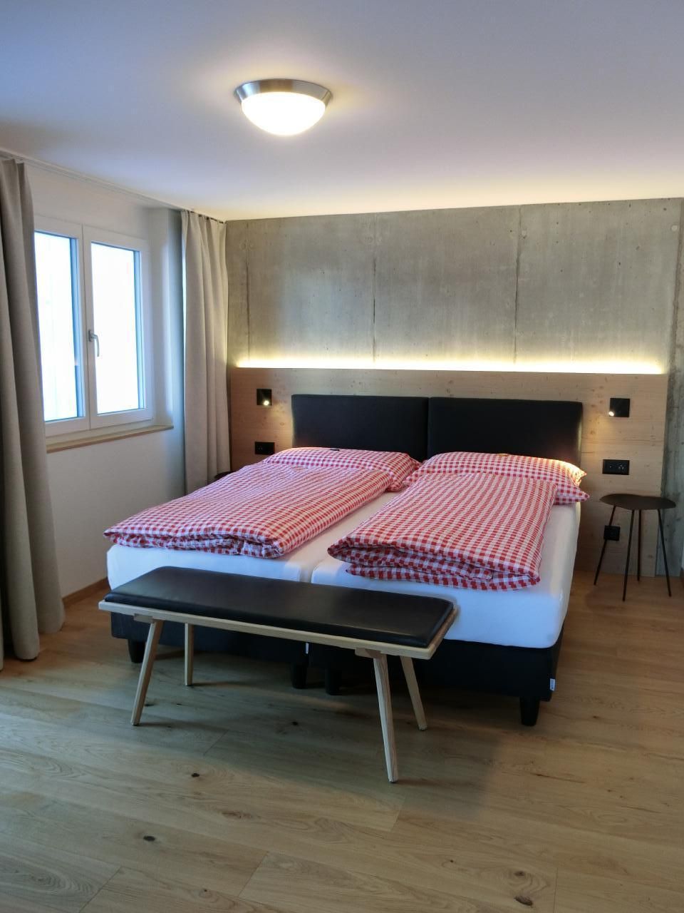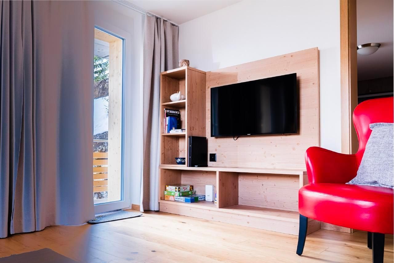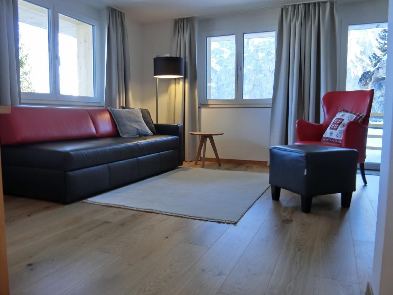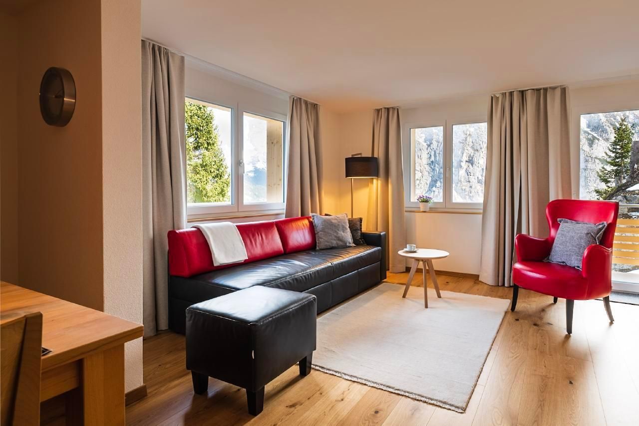 Im geräumigen Wohnraum erwarten Sie ein bequemes Ledersofa und -sessel mit Hocker und ein HD-TV-Gerät mit Radioempfang. WLAN steht kostenfrei zur Verfügung. Von allen Zimmern geniessen Sie Panoramablick auf die Berge.