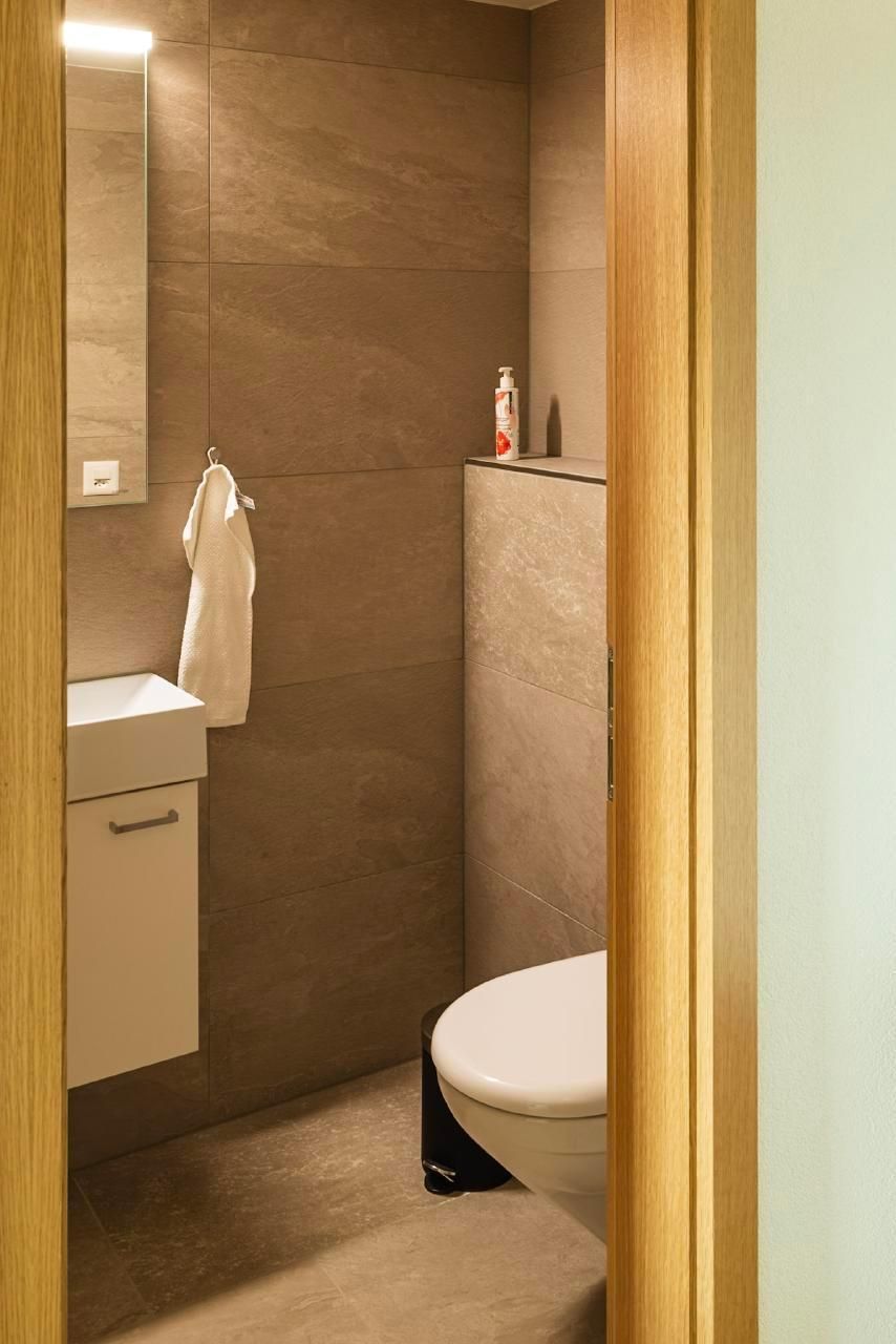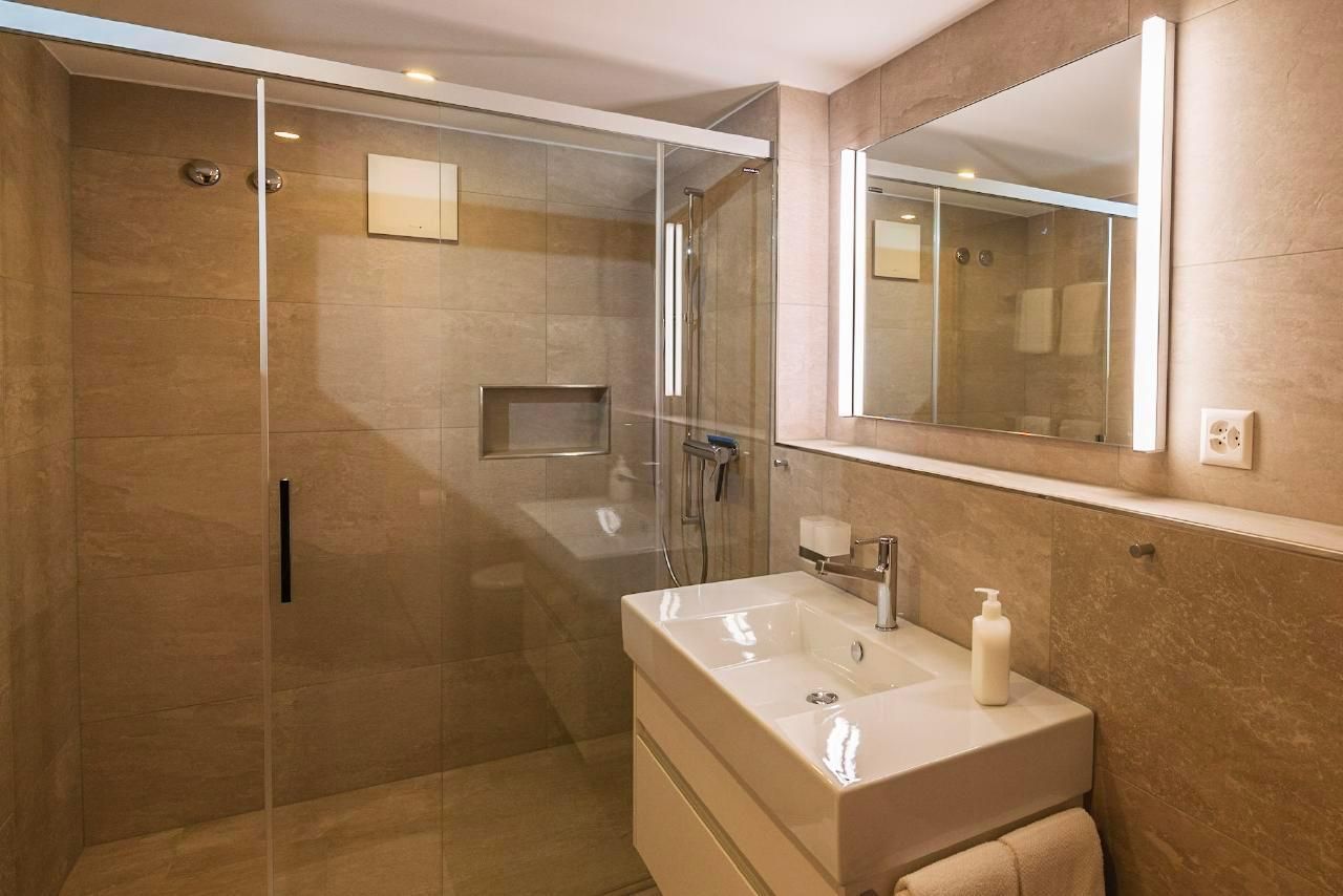 Das geräumige Badezimmer verfügt über eine grosse Dusche mit Glastrennwand, einem Waschtisch mit reichlich Abstellfläche und WC. Ein Haarfön steht unseren Gästen zur Verfügung. Das zusätzliche separate WC ist ideal bei Belegung mit mehr als 2 Personen.