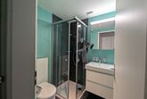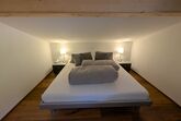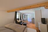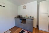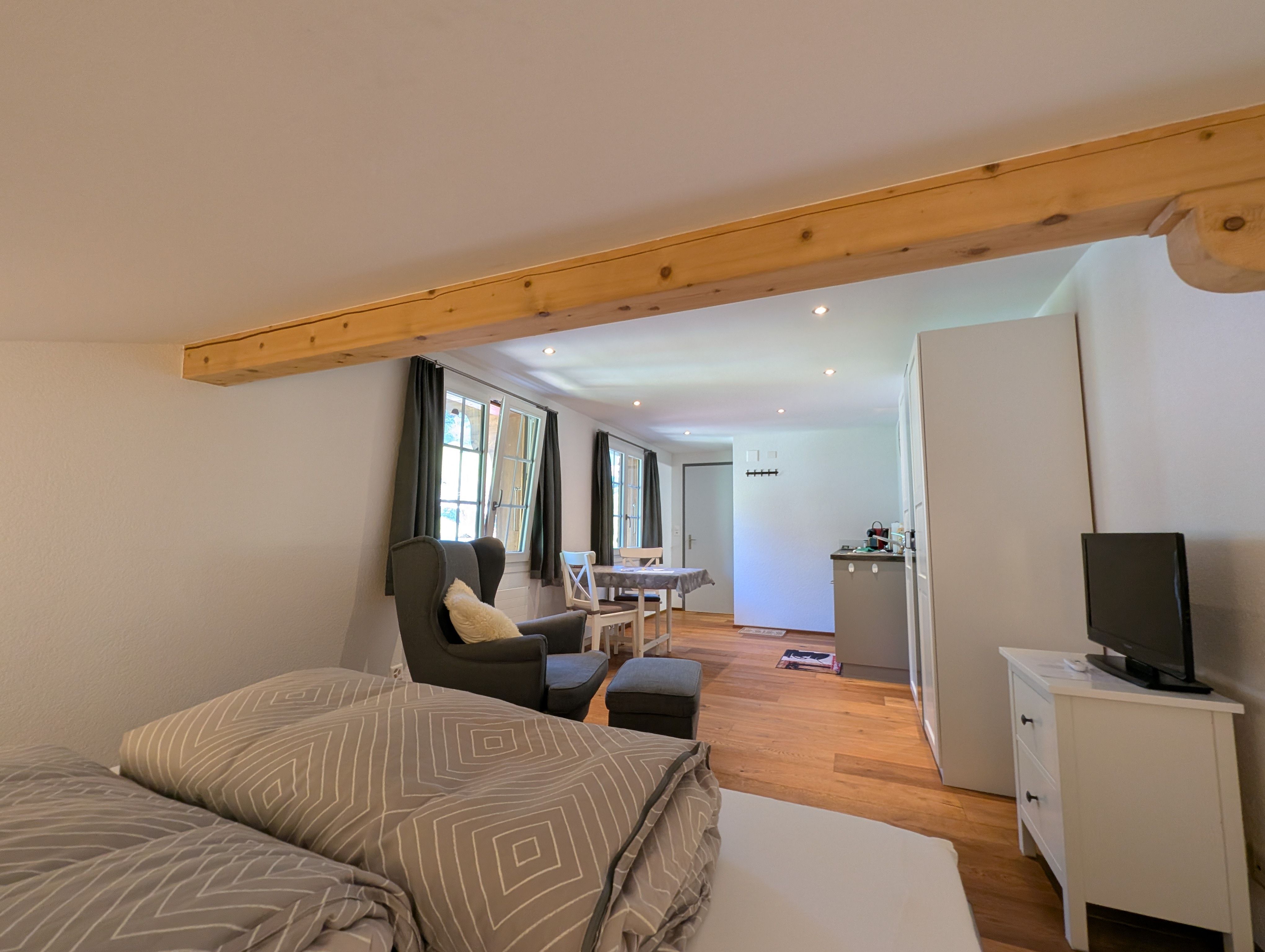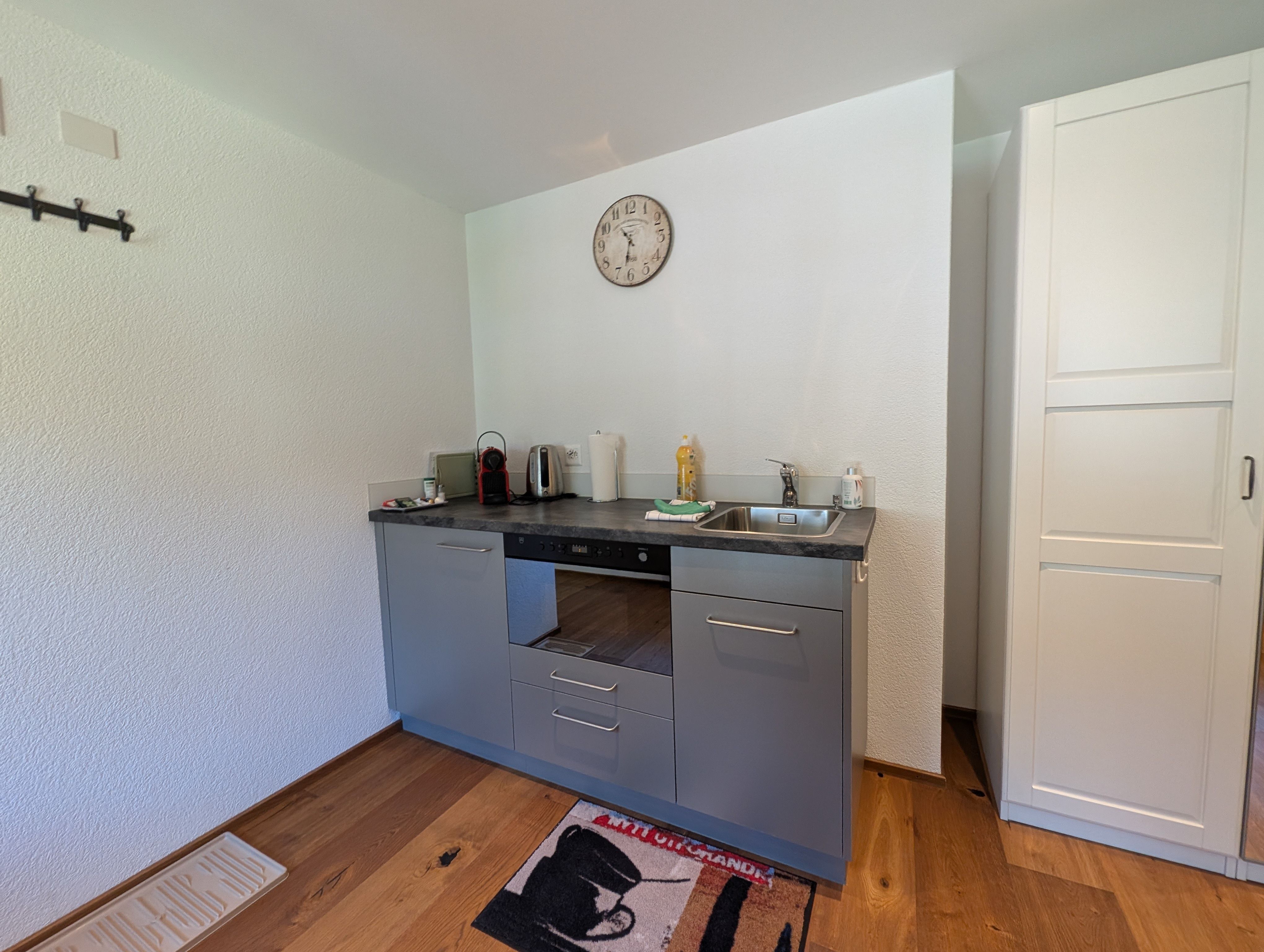 Im Inneren erwartet Sie ein geschmackvoll eingerichtetes Wohn-Schlafzimmer mit einem komfortablen Doppelbett der Maße 180 x 200 cm, einem gemütlichen Sessel und einem Tisch. Für Ihre Selbstversorgung finden Sie eine Auswahl an Annehmlichkeiten wie einen Kühlschrank, eine Mikrowelle, einen Wasserkocher und eine Nespresso-Kaffeemaschine, die Ihren Aufenthalt bequem gestalten. Bitte beachten Sie, dass das Kochen nur mit der Mikrowelle möglich ist. Zudem ist ein modernes Badezimmer mit Toilette, Dusche und einem Lavabo, ausgestattet mit einem Spiegelschrank, Teil der Ausstattung.