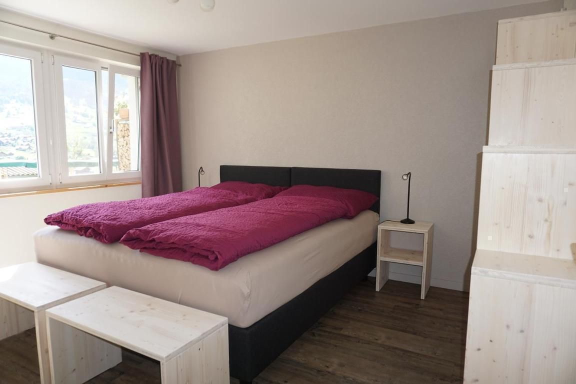 Das Schlafzimmer ist mit einem Boxspring-Bett ausgetattet, welches separiert werden kann. Sogar vom Bett aus hat man Sicht auf die Eiger Nordwand! Im Wohnzimmer kann die Polstergruppe in ein Bettsofa mit separater Matratze verwandelt werden (140x200).