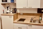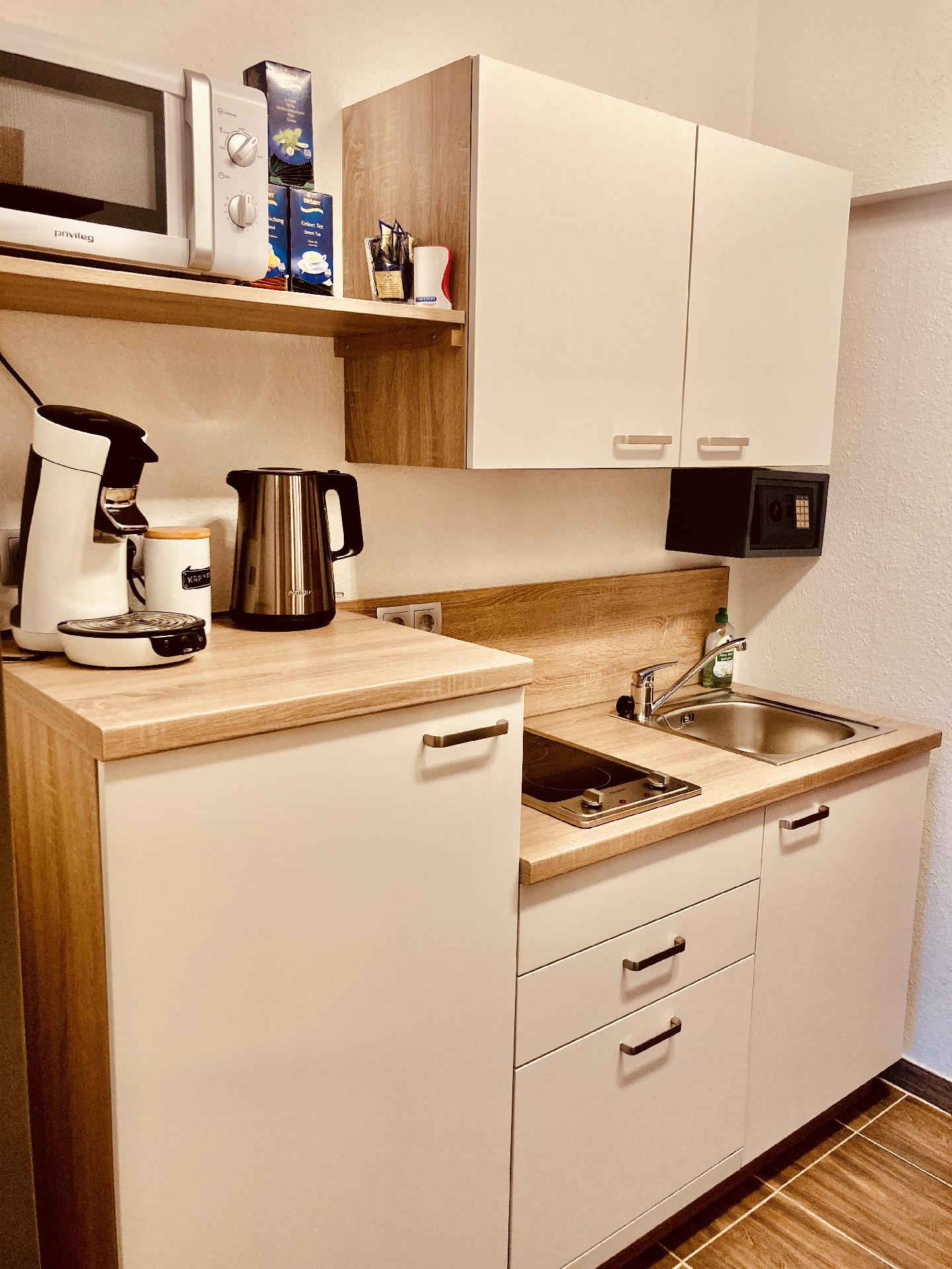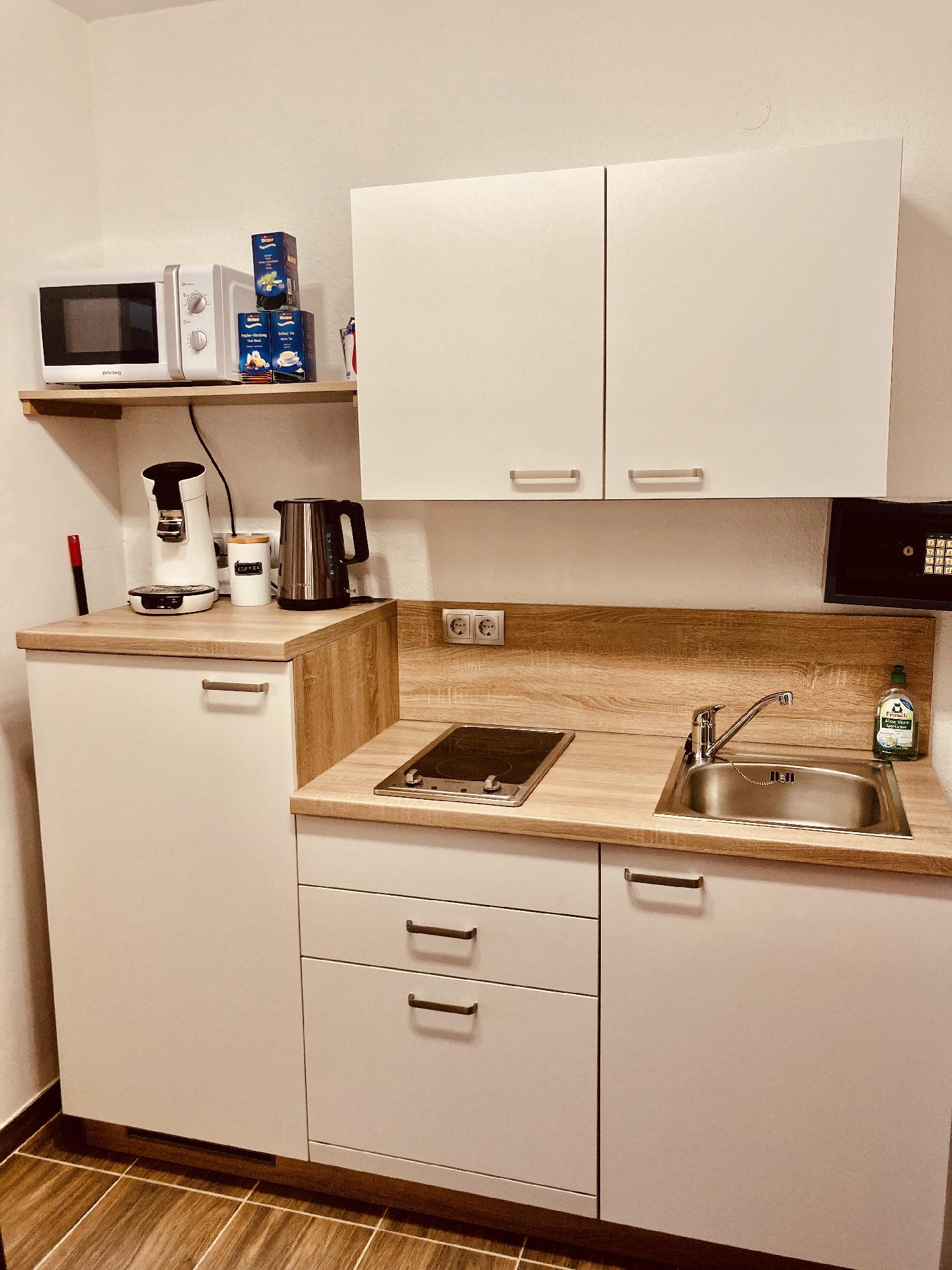Kochen: 2-Plattenherd; Ceranherd; Elektroherd; Gefrierfach; Herd; Kaffeepadmaschine; Kaffekapselmaschine; Kühlschrank; Mikrowelle; Spülmaschine; Toaster; Wasserkocher