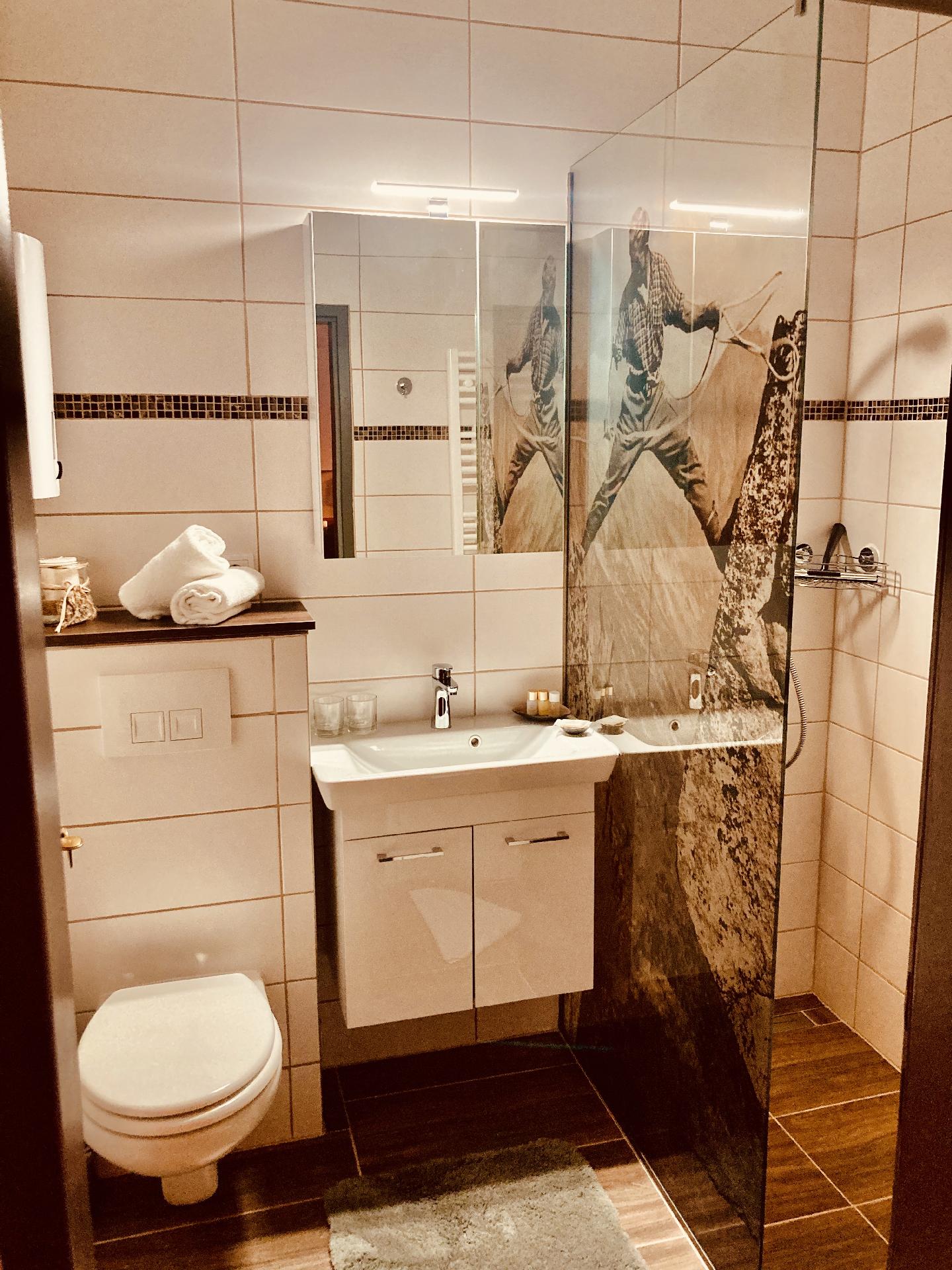 Bad/WC: Dusche; Föhn; Toilette; Waschbecken
