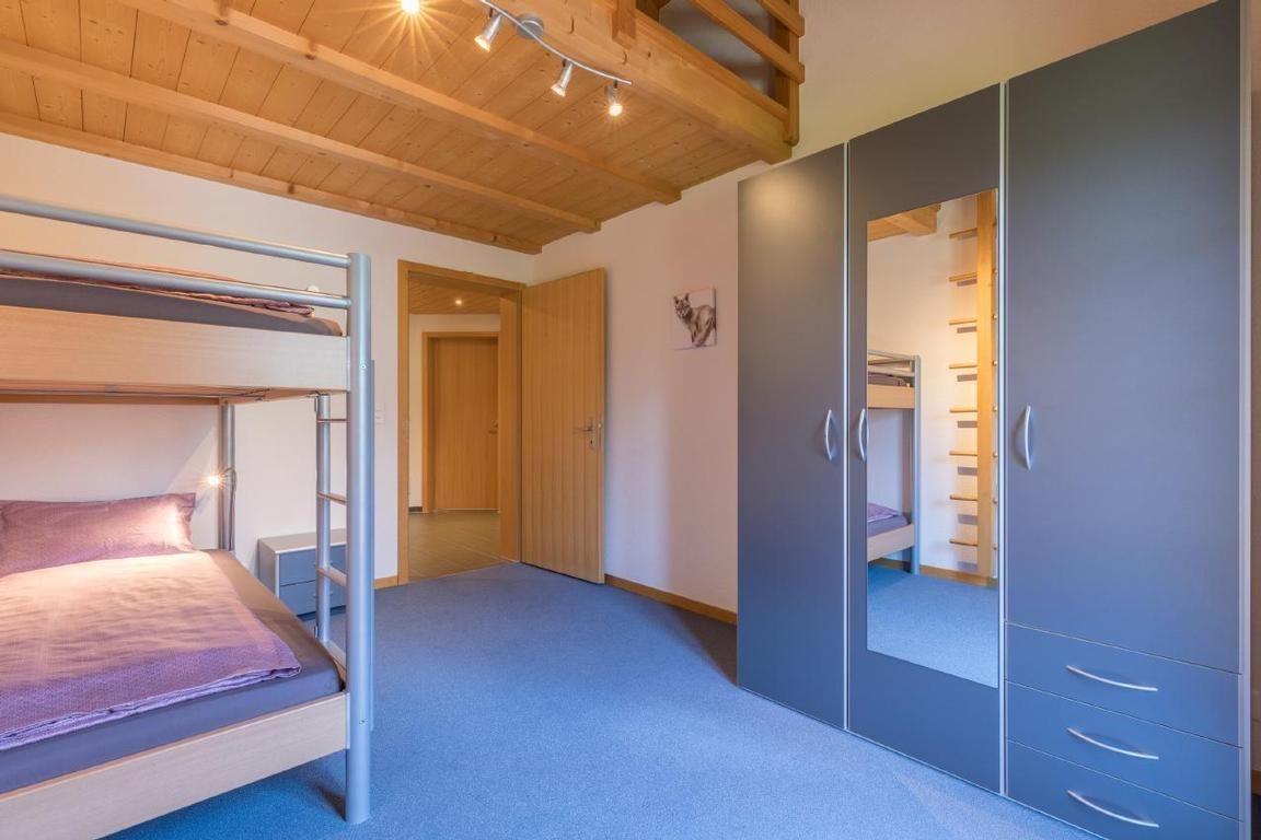 Das eine Schlafzimmer ist mit einem Doppelbett, das andere mit einem Etagenbett ausgestattet. Beide Zimmer verfügen über einen Schrank. Im Badezimmer gibt es eine Dusche, ein Lavabo mit Spiegelschrank und ein WC. Die Küche ist gut ausgestattet und bietet reichlich Platz. Das helle, gemütliche Wohn- und Esszimmer ist mit einem Tisch mit 6 Stühlen, einem Sofa mit Salontisch und TV eingerichtet. Die Dachschräge verleiht diesem Raum eine ganz besondere Atmosphäre. Ebenfalls steht Ihnen ein schmaler Balkon zur Verfügung, von wo Sie den freien Blick auf die Eigernordwand und die wunderschöne Natur von Grindelwald geniessen können.