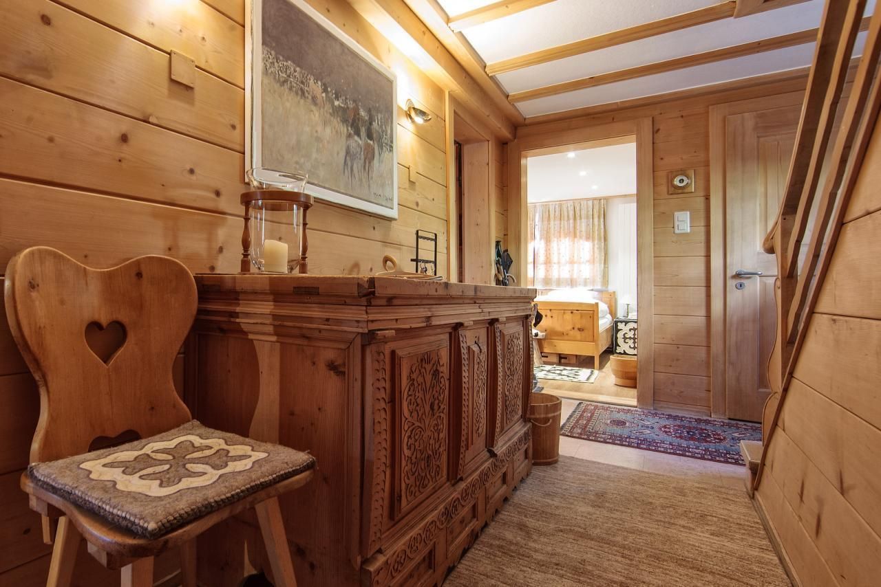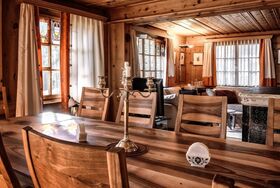 Im Erdgeschoss sind: ein Vorraum mit Garderobe; eine Arvenstube mit heimeligem Kachelofen; Fernseher / DVD / Stereoanlage; ein Esszimmer für 12 Personen; eine offene Küche.
