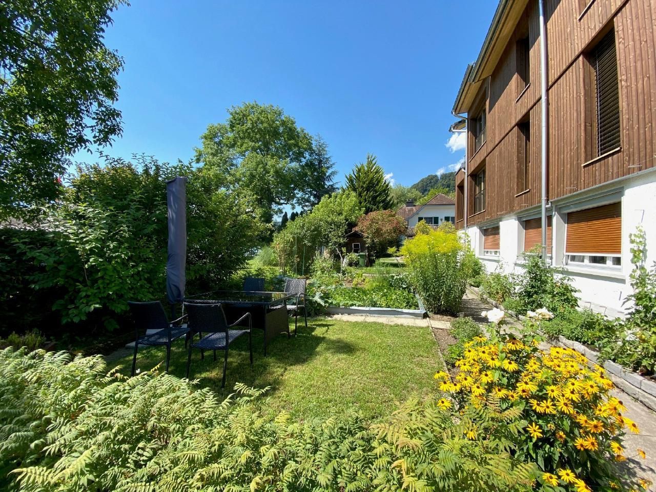 Grosse gepflegte Gartenanlage mit privater Treppe und Kiesstrand zum Badespass. Grillplatz, genug Tische und Sitzgelegenheiten für alle Bewohner (gemischte Nutzung).