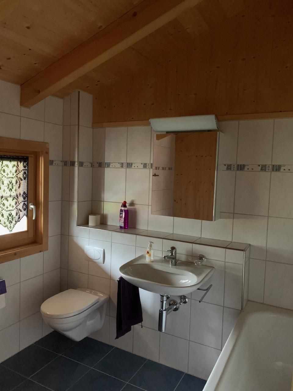 Obergeschoss: grosses Schlafzimmer mit Doppelbett und Einbauschränken. Grosszügiges Badezimmer/WC mit Badewanne und Bodenheizung. Bett- und Frottewäsche inkl.