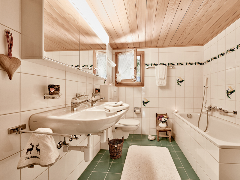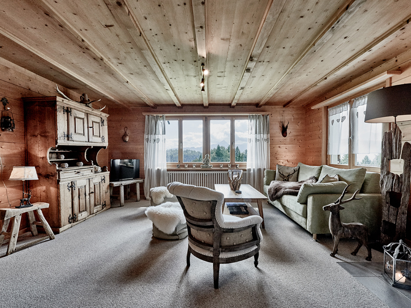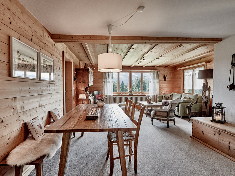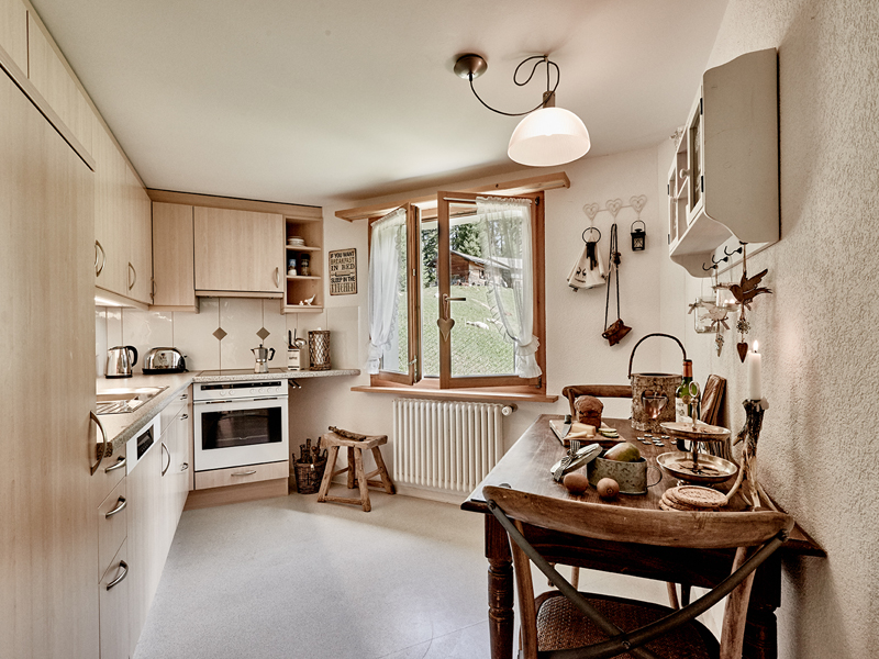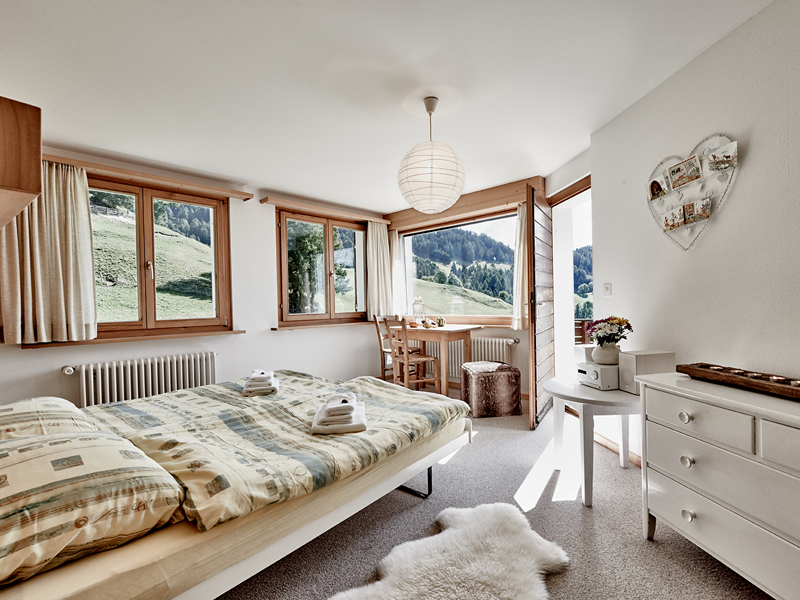 3.5-Zimmerwohnung im Chalet im 1. Stock, komfortable und gemütlich eingerichtet: Wohn-/Esszimmer, 1 Zimmer mit Doppelbett und 1 Zimmer mit 2 Einzelbetten, Bad/Dusche/WC, Küche, Bodenheizung (Zentralheizung), TV und gemütlicher Holzofen im Wohnzimmer.