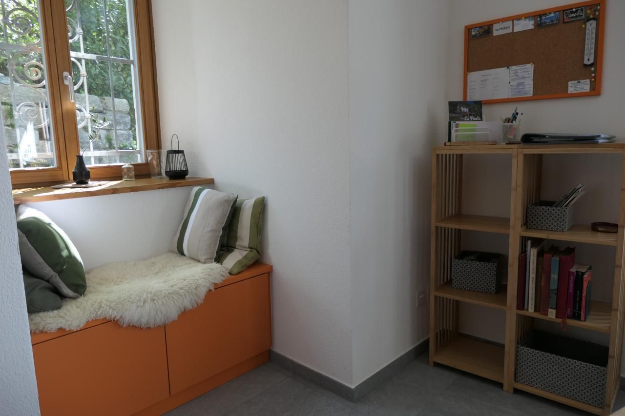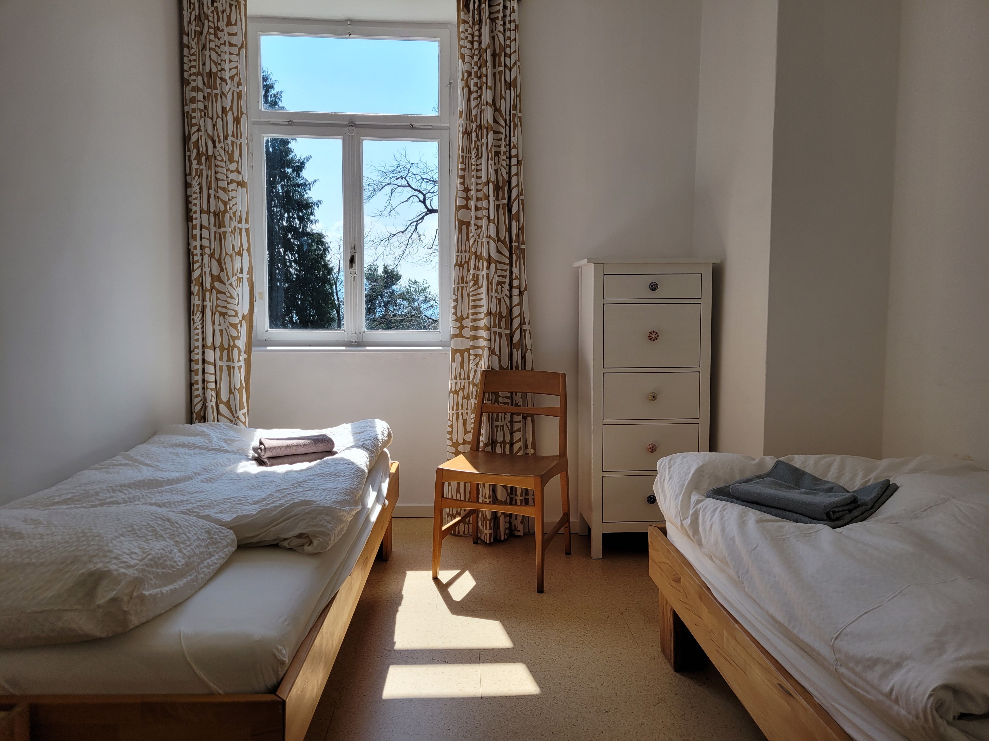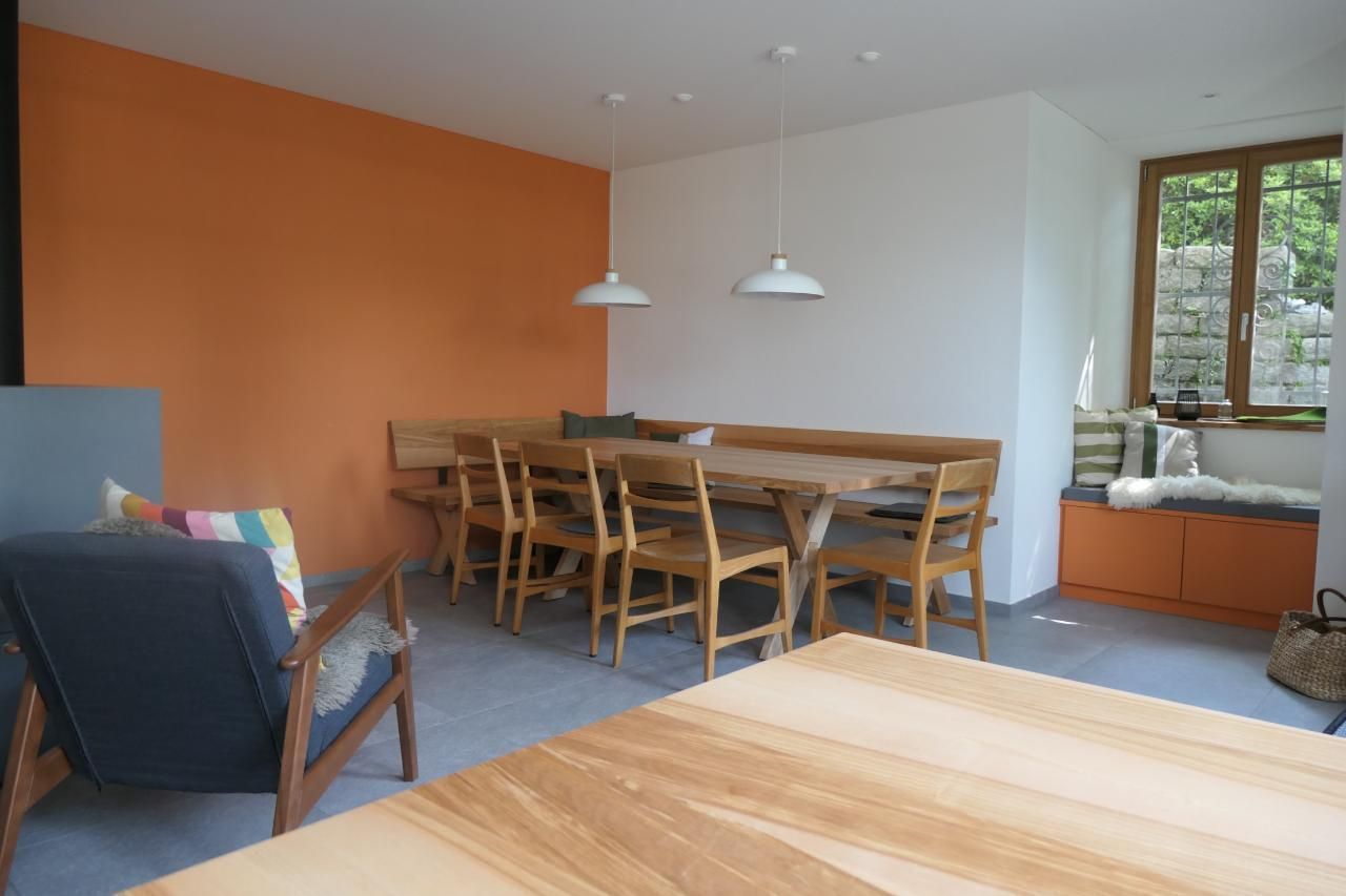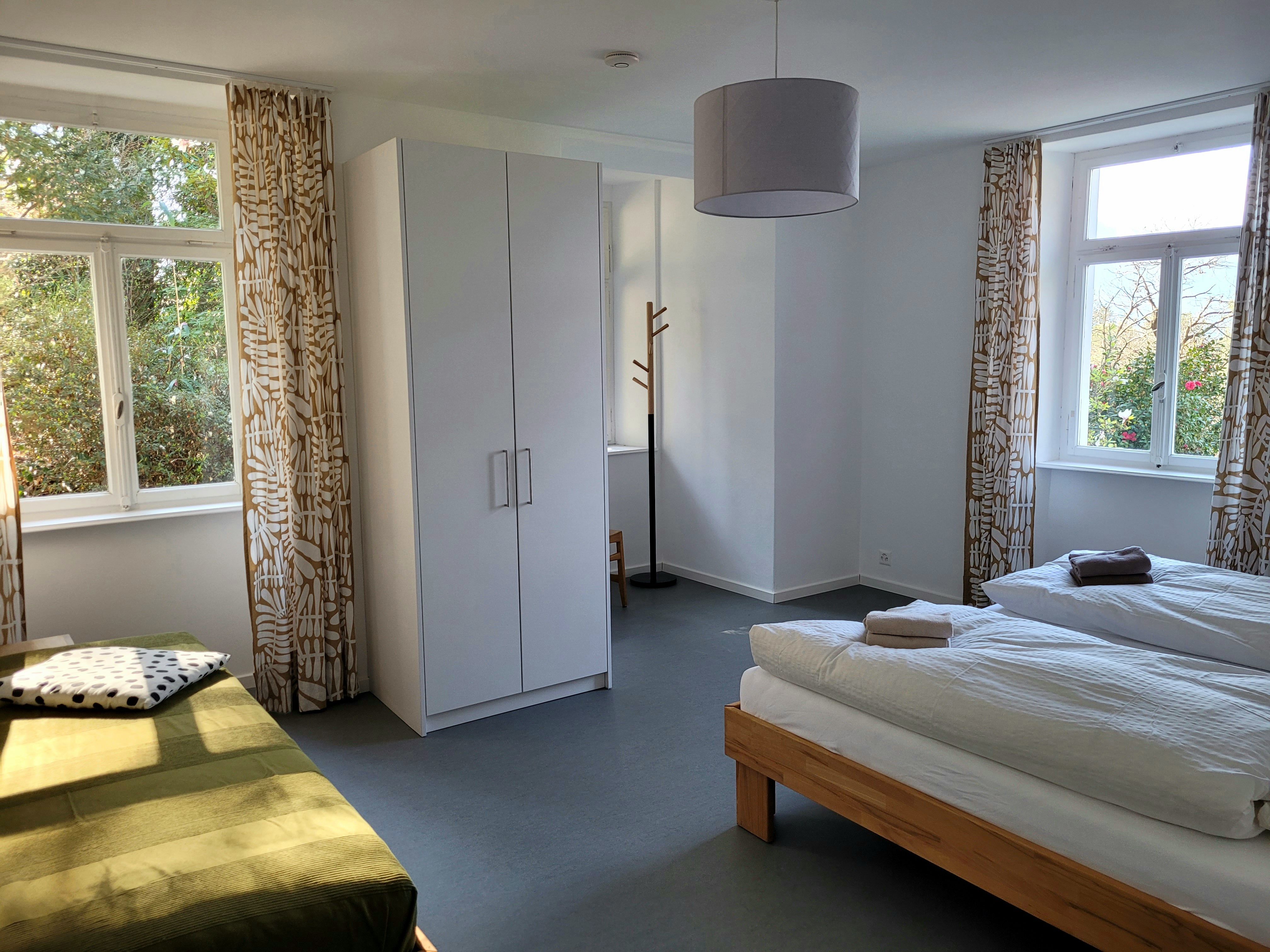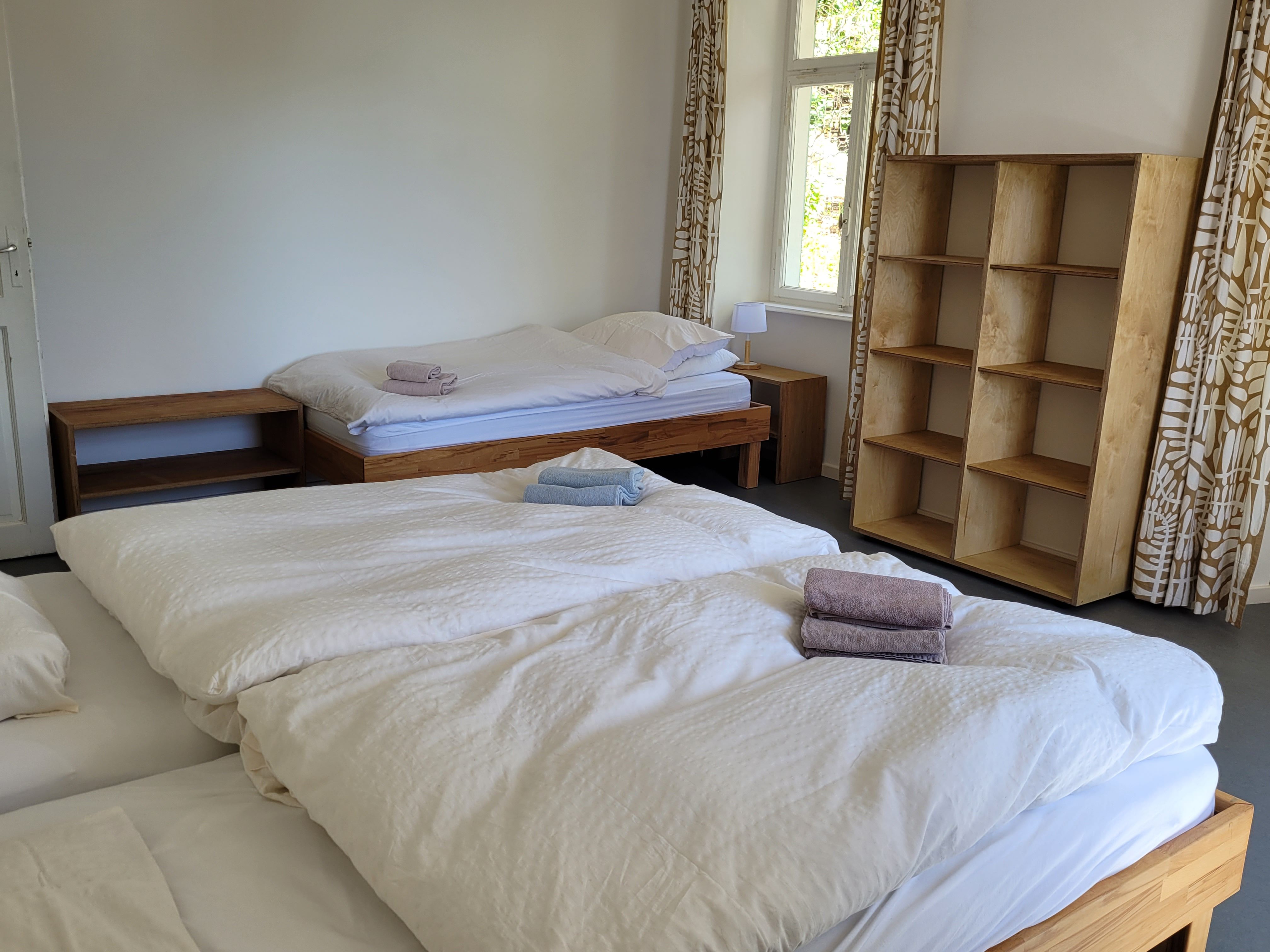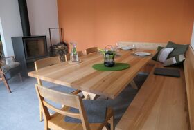 Die Wohnküche, wo das gemeinsame Leben stattfindet, hat einen grossen Tisch mit Eckbank. Ein Holzkaminofen sorgt bei Bedarf für angenehme Wärme (Holz ist immer genügend vorhanden). Die Schlafzimmer sind nicht beheizt. Dafür gibt es Daunendecken und Bettflaschen. Die Badezimmer sind beheizt.