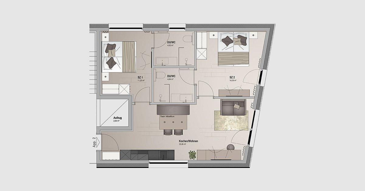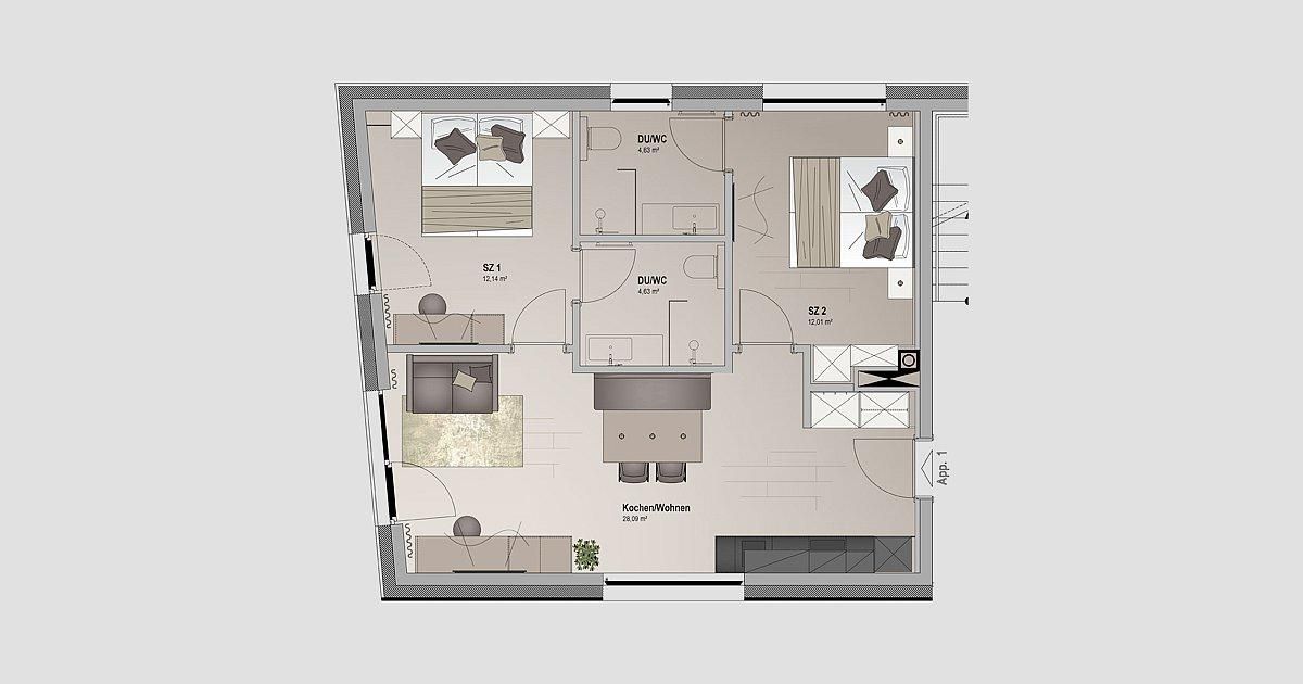 Apartment Typ 01 (ca. 65m²): ebenerdig und barrierefrei, 2 Doppelzimmer mit je Flat-TV, 2 Badezimmer mit Wellnessdusche/WC; 1 gemütliche, vollausgestattete Wohnküche (Cerankochfeld, Backofen m. Mikrowellen Funktion, Geschirrspüler, Kühlschrank mit Gefrierfach, Kaffeemaschine, Wasserkocher, Eierkocher uvm.) mit Flat-TV und gemütlicher ausziehbarer Couch (Schlafmöglichkeit für die 5. Person). Relaxen Sie auf unserer möblierten Gartenterrasse.