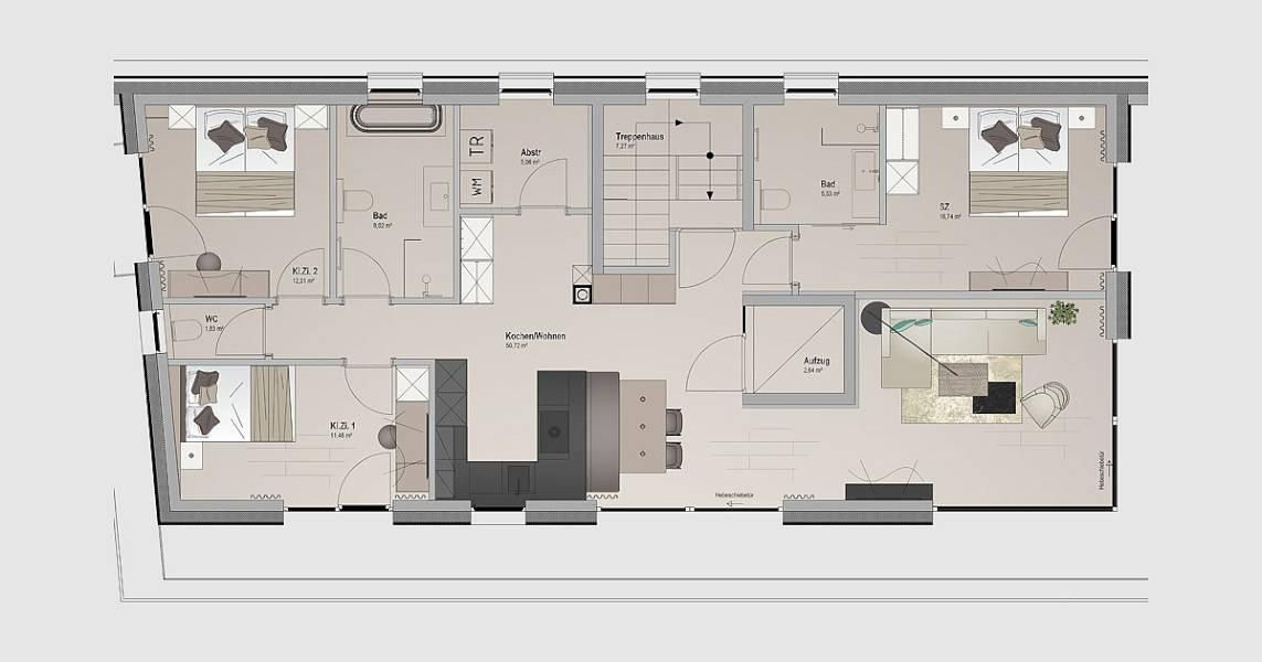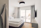 Penthouse (ca. 110 m²): barrierefrei, 3 Doppelzimmer mit je Flat-TV, 2 Badezimmer mit Wellnessdusche/WC bzw. Badewanne/WC, 1 separates WC, Abstellraum und eine großzügige, vollausgestattete Wohnküche (Cerankochfeld, Backofen mit Mikrowellenfunktion, Geschirrspüler, Kühlschrank mit Gefrierfach, Kaffeemaschine, Wasserkocher, Eierkocher uvm.) mit Flat-TV und gemütlicher ausziehbarer Couch (Schlafmöglichkeit für die 7. Person). Relaxen Sie auf unserer großen, möblierten Sonnenterrasse. Der Personen-Lift bringt Sie DIREKT ins Penthouse.