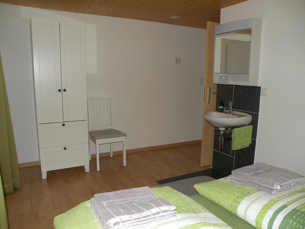 Innen überzeugt die gemütliche 4-Zimmerwohnung mit einer Ausstattung, die keine Wünsche offenlässt. Sie ist ideal für vier Personen konzipiert, bietet aber dank einer Schlafcouch im Wohnzimmer Platz für einen weiteren Gast. Die Küche ist mit modernen Geräten wie einem Kochherd, Backofen, Mikrowelle, Kühlschrank mit Gefrierfach, Kaffeemaschine, Geschirrspüler, Toaster sowie Fondue- und Racletteofen ausgestattet. Im großzügigen Essbereich finden bis zu sechs Personen Platz. Beide Schlafzimmer verfügen über ein Lavabo mit Spiegelschrank, ausreichend Stauraum und eine Ablagemöglichkeit für Kleidung. Das erste Schlafzimmer mit einem Doppelbett führt in eine einladende Laube, während das zweite mit zwei Einzelbetten direkten Zugang zu einem ansprechenden Balkon hat.