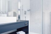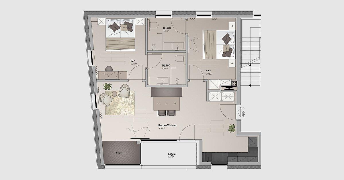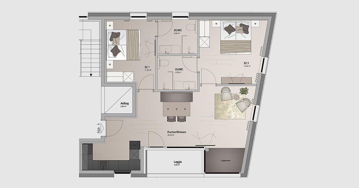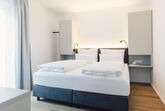 Apartment Typ 02 (ca. 70m²): barrierefrei, 2 Doppelzimmer mit je Flat-TV, 2 Badezimmer mit Wellnessdusche/WC; großzügige, vollausgestattete Wohnküche (Cerankochfeld, Backofen mit Mikrowellenfunktion, Geschirrspüler, Kühlschrank mit Gefrierfach, Kaffeemaschine, Wasserkocher, Eierkocher uvm.) mit Flat-TV und gemütlicher ausziehbarer Couch (Schlafmöglichkeit für die 5. Person). HIGHLIGHT: LiegeERKER mit Panoramafenster und möblierter Loggia