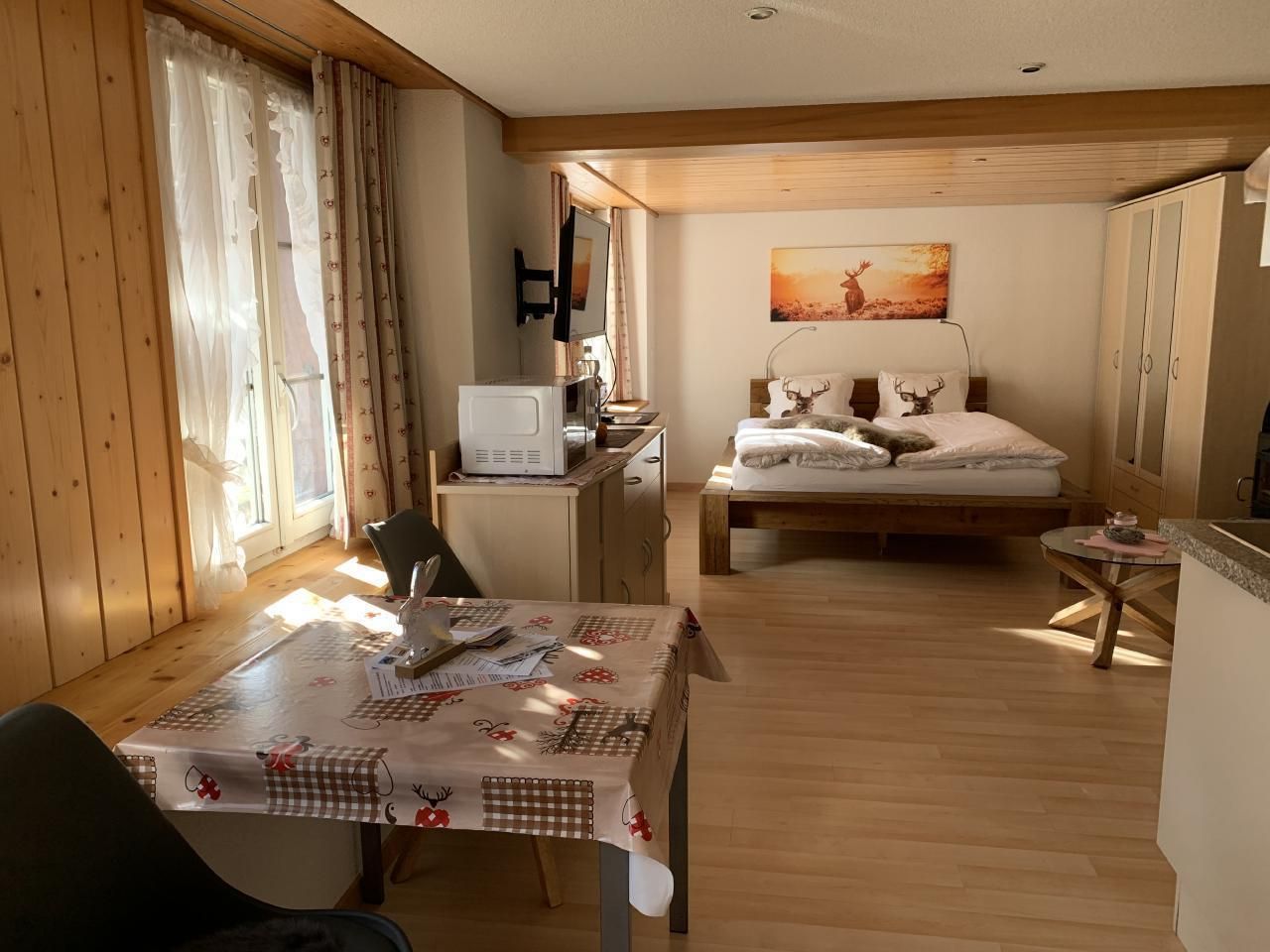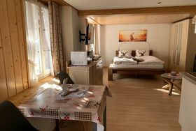 Im Erdgeschoss des traditionellen Chalet Fluehblüemli befindet sich das wunderschöne Studio. Der gemütliche Wohnraum ist nebst moderner Bodenheizung mit einem gemütlichen Ofen ausgestattet. Eine gut ausgestattete Küchenecke ergänzt das heimelige Studio. Das Bad wurde im Mai 2020 komplett saniert. Die Wohnung ist mit viel Charme ausgestattet. Ein moderner Flach TV mit UPC Box und gratis Gäste W-Lan lassen keinen Wunsch offen. Der gemeinschaftliche Terrassensitzplatz mit Cheminée bietet einen phantastischen Blick auf die Eigernordwand und die Berge. Ein Parkplatz steht direkt neben dem Haus zur freien Verfügung.