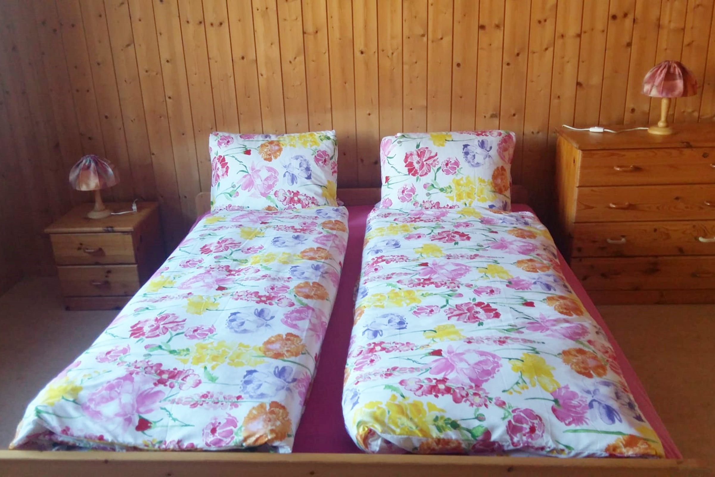 Die Ferienwohnung verfügt über drei Schlafzimmer, eines mit Doppelbett und zwei mit zwei Einzelbetten ein Badezimmer mit Dusche, Badewanne und WC ein Wohnzimmer mit Schwedenofen, Sofa und TV eine komplett ausgestattete Küche mit Backofen, Geschirrspüler, Delizio Kaffeemaschine, Kühlschrank, Mikrowelle, Toaster und Wasserkocher Inneneinrichtung & Technik