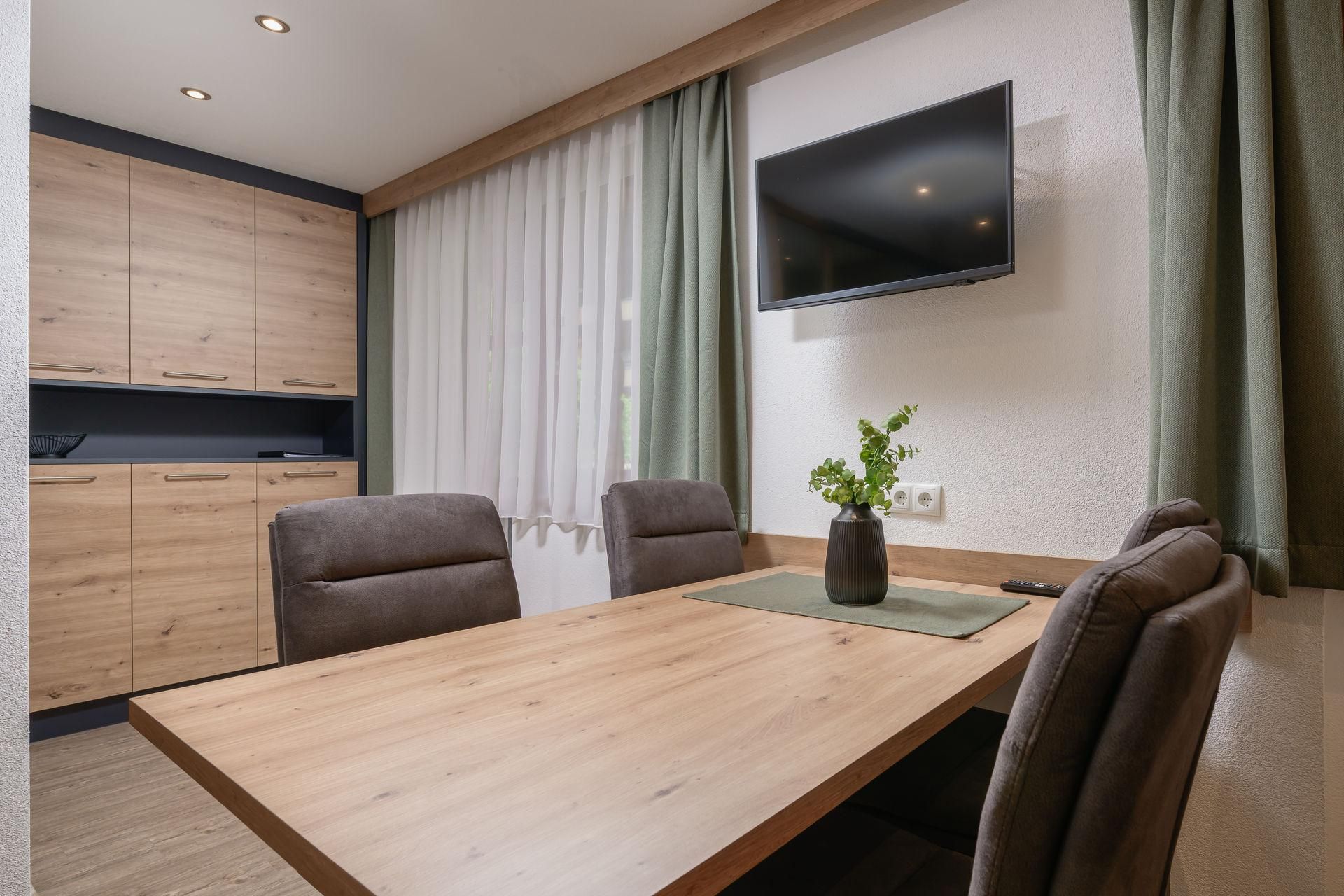 Das Appartement Bergkristall mit ca. 38 m² im ersten Stock bietet Platz für 2-4 Personen und besteht aus: 1 Doppelzimmer; Wohnküche mit gemütlicher Essecke, Sat-TV und Schlafmöglichkeit für die dritte & vierte Person; Küche komplett ausgestattet mit Kühlschrank, Kapselkaffeemaschine, Induktionskochfeld, Backofen, Spülmaschine uvm.; Badezimmer mit Dusche; separates WC; 2 möbilierte Balkone;