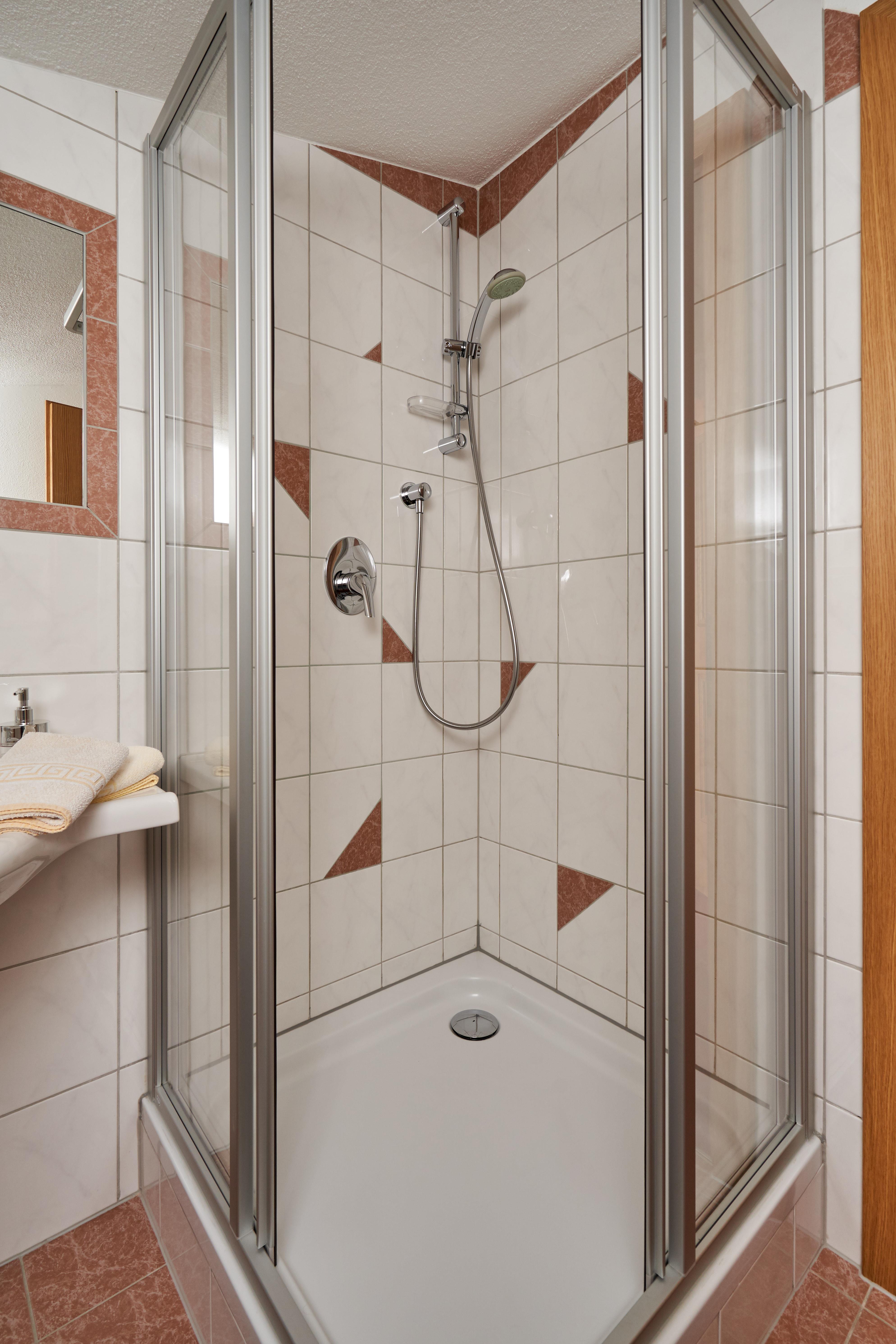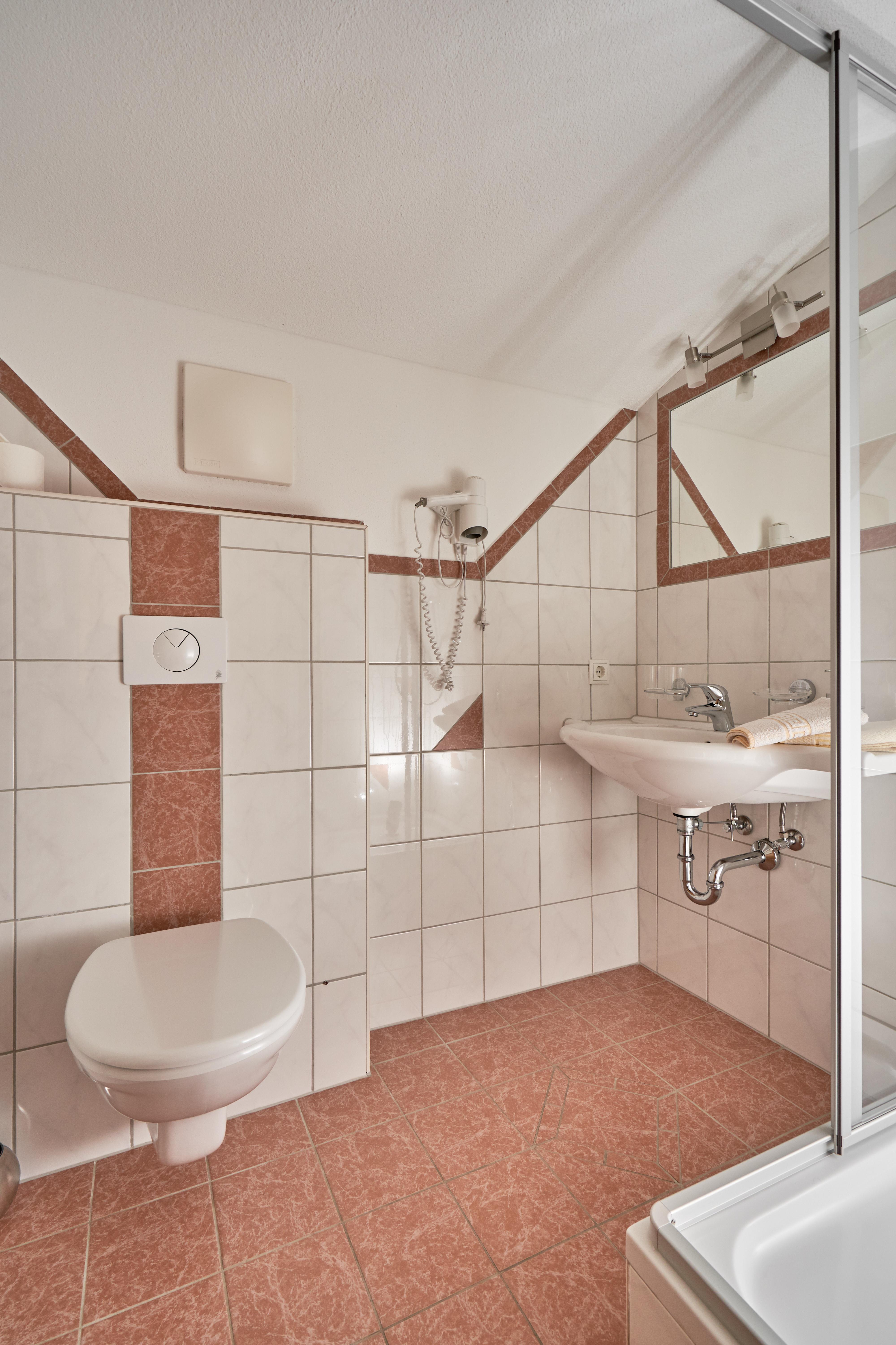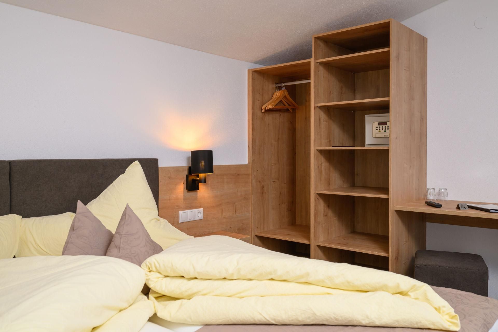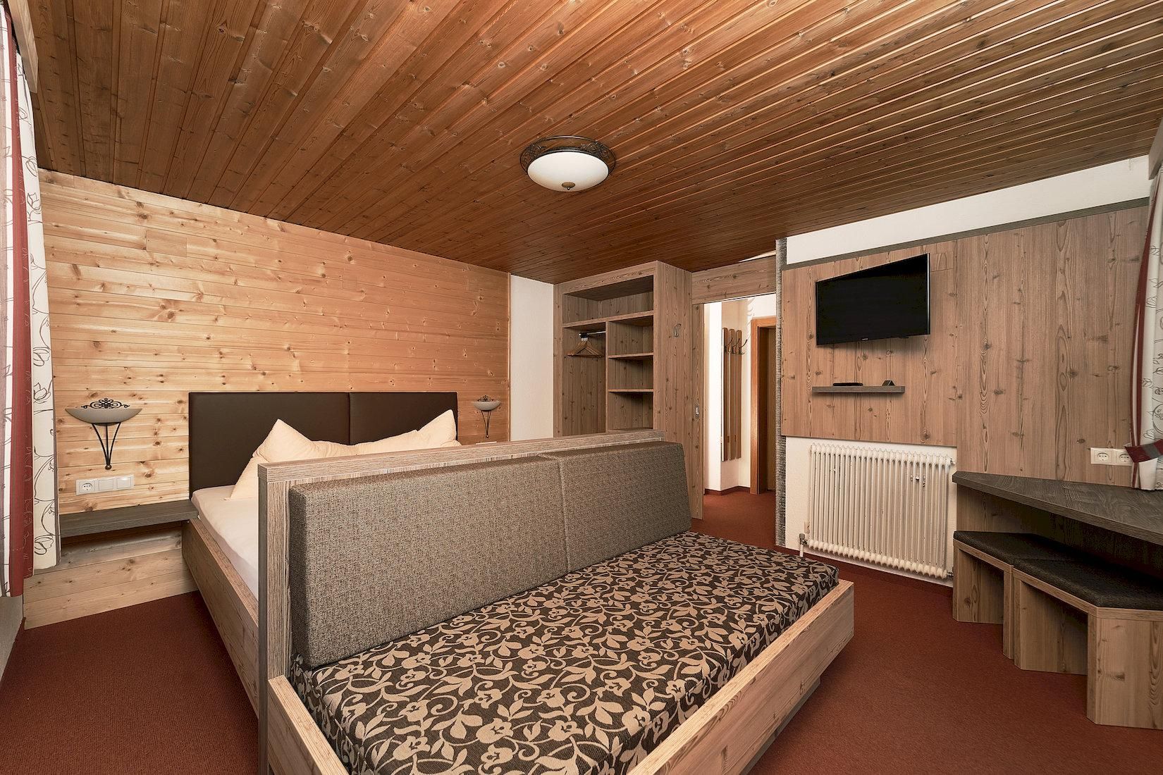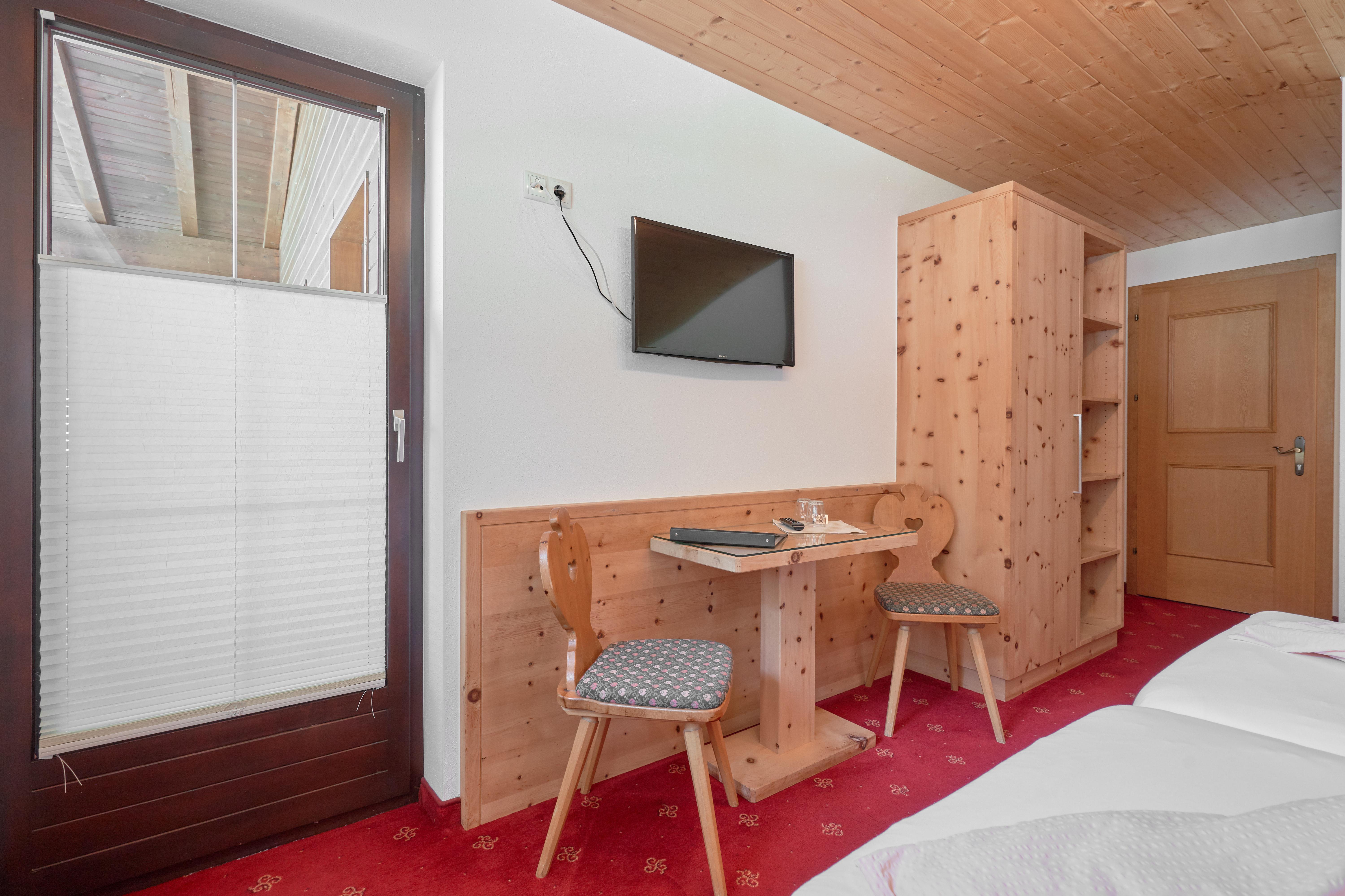 Doppelzimmer mit hemischen Holz eingerichtet mit Flat-TV, W-Lan, Wasserkocher, Badezimmer mit Dusche/WC und Haarföhn. Privater Balkon zur Südseite. Größe ca. 20 m².