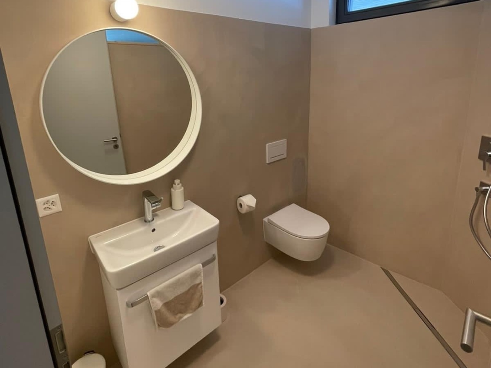 Zwei Badezimmer, ein Badezimmer mit Tageslicht mit WC und (Regen)Dusche, das zweite Badezimmer mit WC, Urinal und (Regen)Dusche. Die Badezimmer sind Fugenlos - in Base Beton. Frotteewäsche vorhanden und im Preis inbegriffen. Weitere Räume: