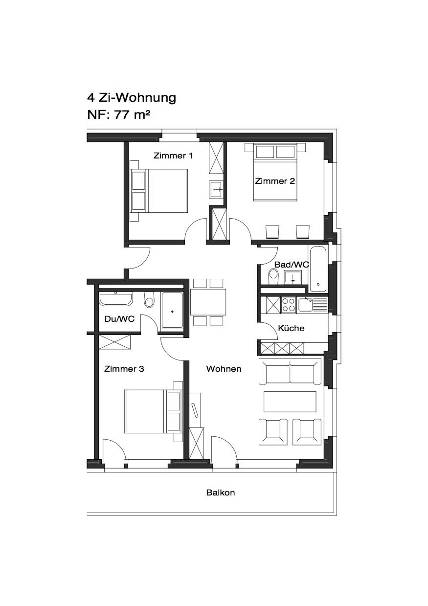 4 Zimmerwohnung (77m2) 1. OG / Nichtraucherwohnung, für Familien und ruhige Personen. Haustiere nicht erlaubt. 3 Schlafzimmer mit 2 Betten, geräumiges Wohnzimmer mit Polstergruppe, separater Küche mit 4 Kochplatten, Backofen, Geschirrspüler, Kühlschrank, Mikrowelle, Kapselkaffeemaschine und Wasserkocher. 1 Bad/WC,