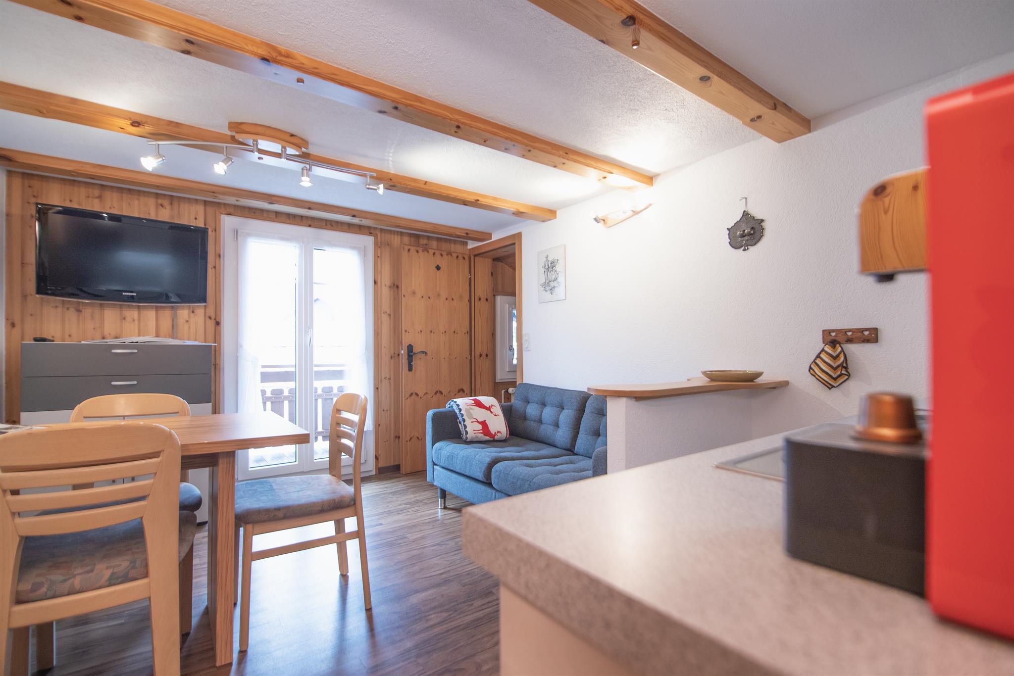 3-Zimmerwohnung (35 m2), 4.Stock, 1 Doppel und 1 Einzelzimmer, Wohnzimmer, Kabelfernseher, neu renovierte Küche mit Geschirrspüler, neu renovierte Dusche/WC, Südbalkon und Gratis W-Lan, Haus im Chaletstil erbaut, Wohnungsausstattung rustikal und komfortabel Zentrale und ruhige Lage, schöne Aussicht auf die Bergwelt. Kurtaxe wird separat einkassiert. Haustiere nicht gestattet