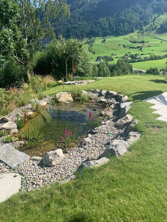 Garten: Grosse Terrasse 40 m2, Natur-Schwimmteich, Grillplatz, Rasenfläche, weiterer Sitzplatz (ca. 10 m2) mit unverbaubarer Sicht auf die Churfirsten, den Speer und das Tal. Gartenmöbel vorhanden.
