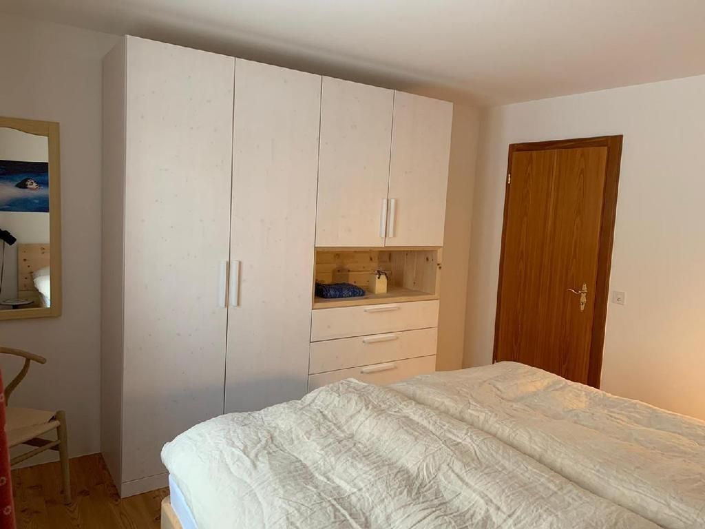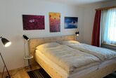 Schlafzimmer mit modernem Arvenbett und hochwertigen Taschenfederkernmatratzen.