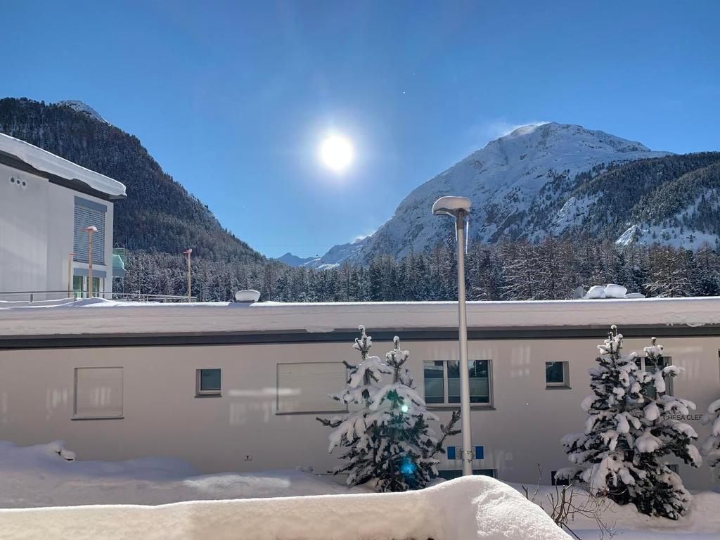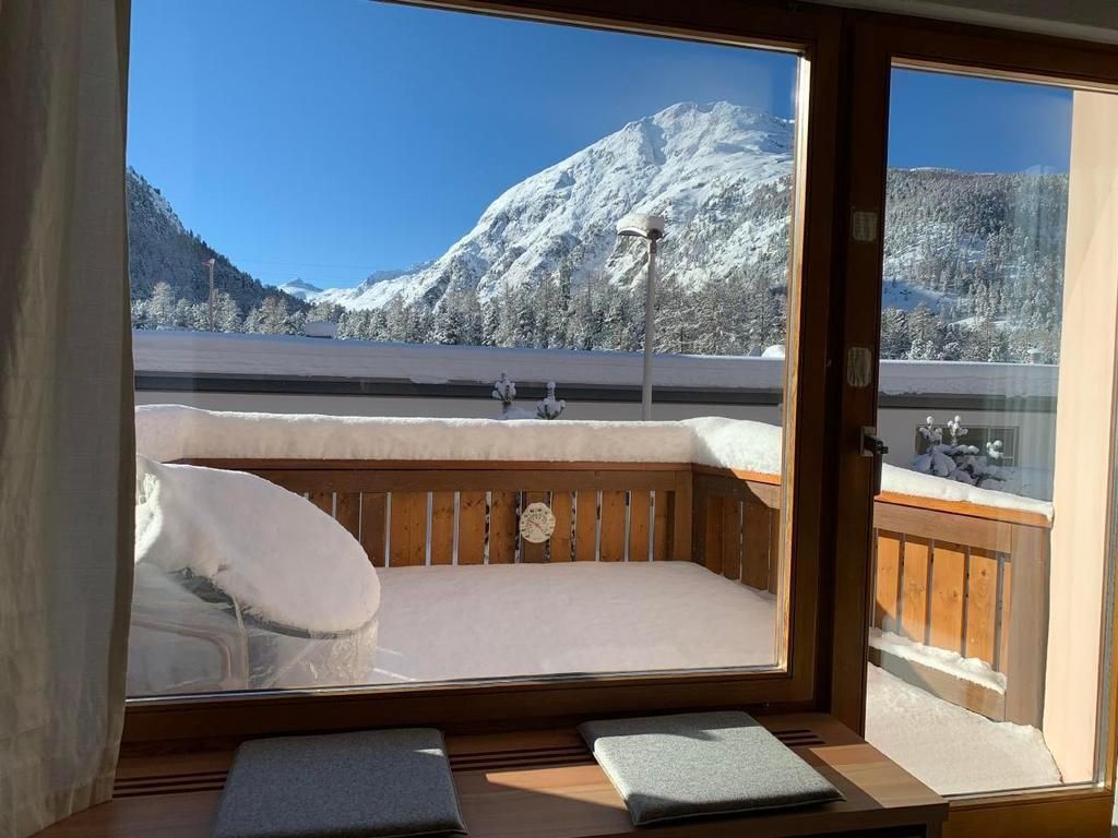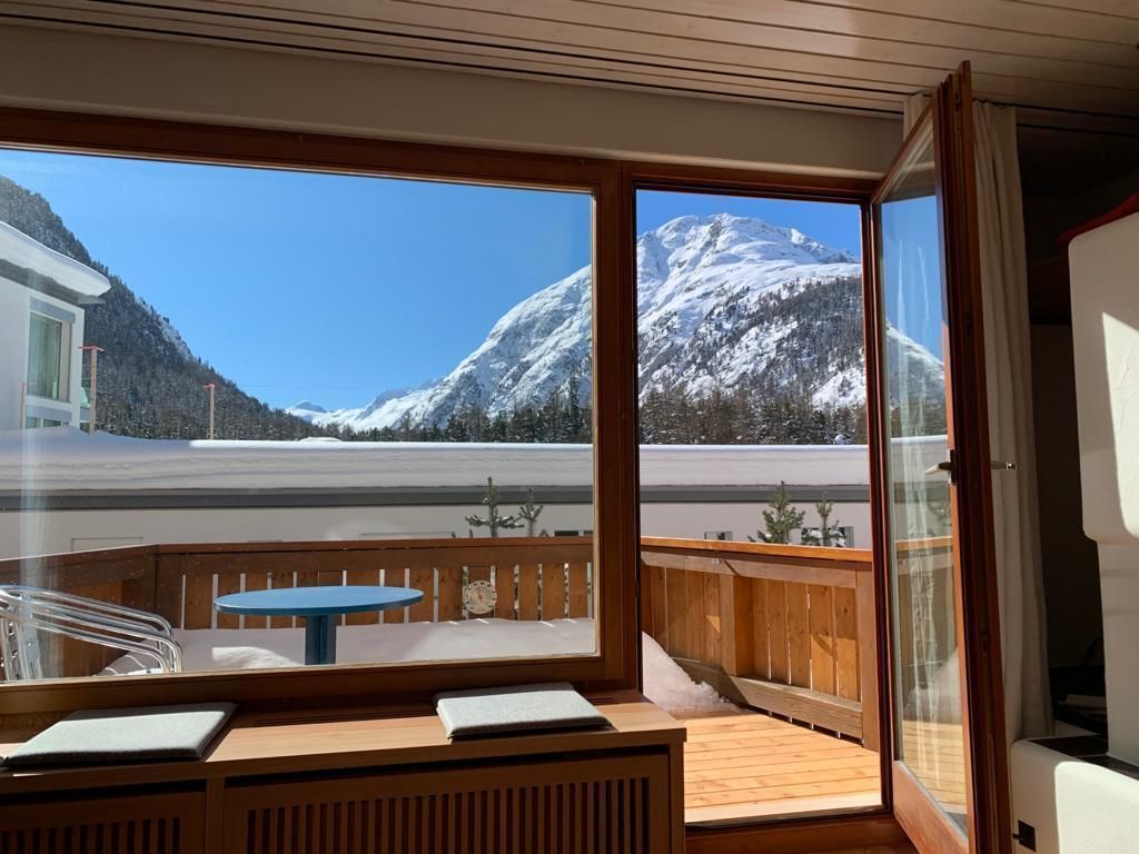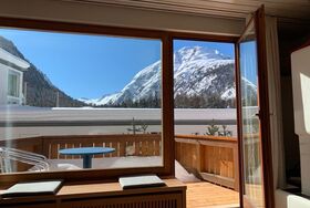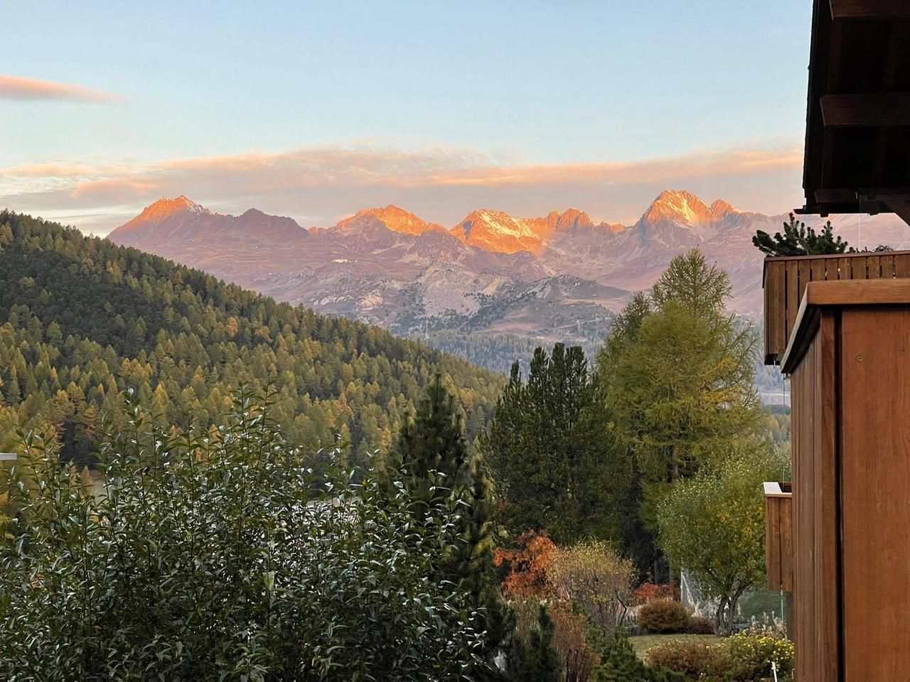 Grosser, sonniger Balkon mit Blick ins Rosegtal und auf den Sonnenaufgang am Muottas da Schlarigna.