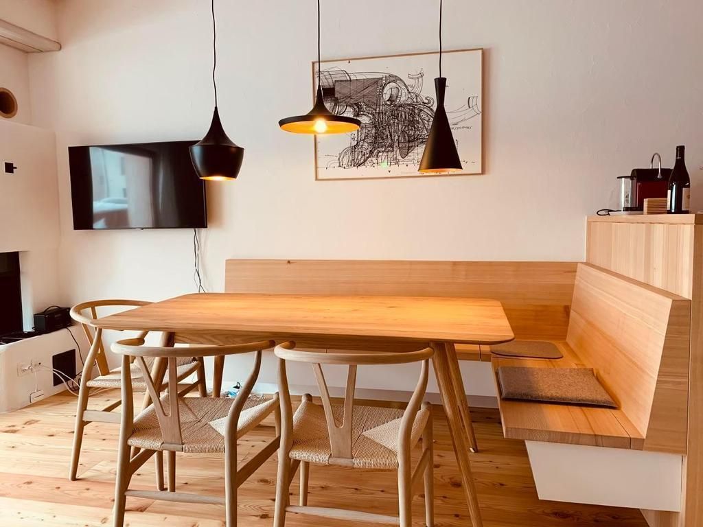 Modernes, grosszügiges Wohn-/Esszimmer mit Lärchendielen, geschmackvolle Einbaumöbel aus Engadiner Lärche und hochwertige, offene Küche - voll ausgestattet.