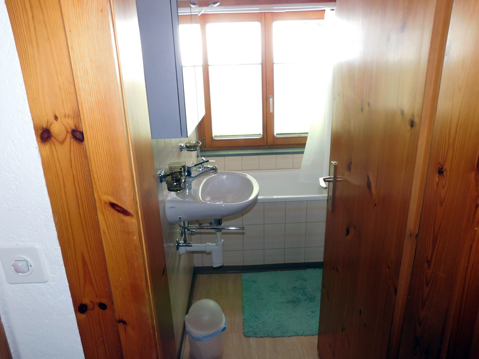 Badezimmer mit Badewanne, WC und Lavabo. Frotteewäsche und Föhn sind vorhanden und im Preis inbegriffen.