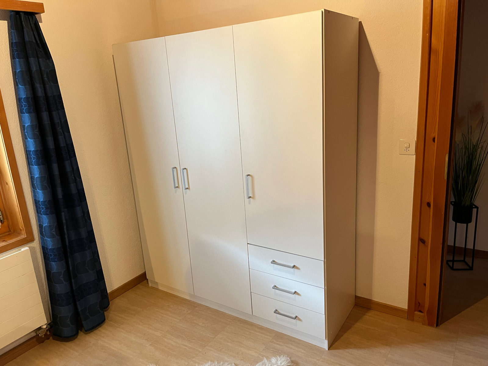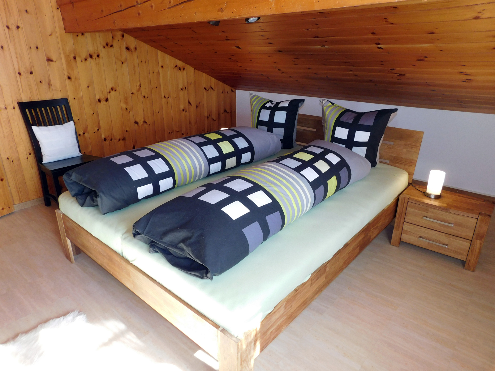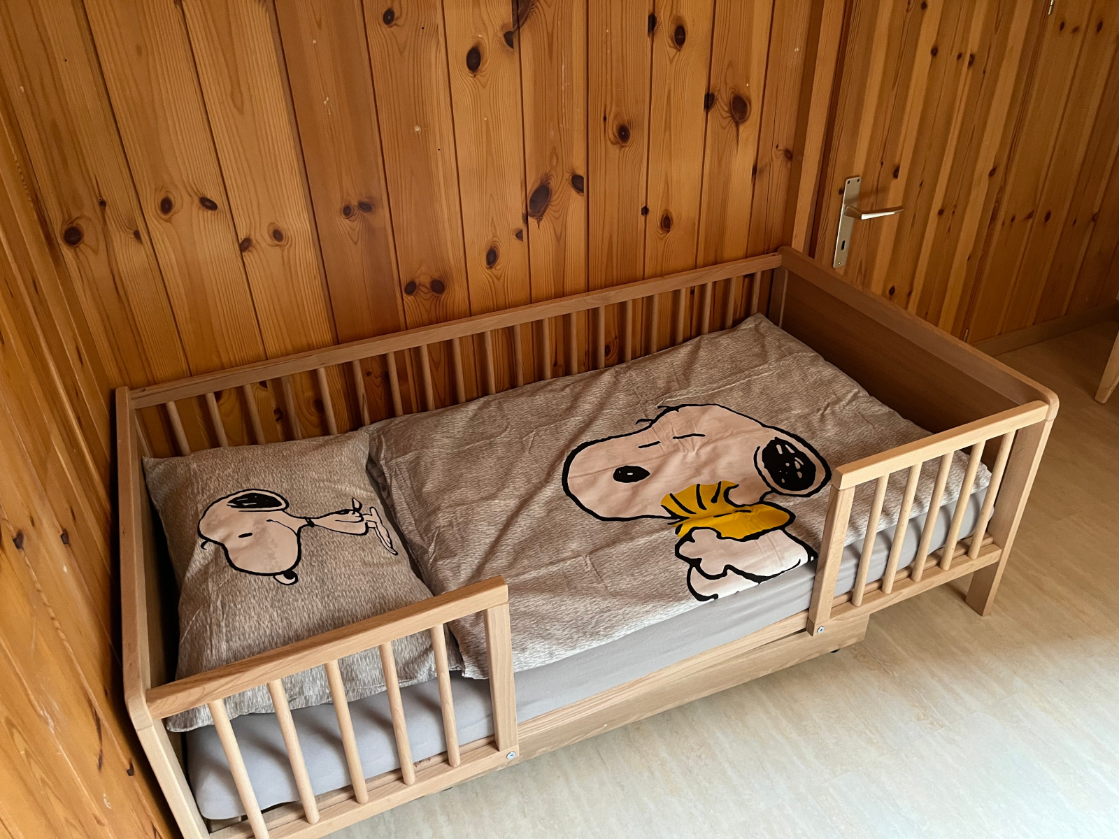 Drei Schlafzimmer - 1 Zimmer mit Doppelbett, 1 Zimmer mit Doppelbett und Babybett, 1 Kinderzimmer mit Einzelbett und Kinderbett. Zusätzlich 1 Kindertisch mit 2 Stühlen. Bettwäsche vorhanden und im Preis inbegriffen.