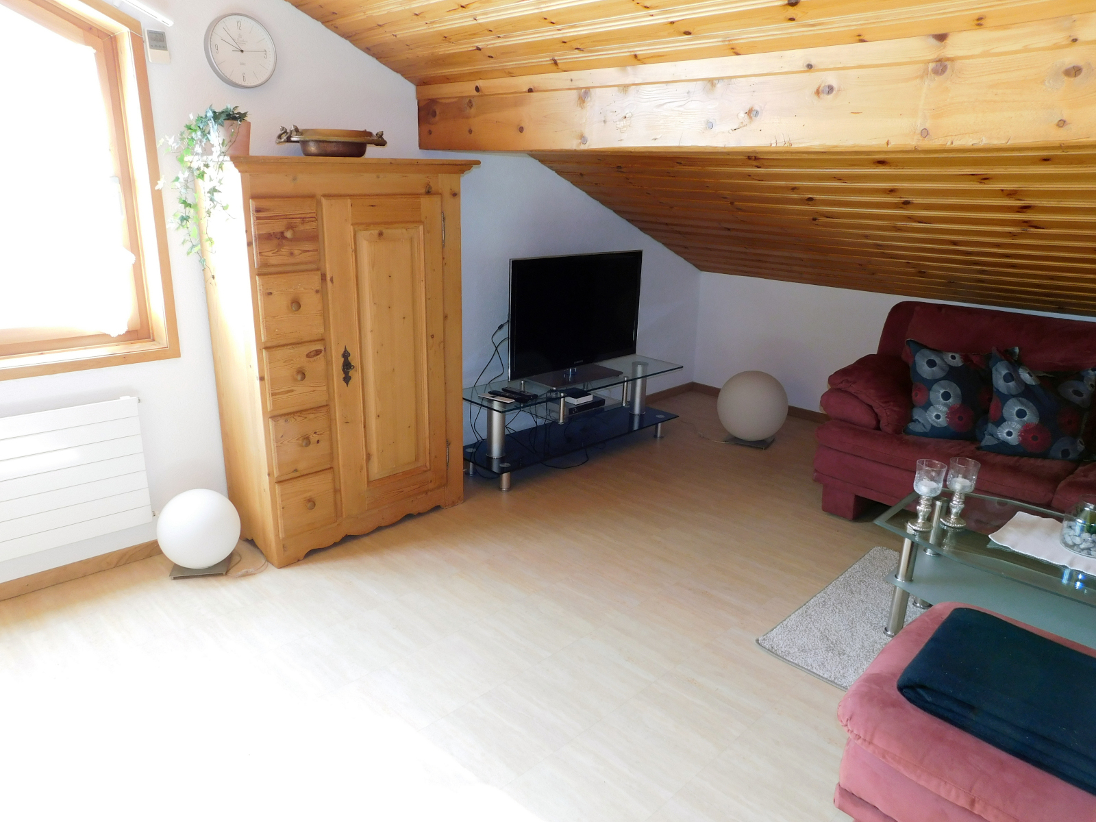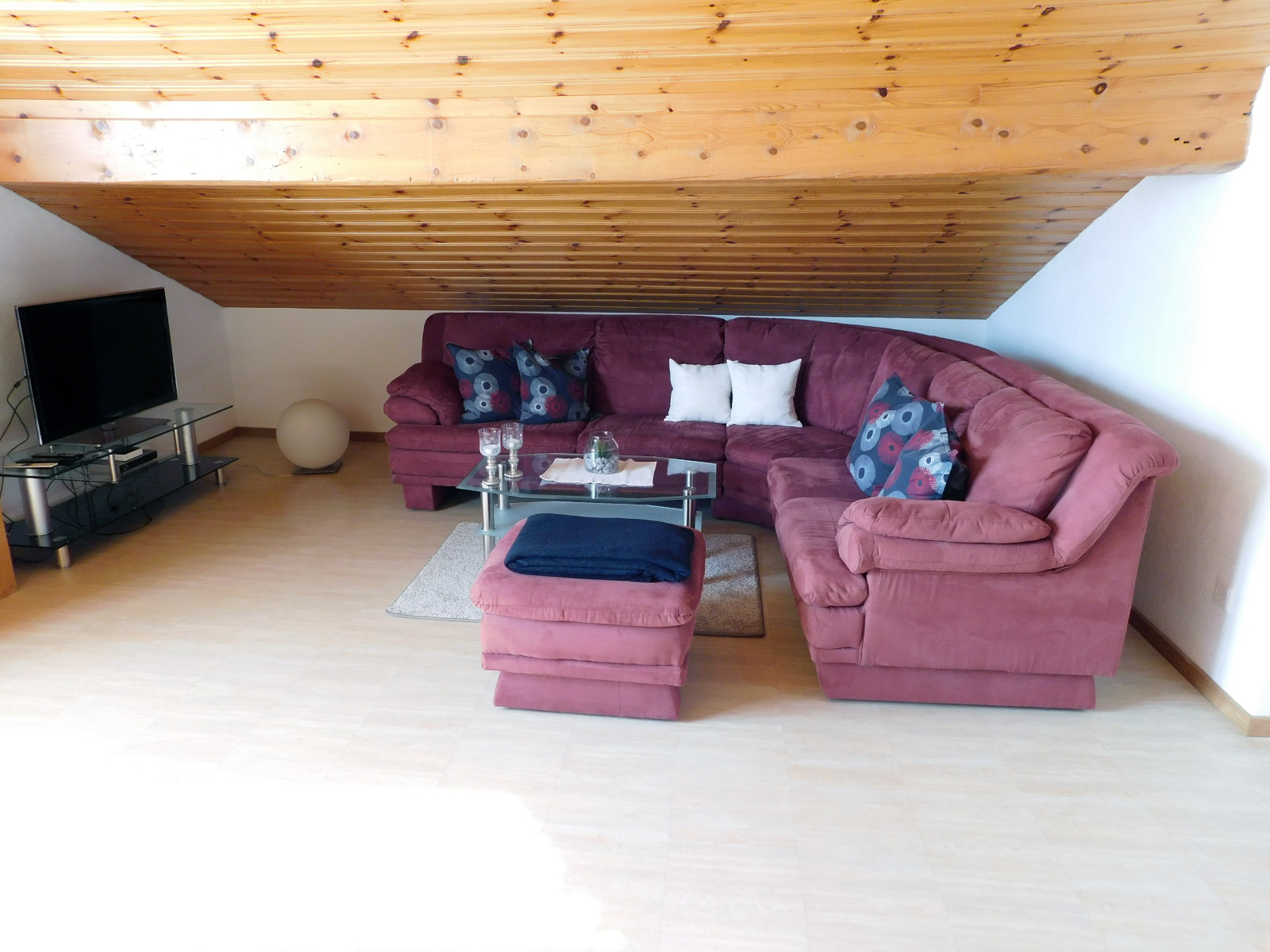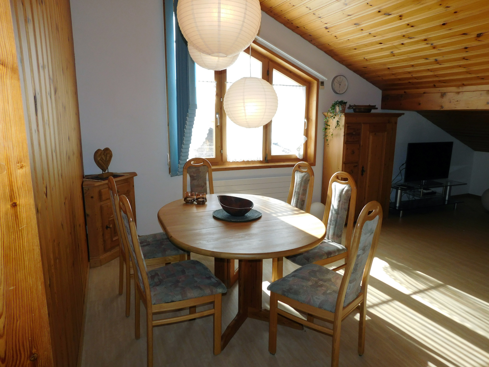 Gemütliches Wohnzimmer mit Esstisch und 5 Stühle, 1 Kindersitz (Trip-Trap), 1 Babysitz an Esstisch montierbar, ein grosses Sofa mit passendem Sessel, Salontisch. Fernseher (Satelliten-TV + Swisscom-TV) und WLAN. Diverse Brettspiele, einige Bücher + Lesematerial vorhanden. Küche: