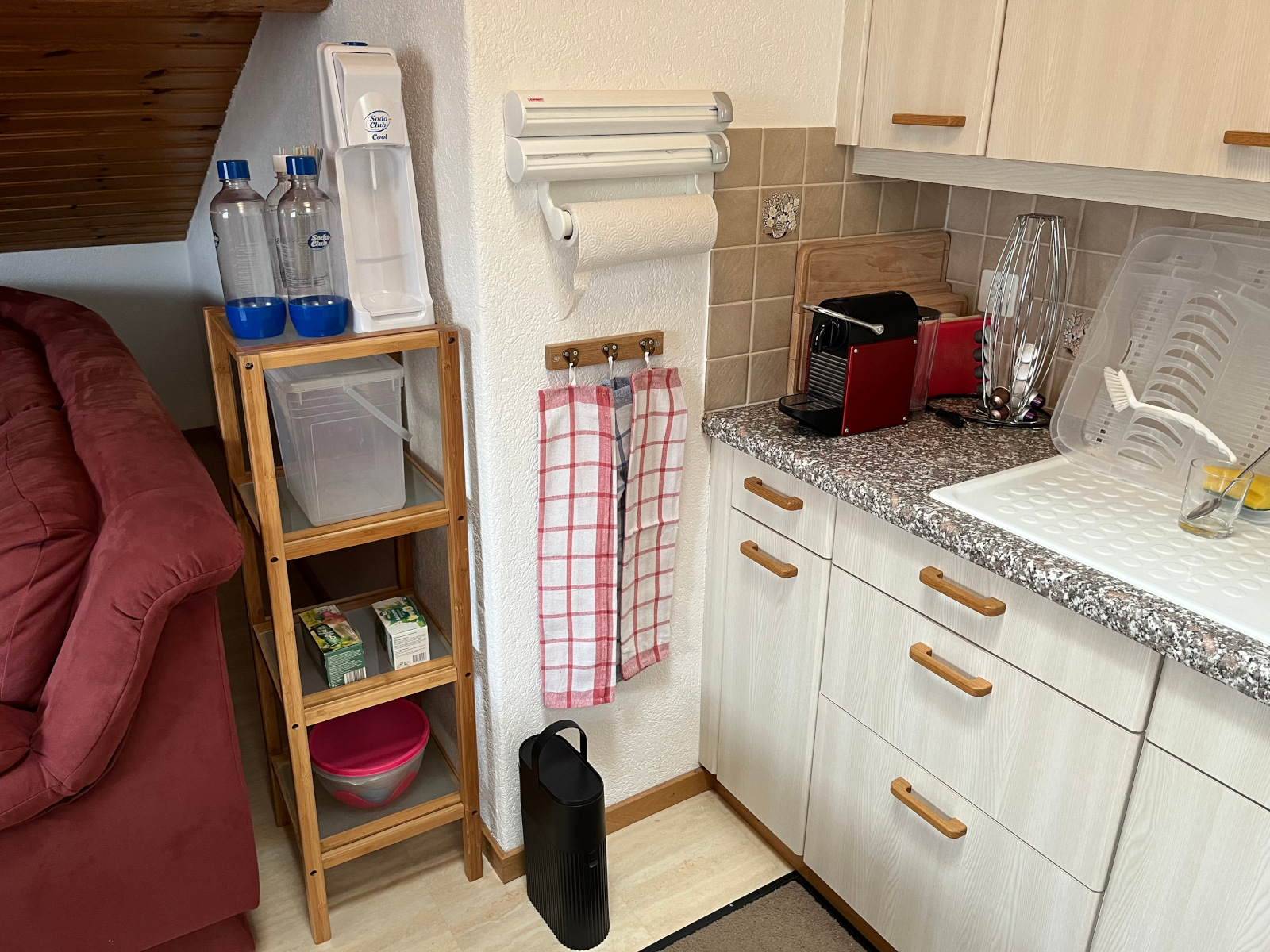 Die Küche ist komplett ausgestattet und verfügt über einen Glaskeramikherd, Backofen, Kühlschrank, Küchenregal mit Sodastream Trinkwassersprudler, Nespresso - Kaffeemaschine (Kapseln bitte selbst mitbringen), Fondue - und Raclette Set und ein Wasserkocher. Küchenwäsche vorhanden und im Preis inbegriffen. Badezimmer: