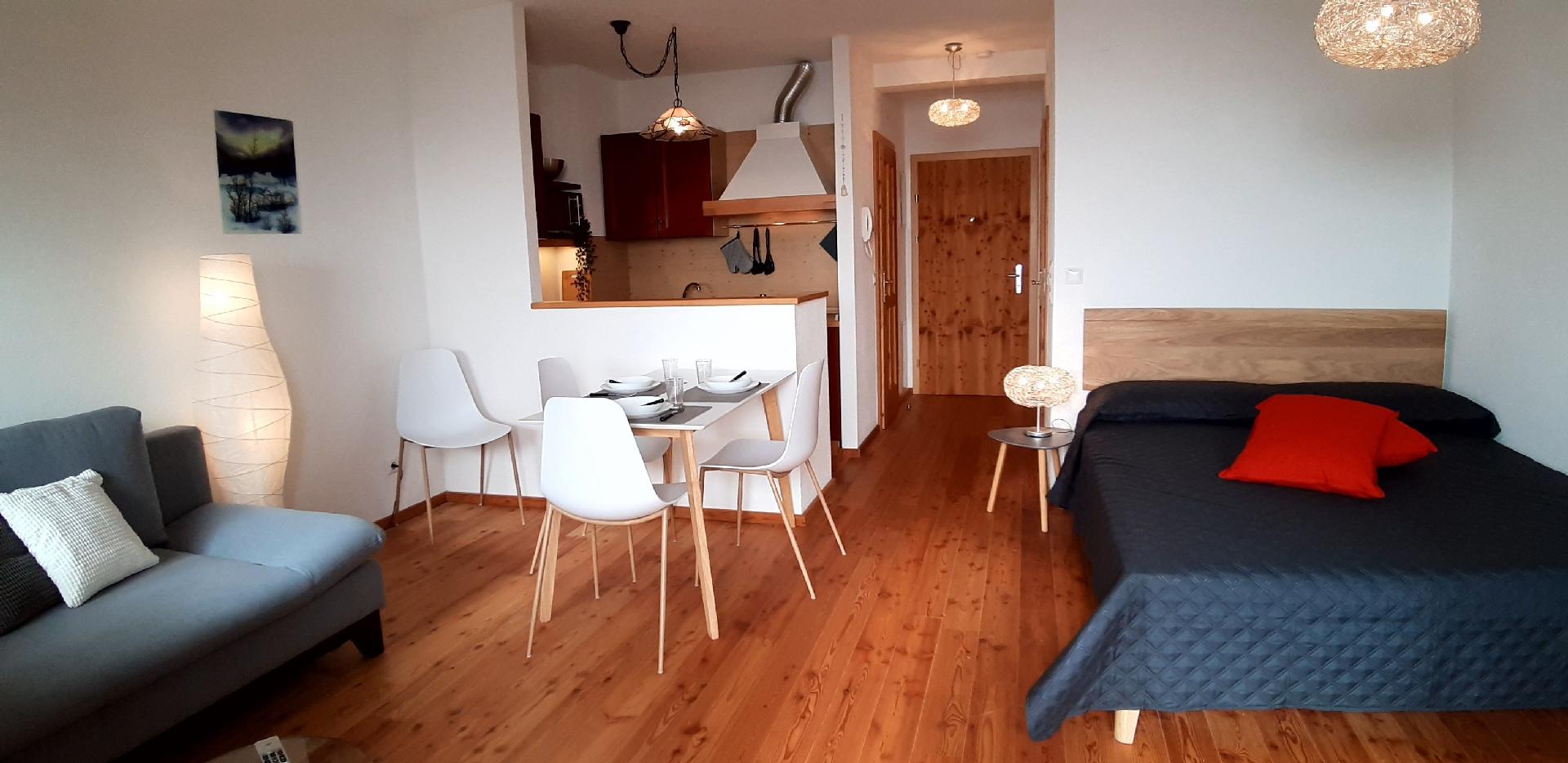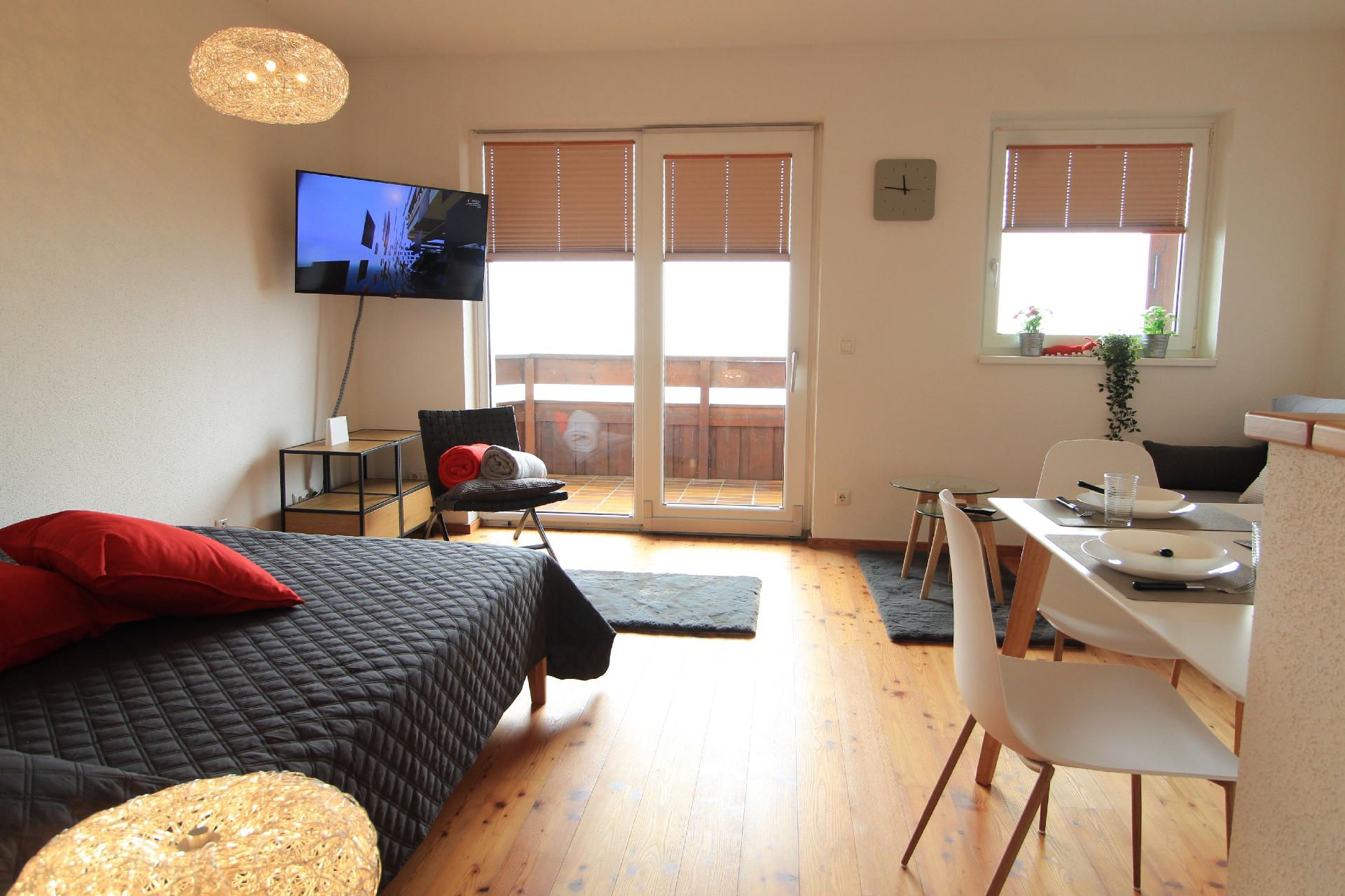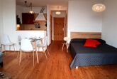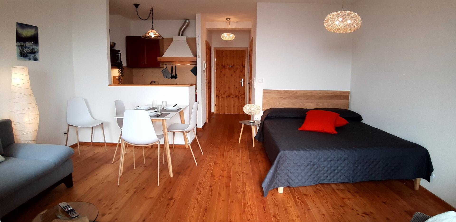 Im Inneren erwartet Sie eine geschmackvolle Einrichtung, die keine Wünsche offenlässt. Ein gemütliches Doppelbett und ein praktisches Doppelschlafsofa bieten reichlich Platz für Ihre Erholung. Die moderne Küche ist mit einem Backofen und einer Mikrowelle voll ausgestattet und lädt zum gemeinsamen Kochen und Verweilen ein. Für Ihren Komfort ist das Studio auch mit einem eleganten Badezimmer inklusive Dusche ausgestattet sowie mit einer Waschmaschine, für alle Fälle.