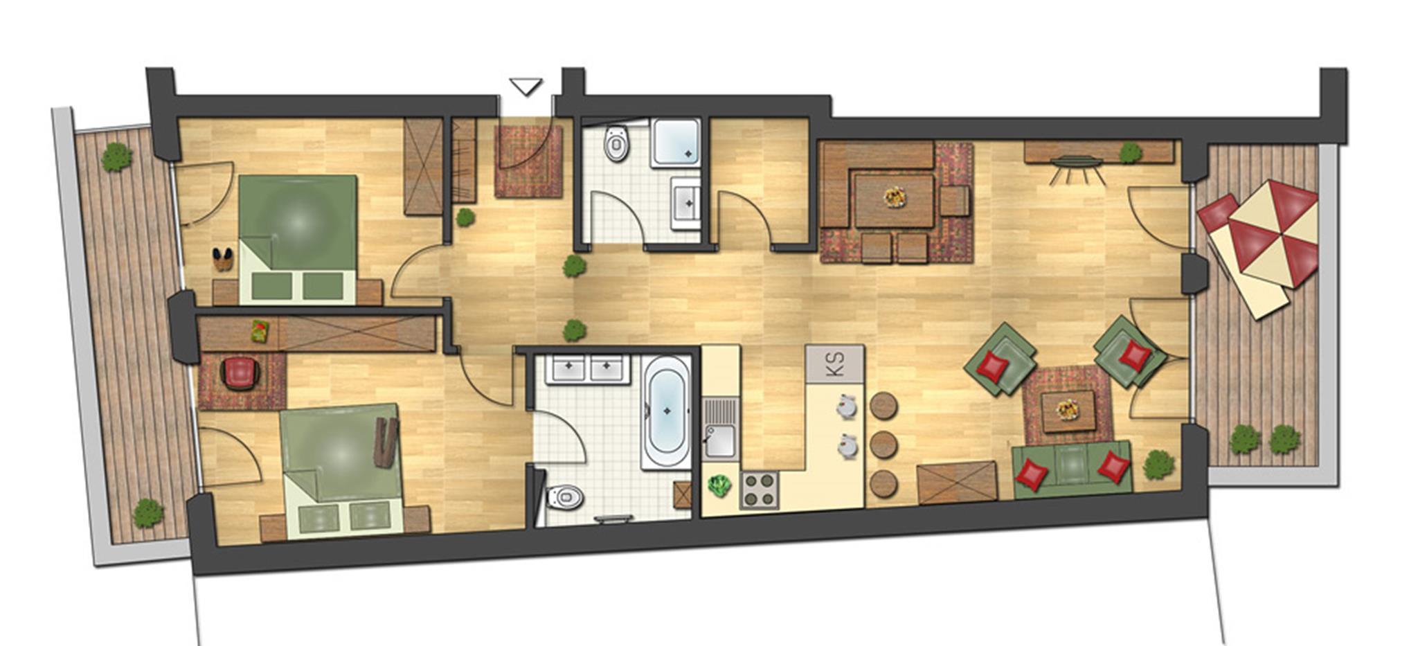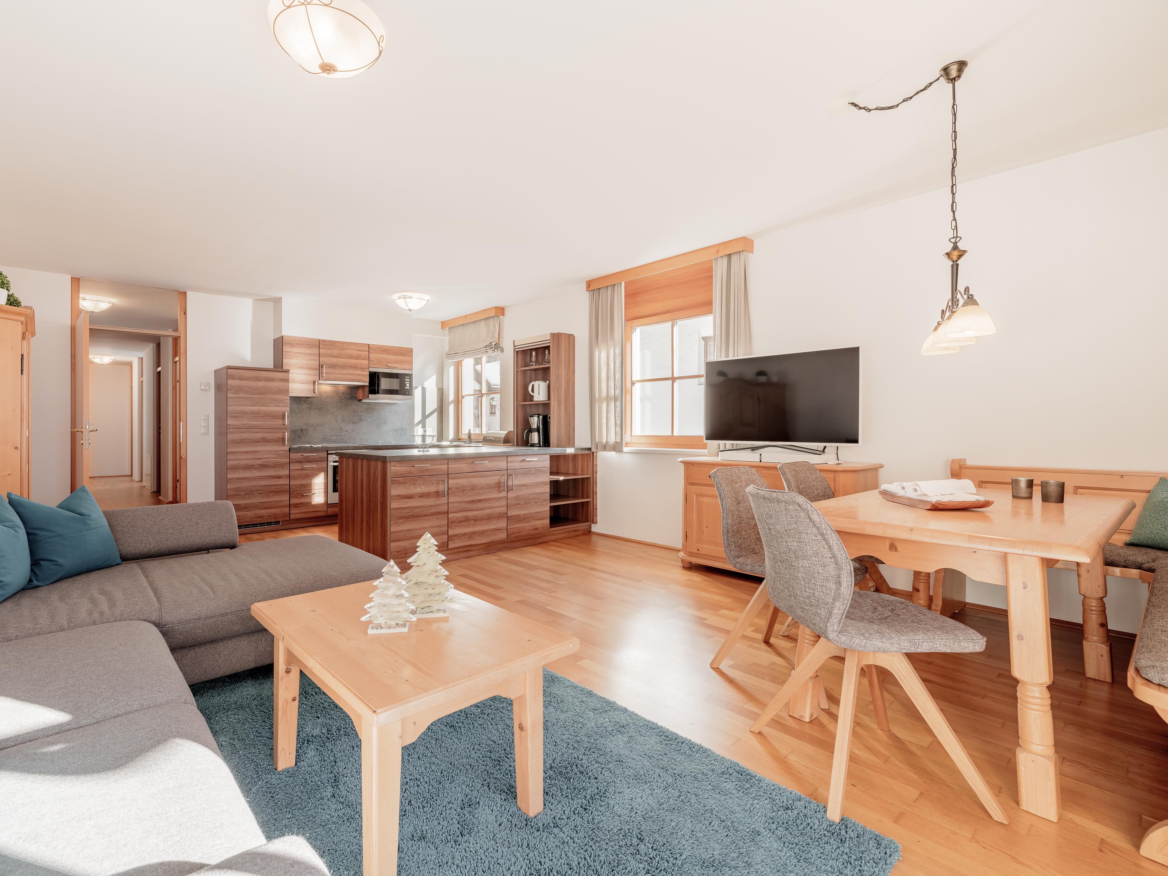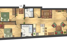 Top 6 mit ca. 88 m²: 2 Doppelzimmer; 1 Badezimmer mit Badewanne/WC; 1 Badezimmer mit Dusche/WC; 1 moderne Wohnküche mit Cerankochfeld, Geschirrspüler, Waschmaschine mit Trocknerfunktion, großzügiger Wohn-Essbereich, Sat-TV/Radio, DVD-Player, Balkon.
