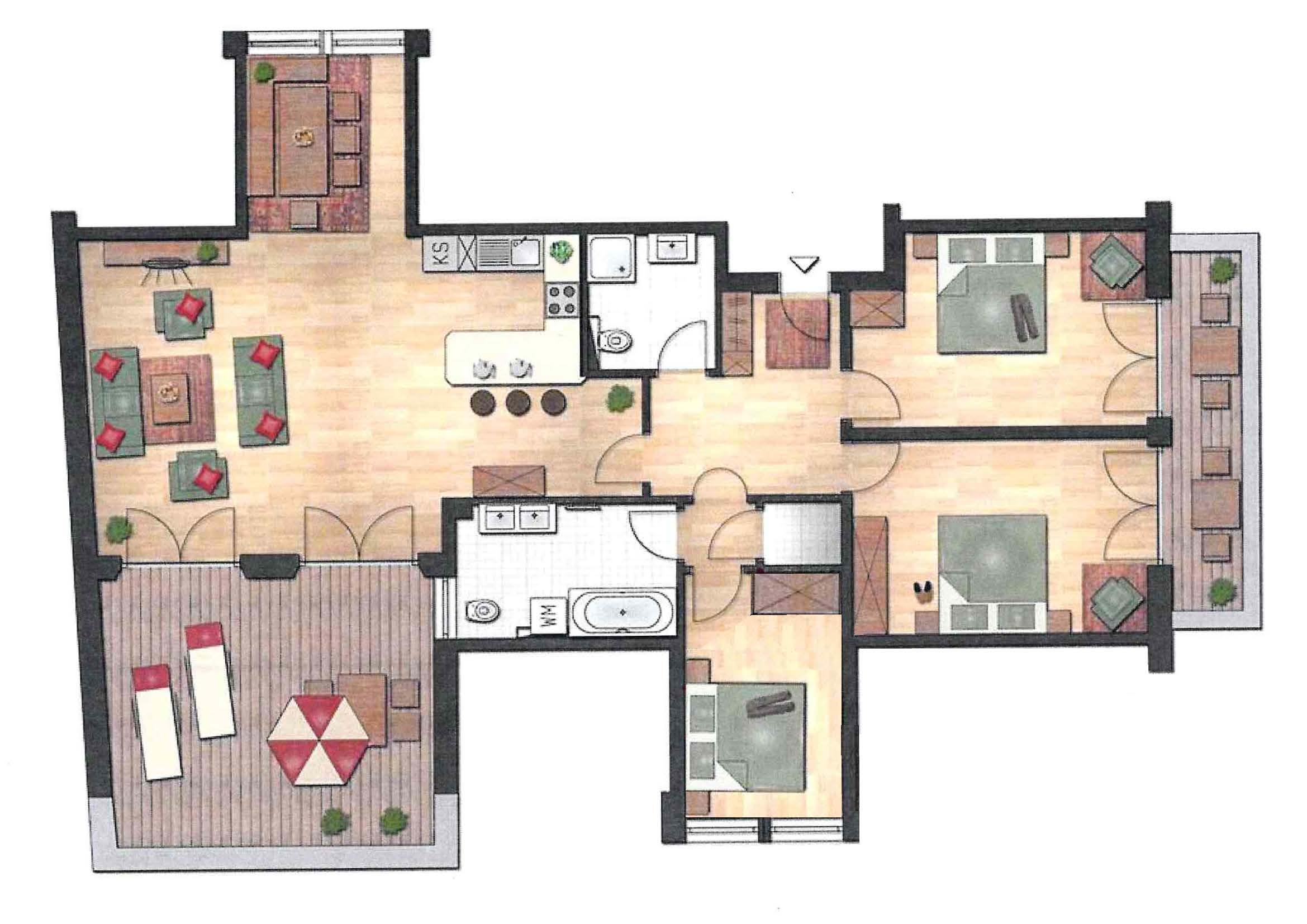 Top 7 mit ca. 120 m²: 3 Doppelzimmer; 1 Badezimmer mit Badewanne/WC; 1 Badezimmer mit Dusche/WC; 1 moderne Wohnküche mit Cerankochfeld, Backofen, Geschirrspüler, Waschmaschine mit Trocknerfunktion, großzügiger Wohn-Essbereich, Sat-TV/Radio, DVD-Player. Mit herrlicher Dachterrasse zum Sonnen.